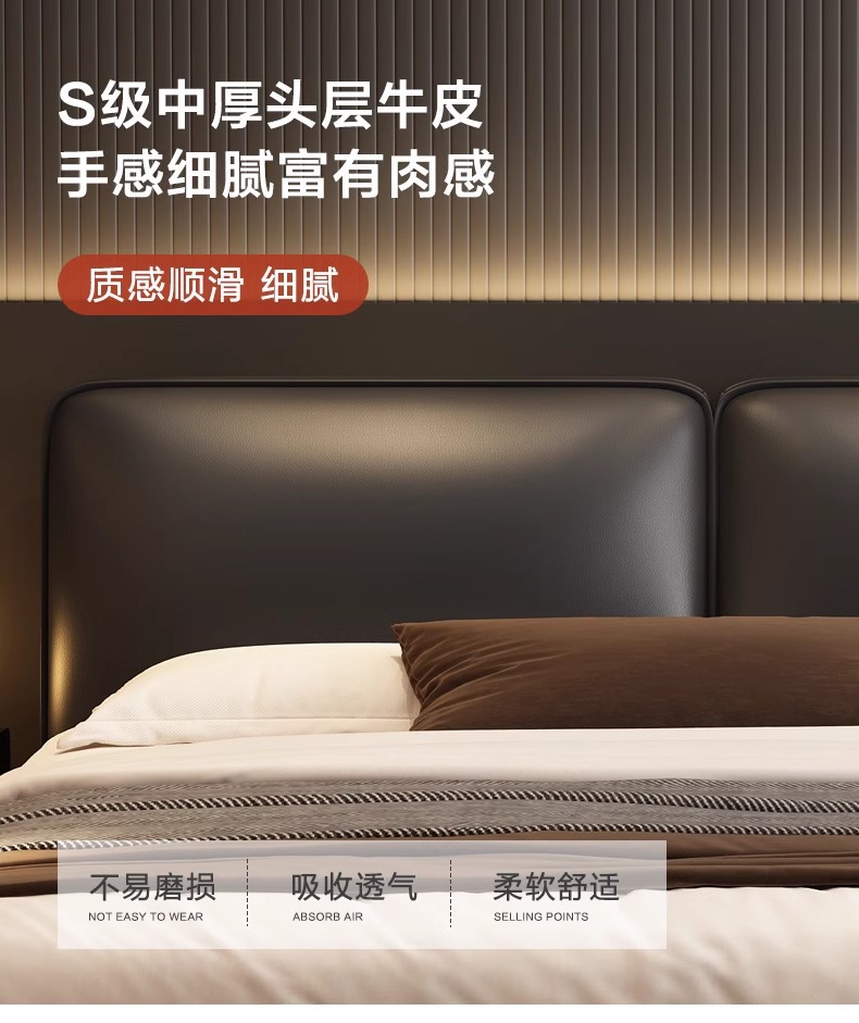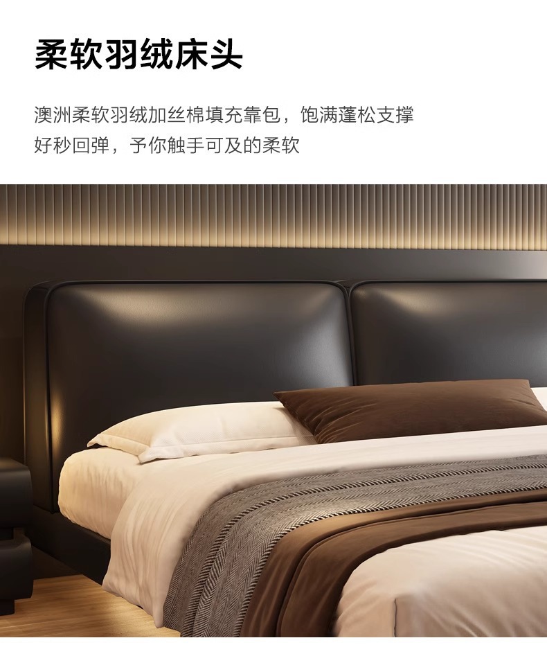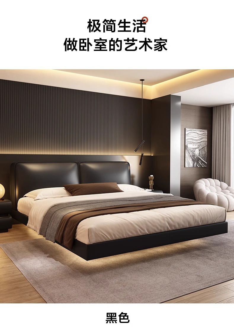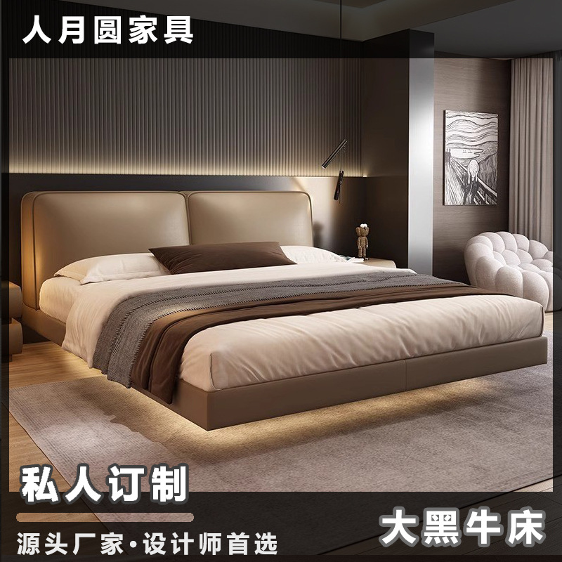 빅 블랙 소가죽 침대, 모던하고 심플한 풀 헤드 레이어 소가죽, 이탈리안 라이트 럭셔리 두부 블록, 서스펜션 마스터 침실 침대