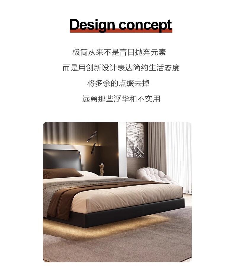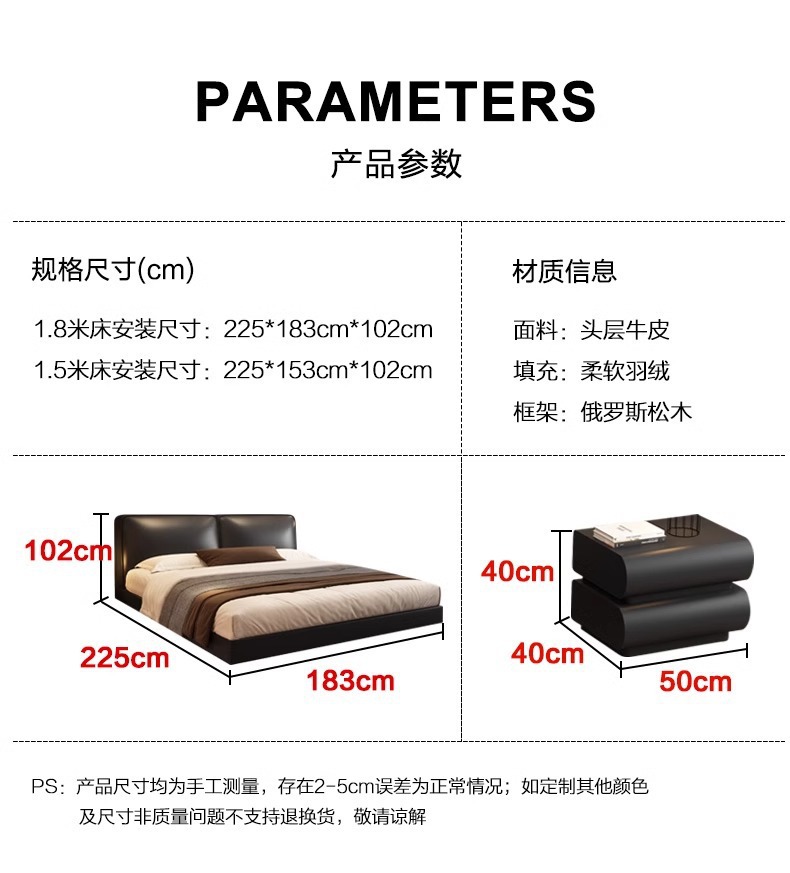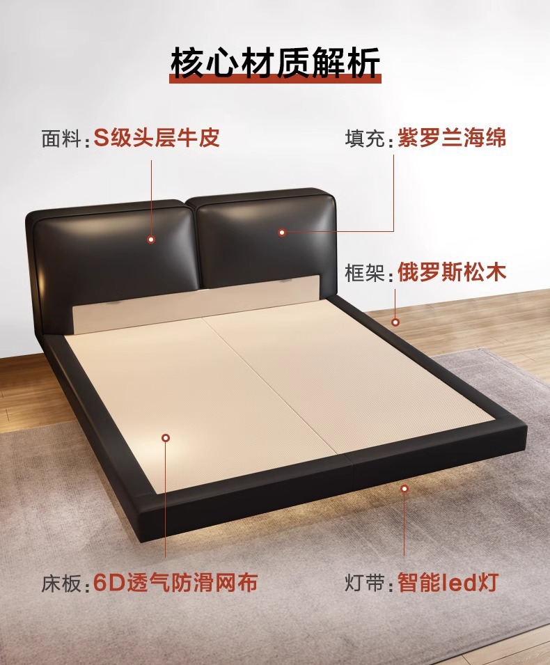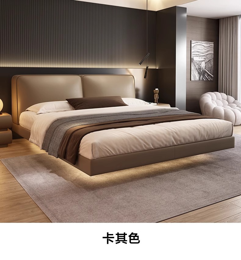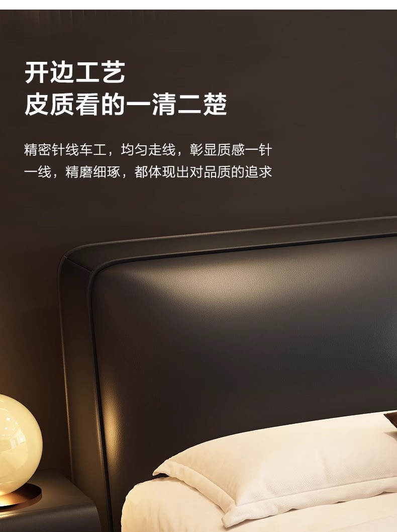 빅 블랙 소가죽 침대, 모던하고 심플한 풀 헤드 레이어 소가죽, 이탈리안 라이트 럭셔리 두부 블록, 서스펜션 마스터 침실 침대