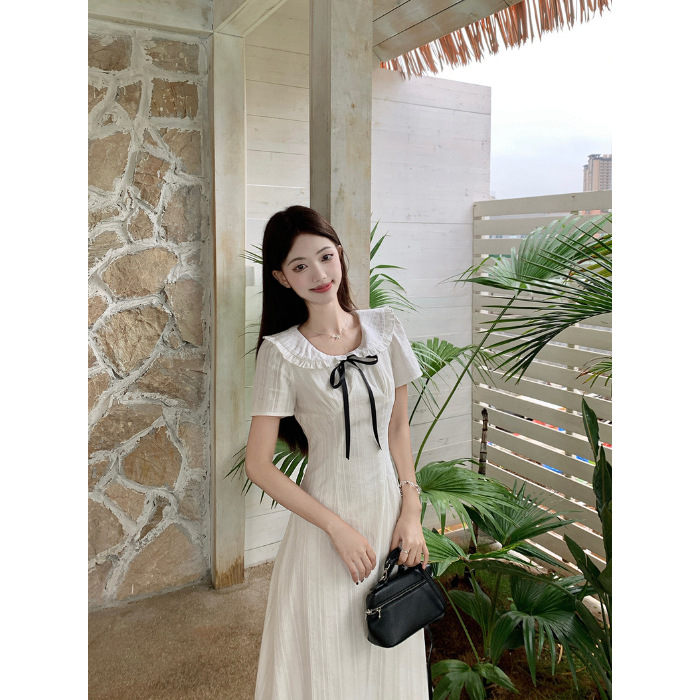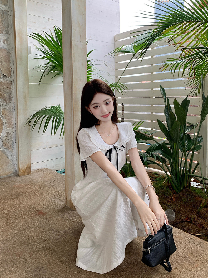 달콤한 스타일의 흰색 드레스 여름 새 스타일 인형 칼라 보우 허리 디자인 무릎 위 공주 드레스스토어 가기