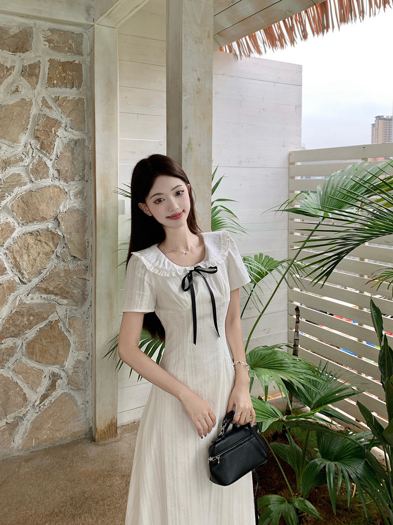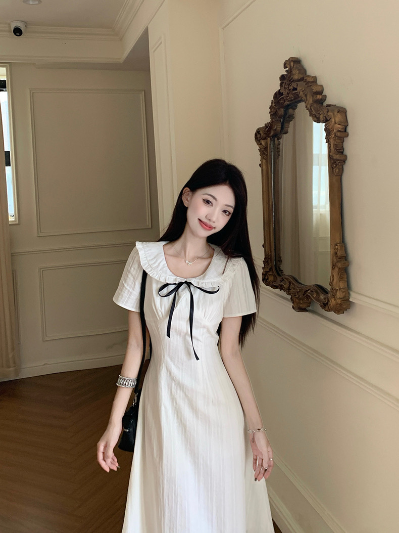 달콤한 스타일의 흰색 드레스 여름 새 스타일 인형 칼라 보우 허리 디자인 무릎 위 공주 드레스