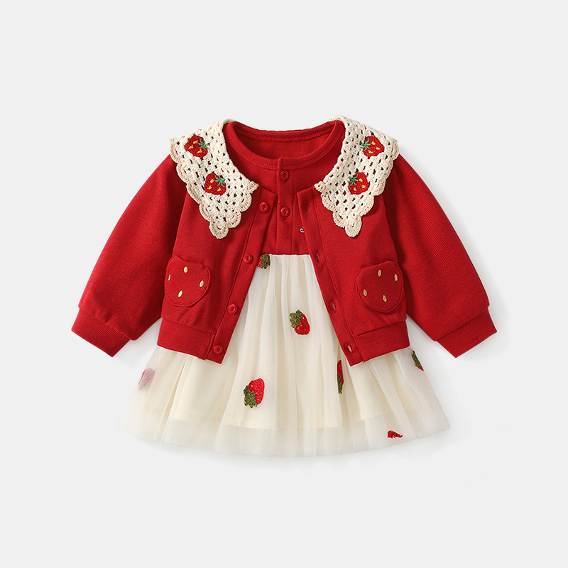 여아 정장 가을 새로운 한국 스타일 투피스 세트 아기 소녀 딸기 가디건과 딸기 거즈 스커트 아동복