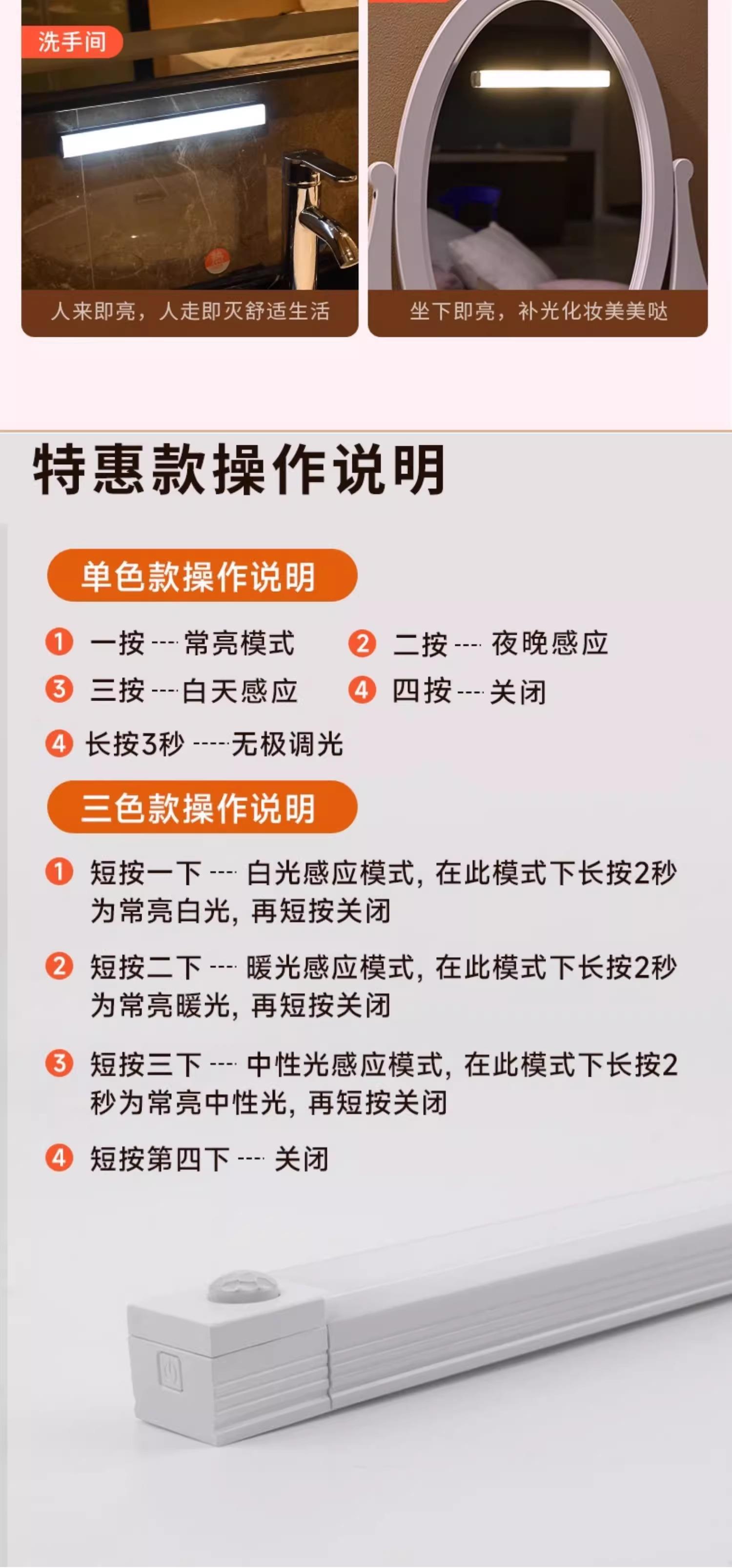• 100mm 따뜻한 빛 [인체 센서 + 충전 모델 + 조명 제어 + 항상 밝음 + 자기 인력]