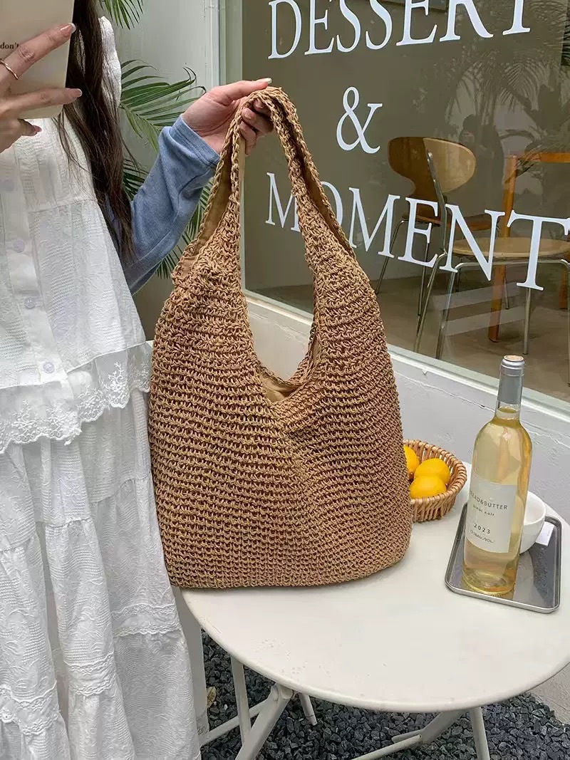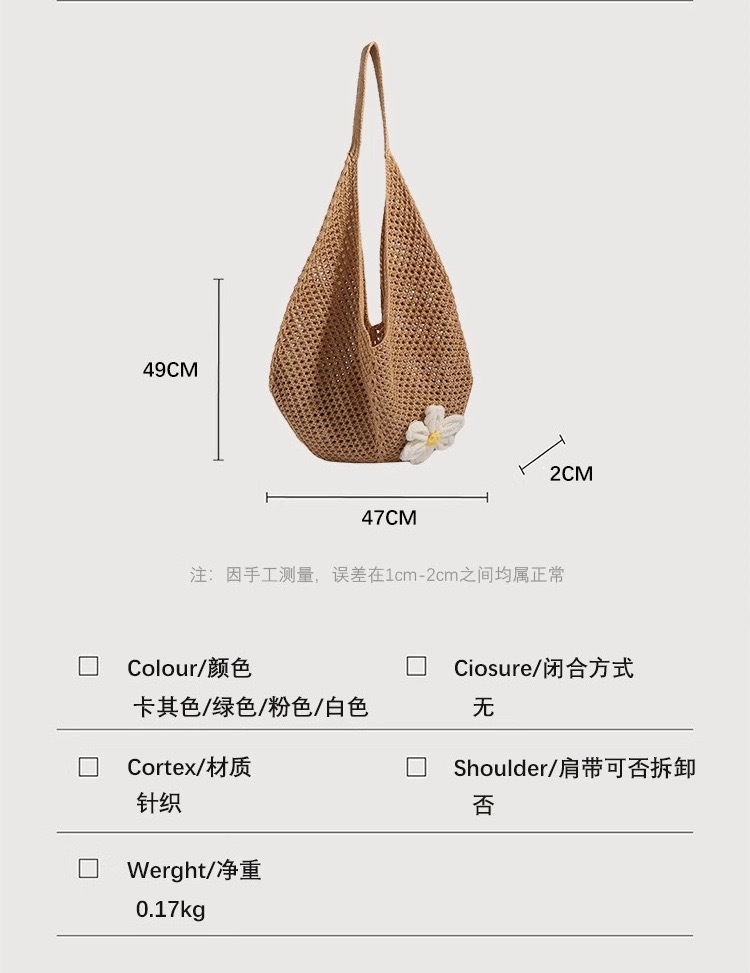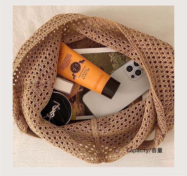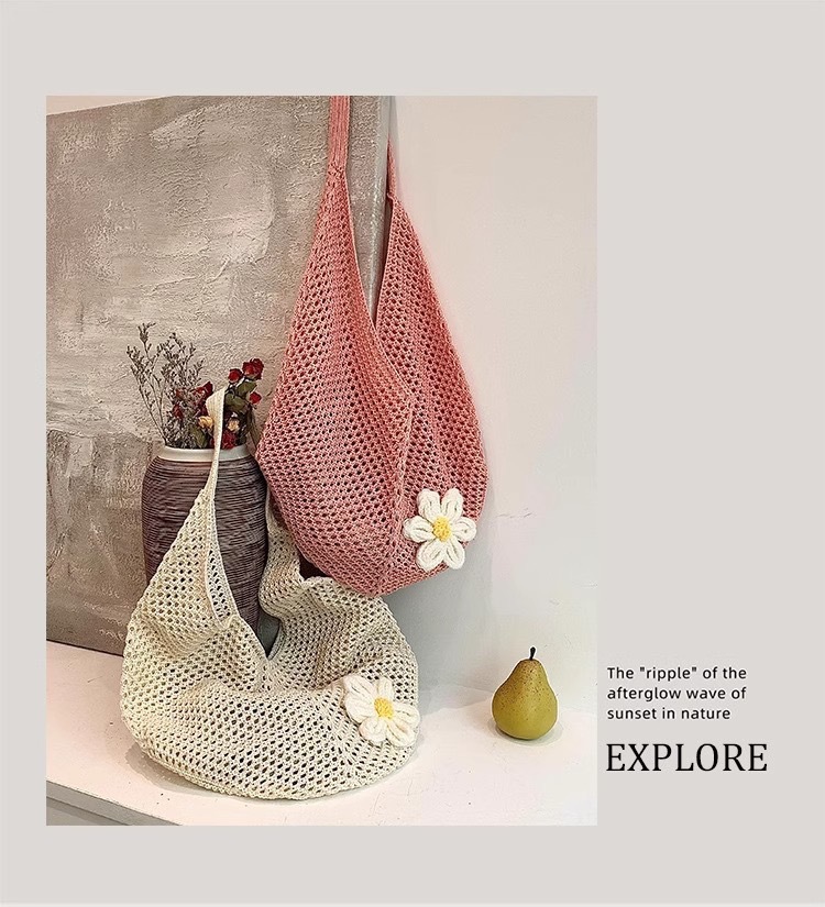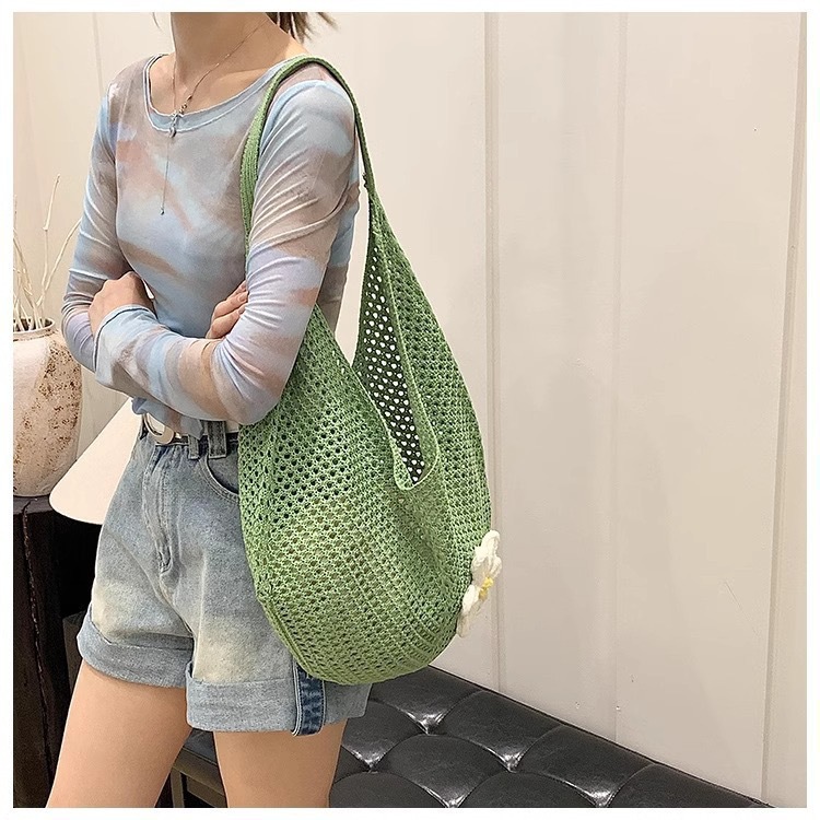 한국어 버전 2025 새로운 휴가 짠 가방 여성 숄더 토트 백 게으른 스타일 니트 중공 꽃 비치 가방스토어 가기