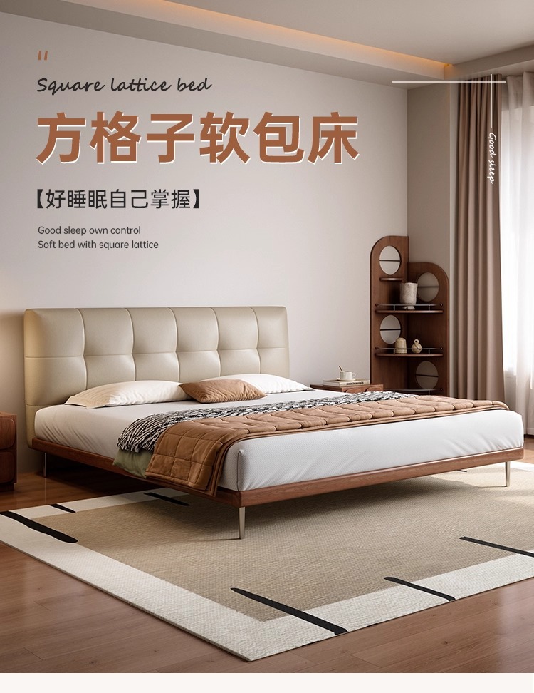 와플 패턴의 미드센추리 스타일 크림톤 천연가죽 침대, 작은 공간에도 적합한 화이트 애쉬 원목 마감, 1.8m 더블 침실용 천연가죽 침대