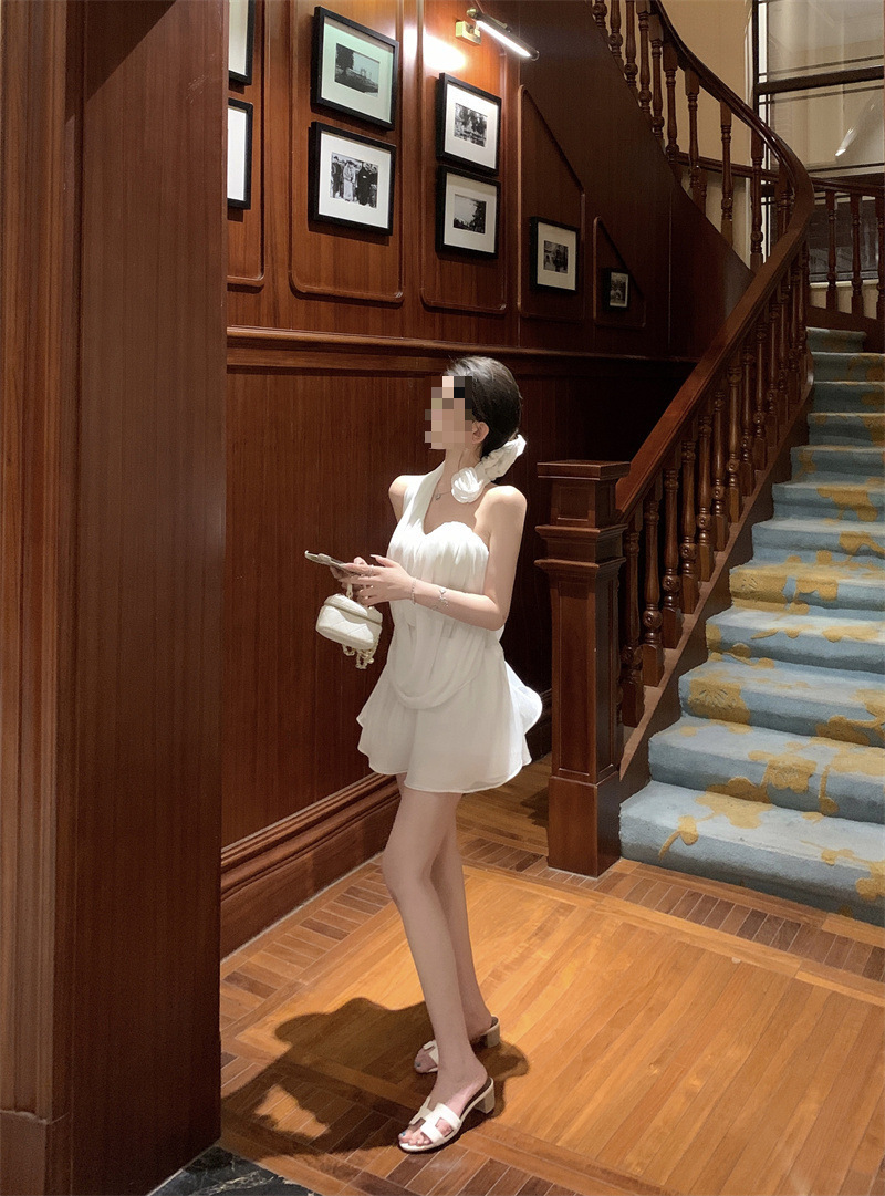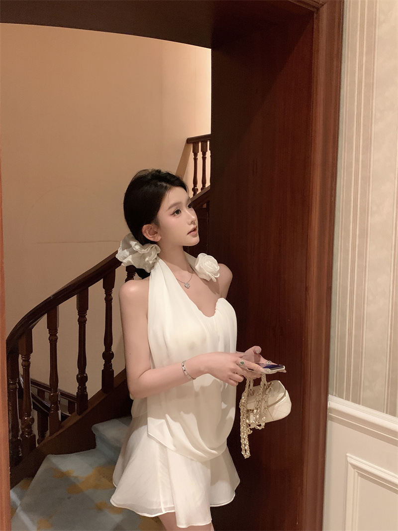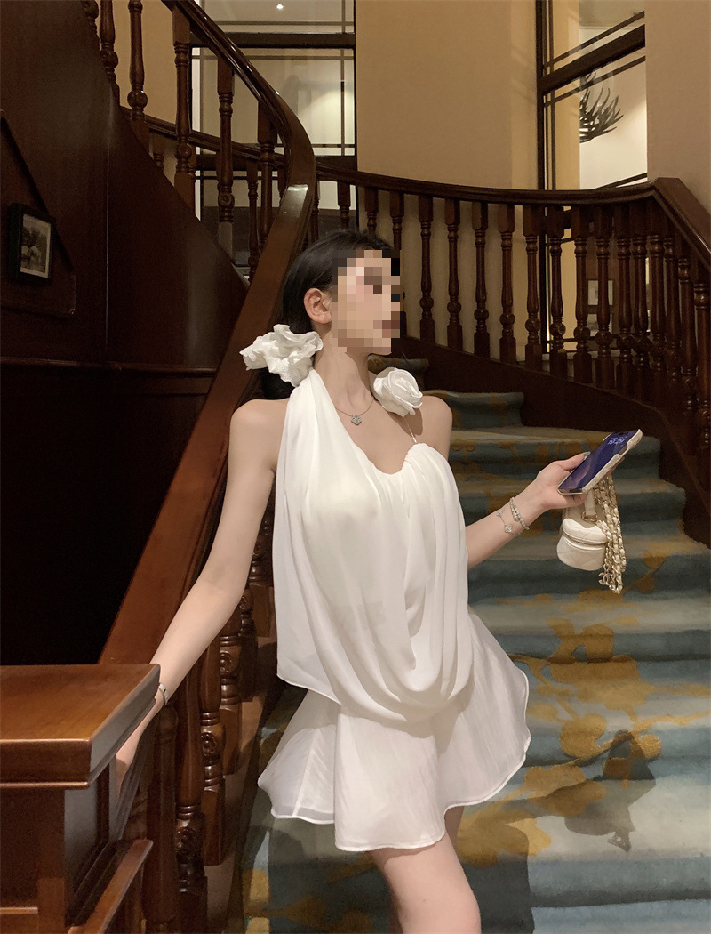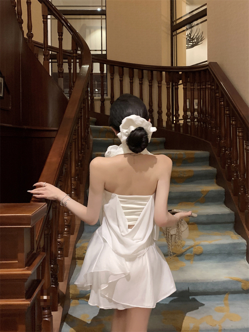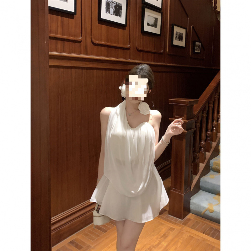 여름 여성을 위한 흰 꽃 핫걸 아름다운 등 홀터넥 조끼, 독특하고 멋진 양복, 하이웨이스트 스커트 투피스 세트