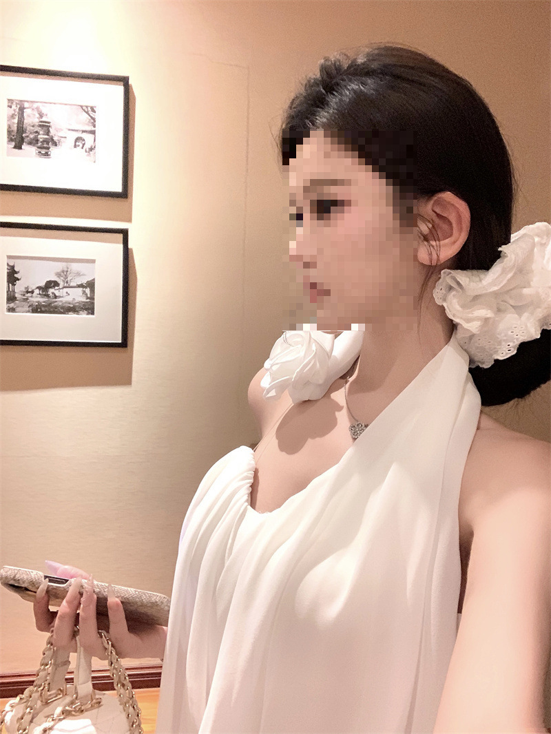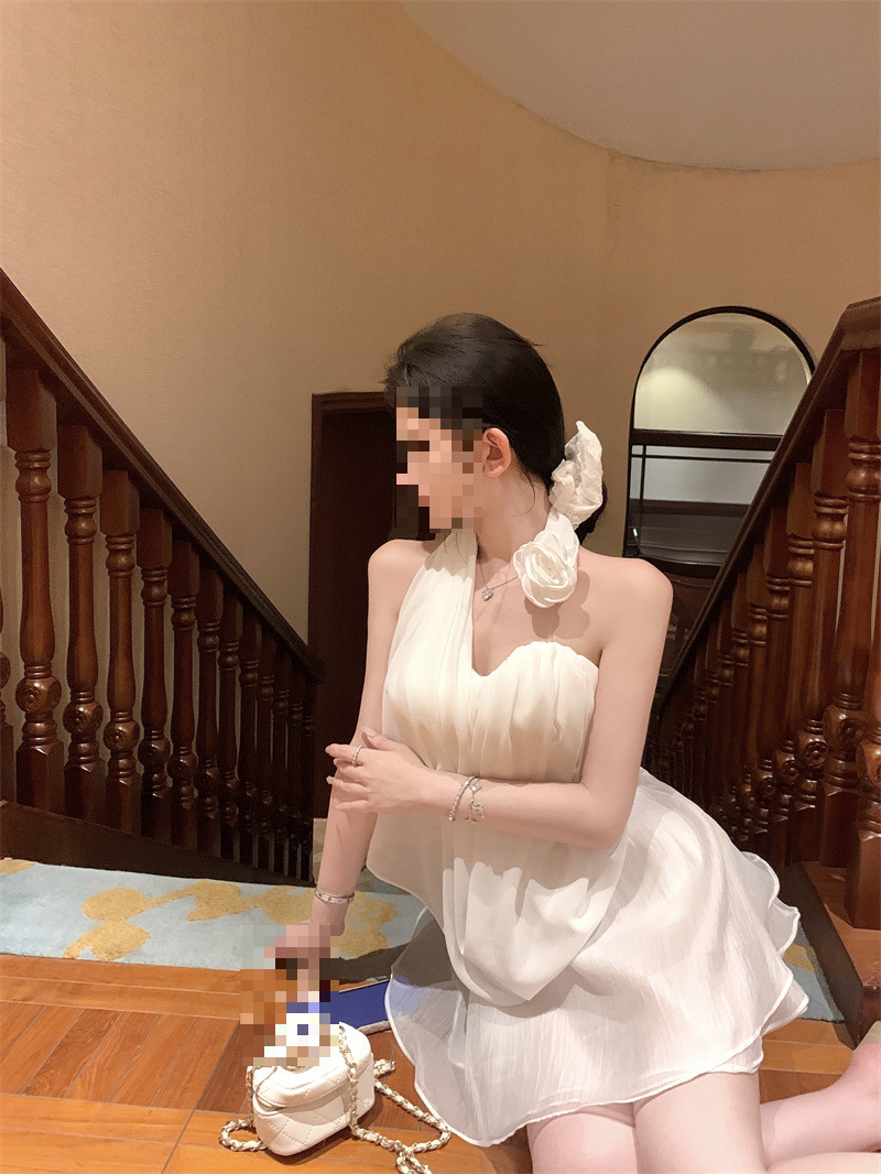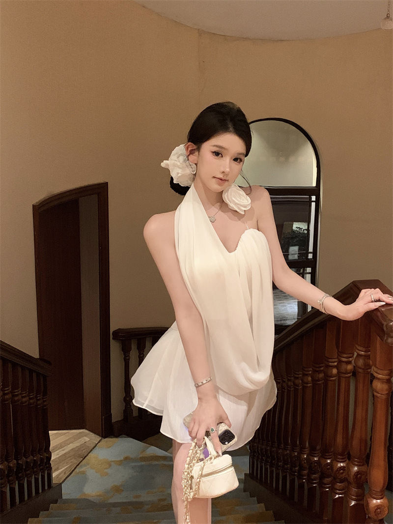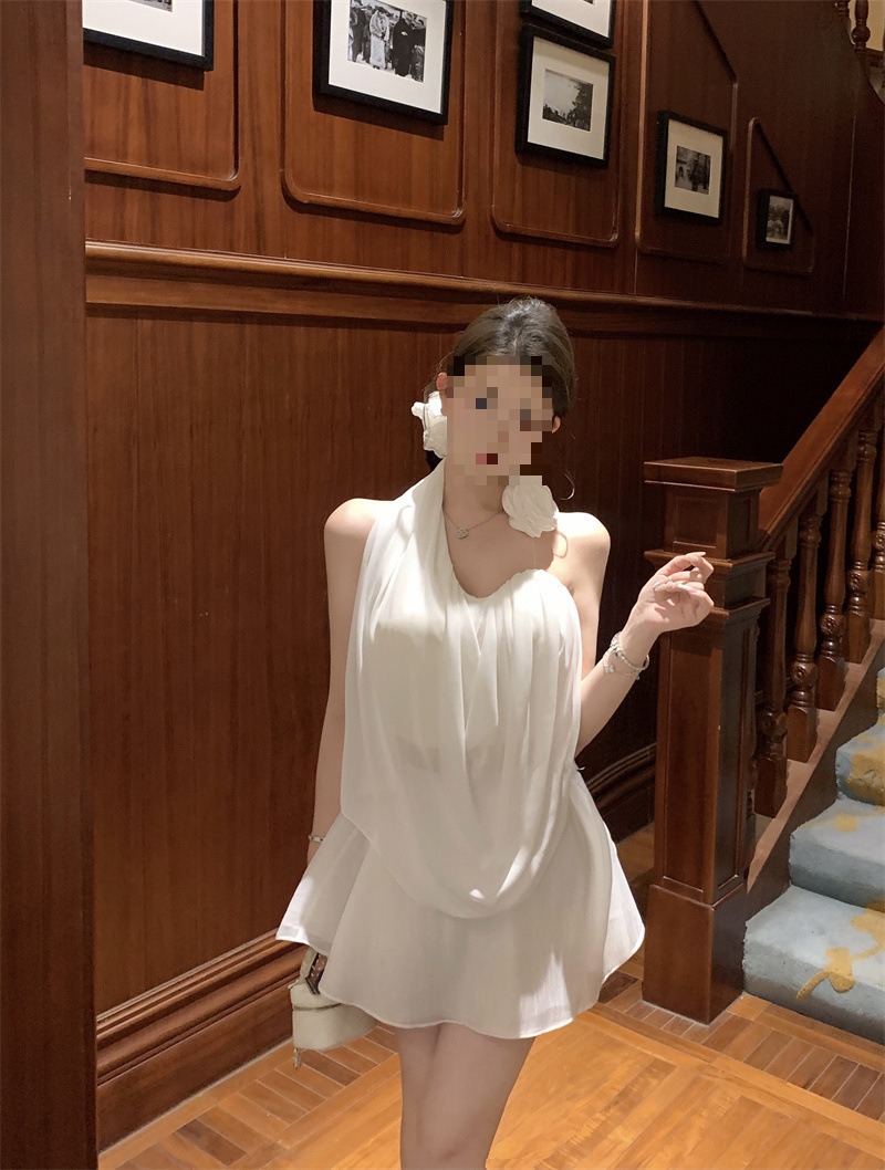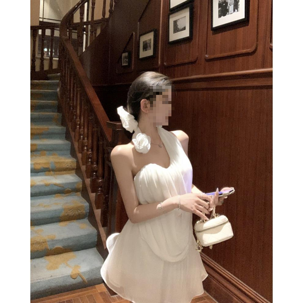 여름 여성을 위한 흰 꽃 핫걸 아름다운 등 홀터넥 조끼, 독특하고 멋진 양복, 하이웨이스트 스커트 투피스 세트