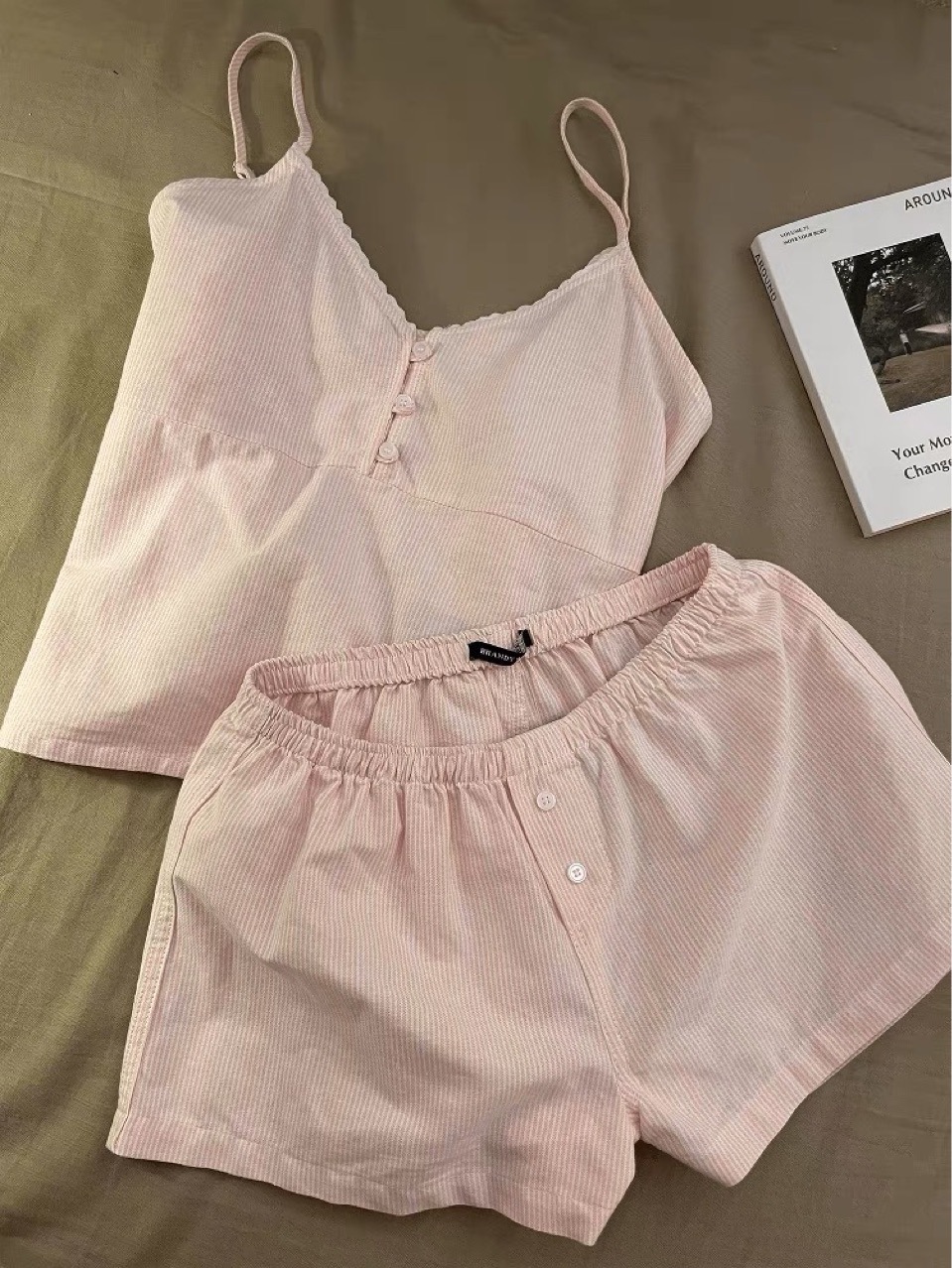 프랑스 달콤한 소녀 줄무늬 v 넥 서스펜더 잠옷 여성 여름 슬림 조끼 반바지 홈웨어 세트
