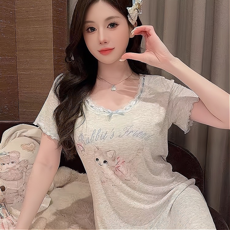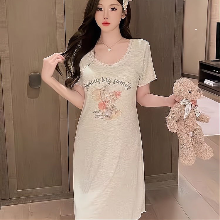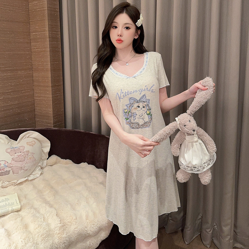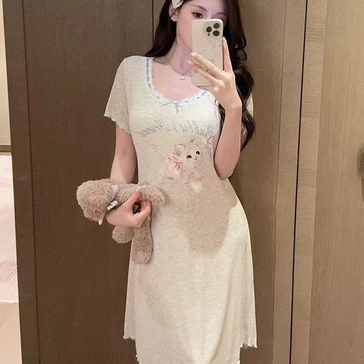 외부 착용이 가능한 가슴 패드가 있는 잠옷, 만화 고양이 프린트 반팔 잠옷, 여성용 여름 가볍고 루즈한 드레스, 홈웨어스토어 가기