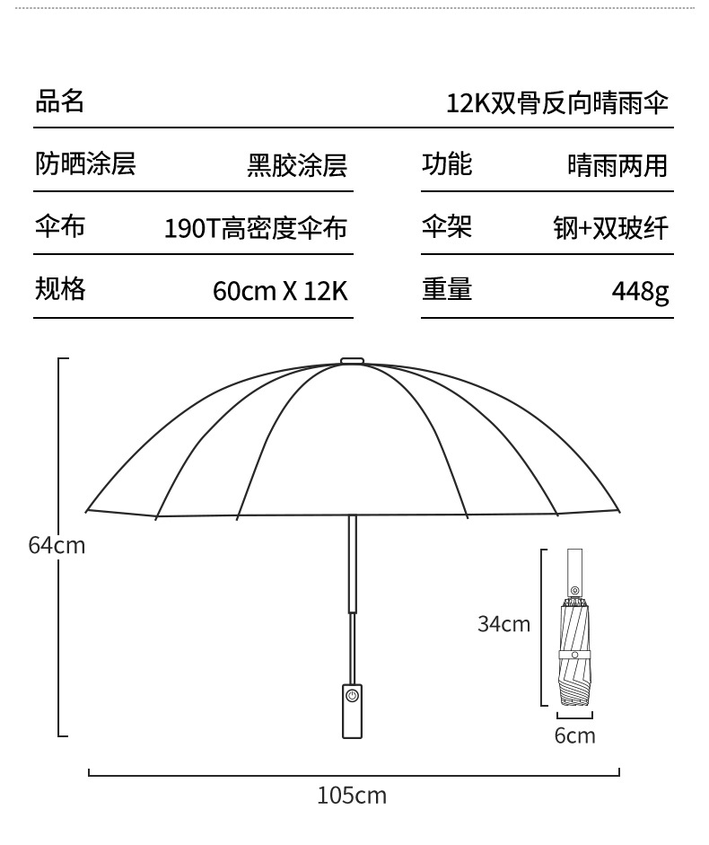 • 원클릭 개폐 [비가 오나 눈이 오나] 방풍 및 단열 [샤오미 자동차에 적용 가능] [특수 차량용 휴대용 12본] 리버스 흑요석 블랙