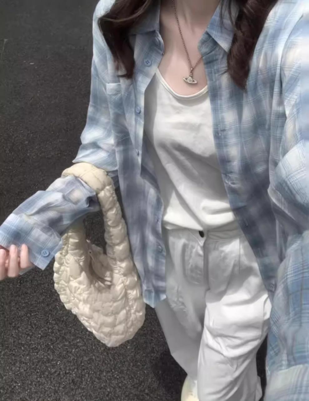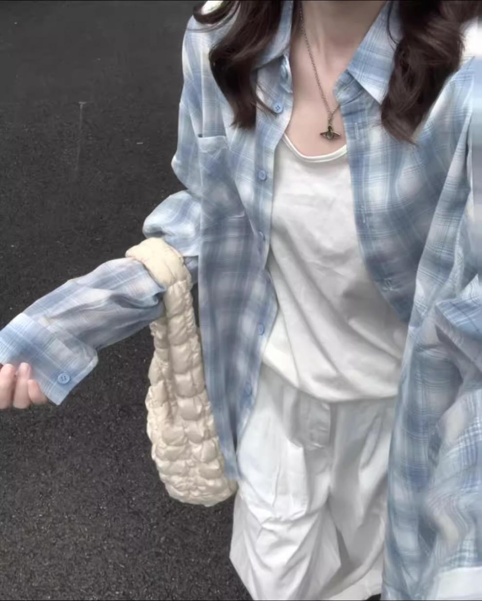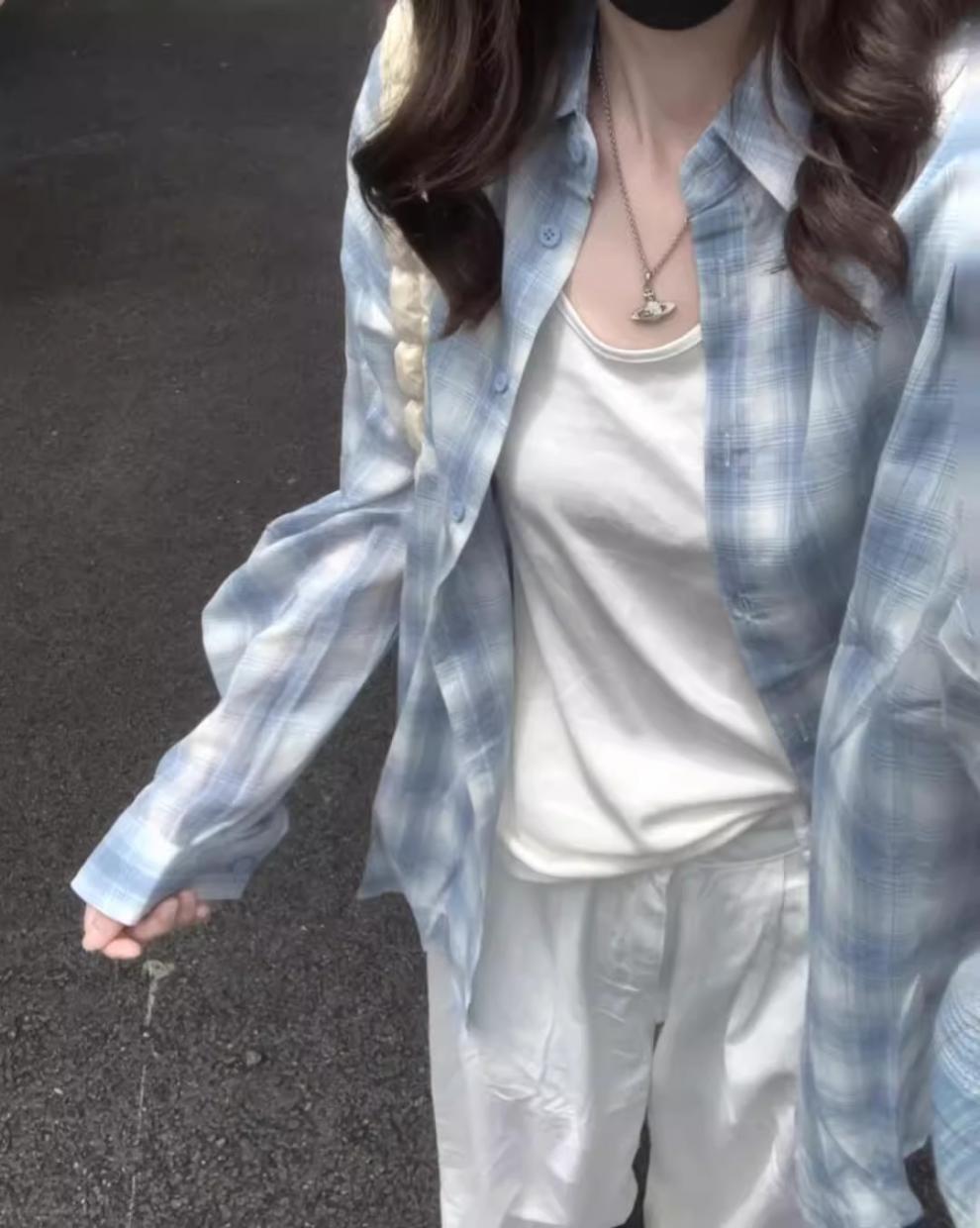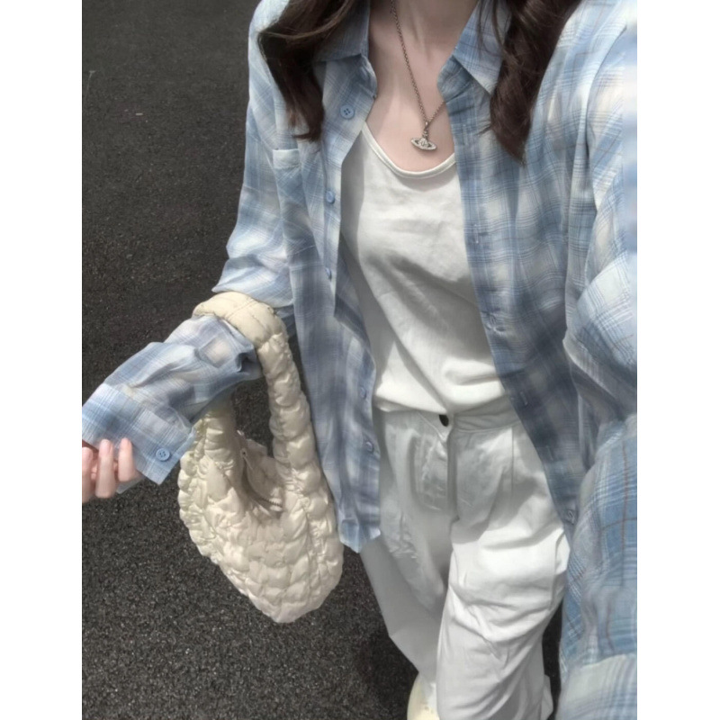 여성을위한 한국 격자 무늬 셔츠 봄과 여름 새로운 느슨한 게으른 스타일 긴팔 셔츠 재킷 캐주얼 자외선 차단 셔츠 탑스토어 가기