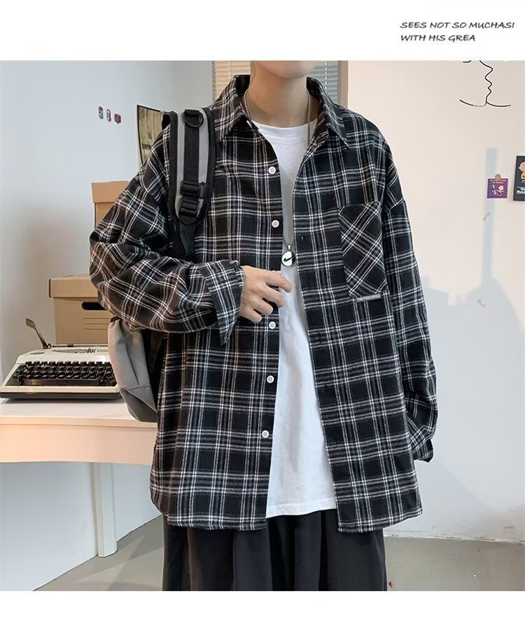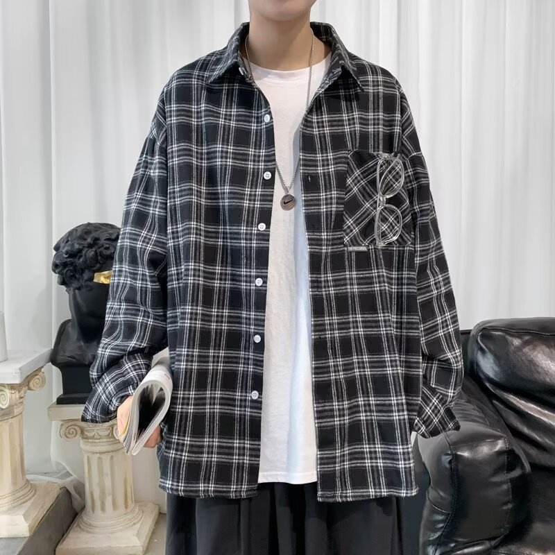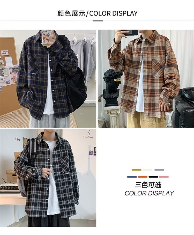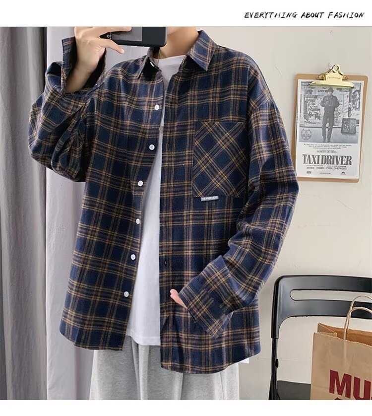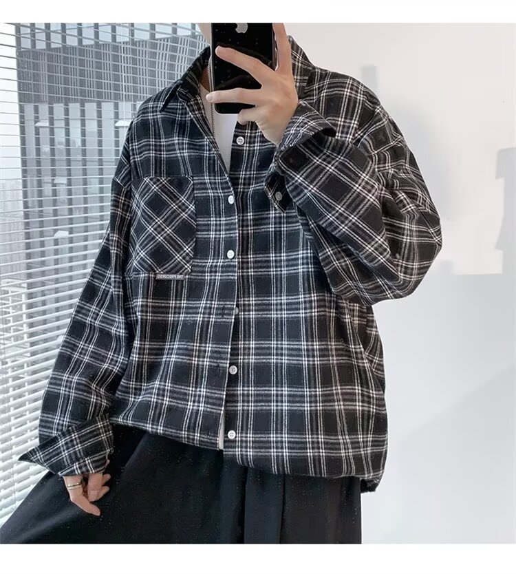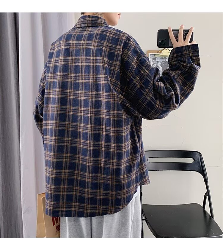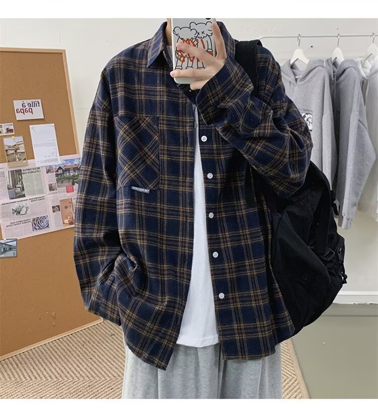 봄과 가을 남성용 미국 격자 무늬 긴팔 셔츠 느슨한 한국 스타일 유행 캐주얼 복고풍 겉옷 기모 느슨한 셔츠 도매스토어 가기