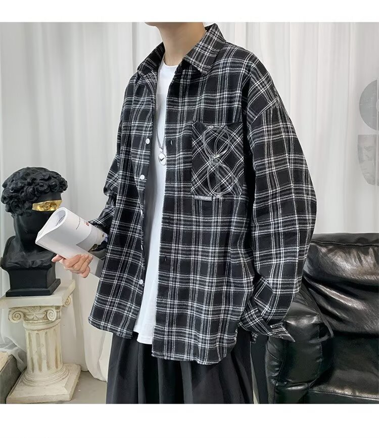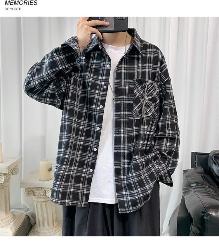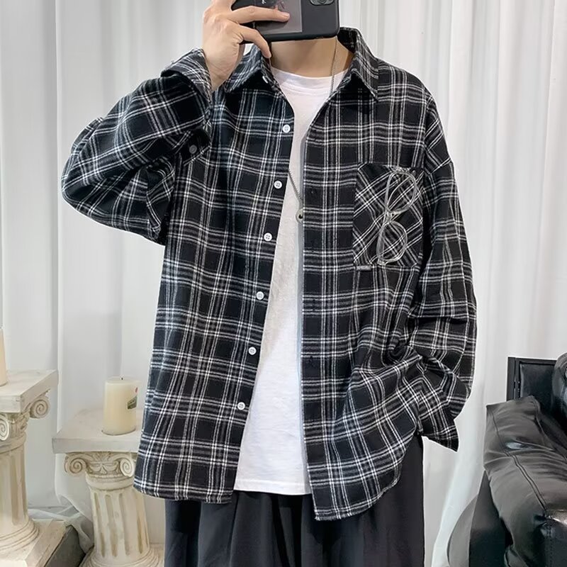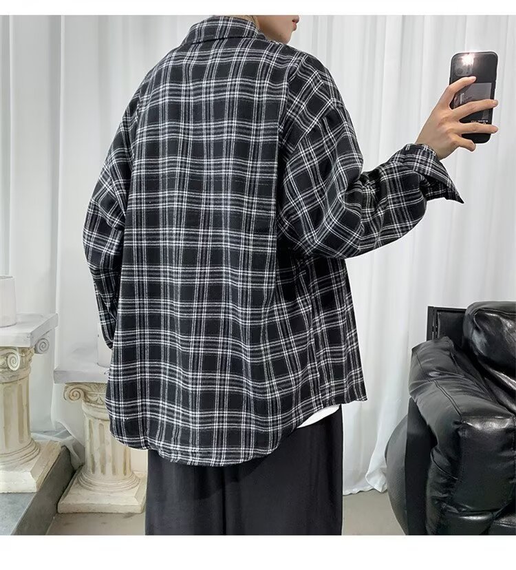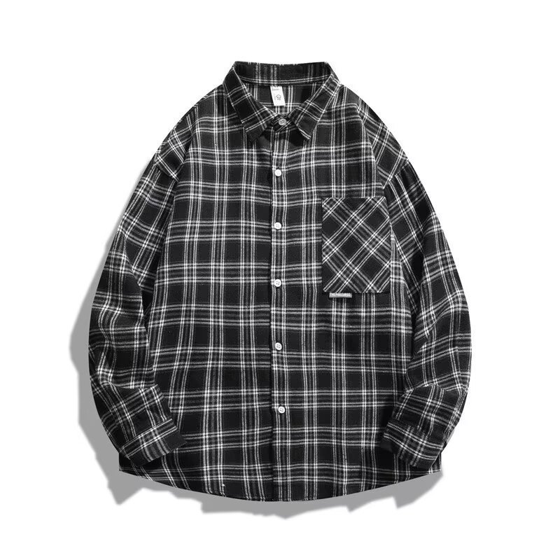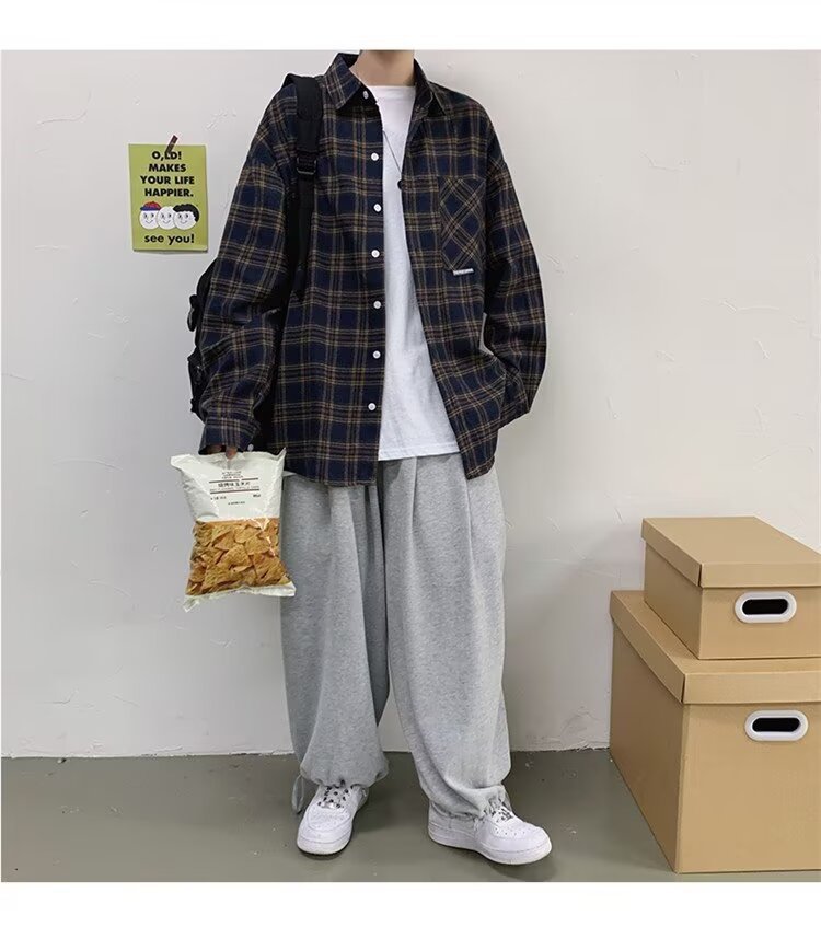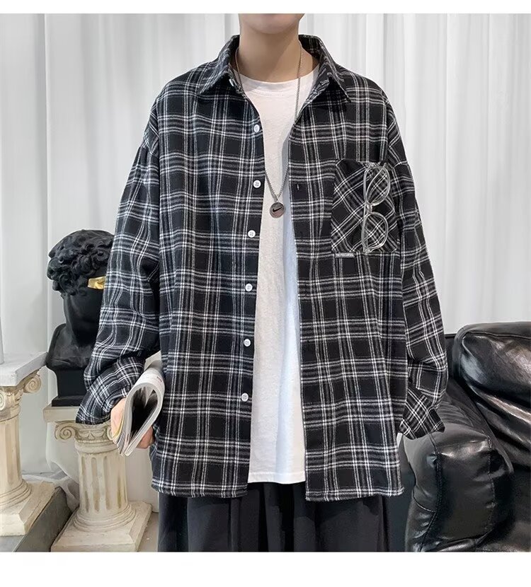 봄과 가을 남성용 미국 격자 무늬 긴팔 셔츠 느슨한 한국 스타일 유행 캐주얼 복고풍 겉옷 기모 느슨한 셔츠 도매스토어 가기