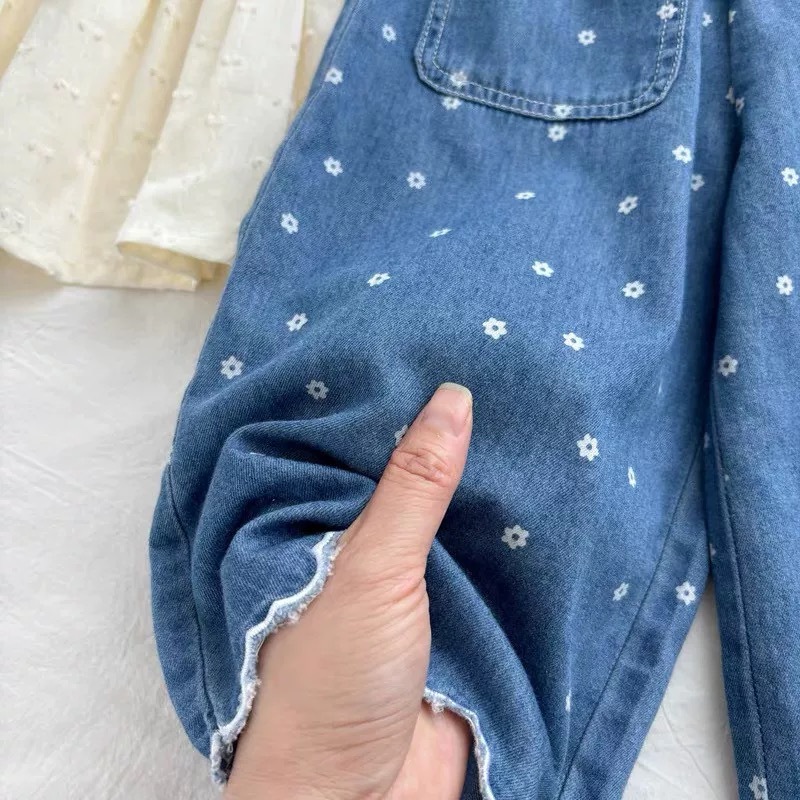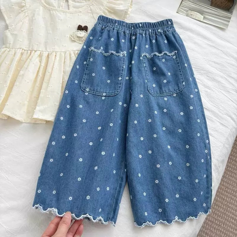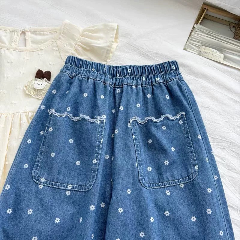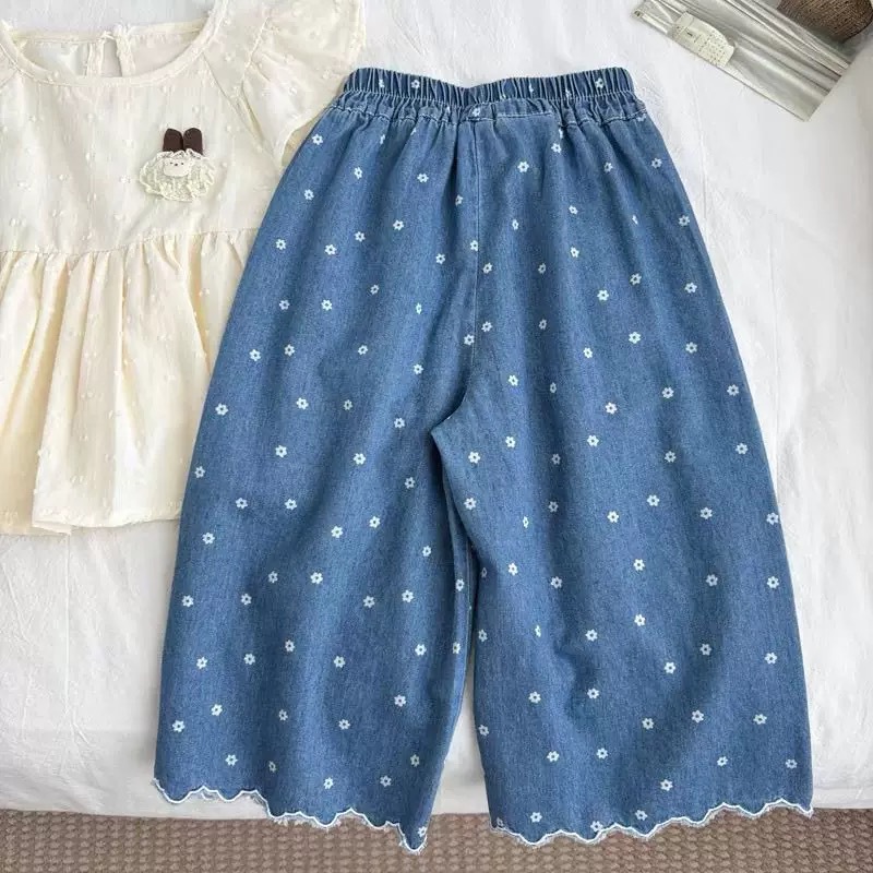 여자 레이스 얇은 9 점 청바지 2025 여름 새 스타일 아기 소녀 얼음 실크 얇은 작은 꽃 와이드 레그 바지스토어 가기