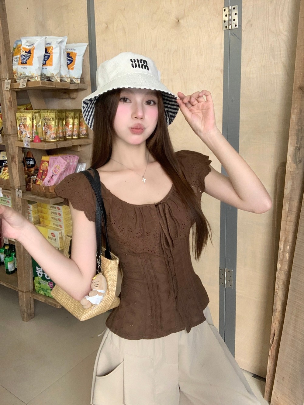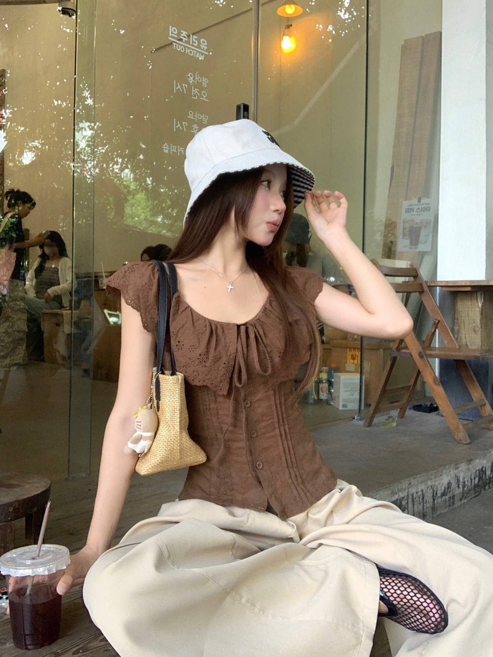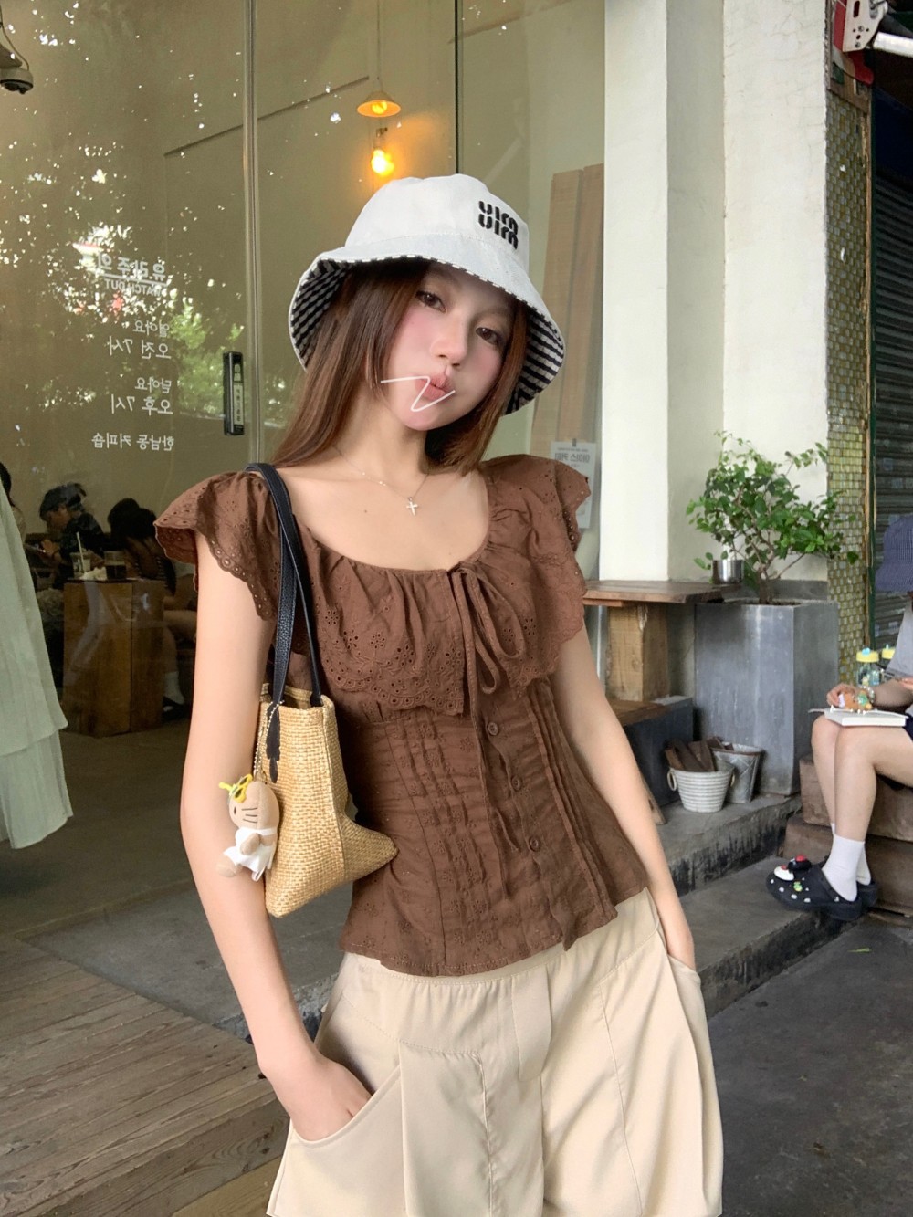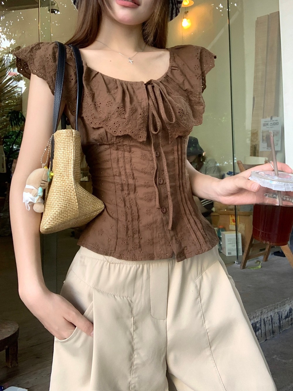 프렌치 스타일의 순수한 욕망 스타일의 러플 중공 민소매 셔츠 여름 신상품 허리 커버 및 슬리밍 브라운 탑의 실제 사진스토어 가기