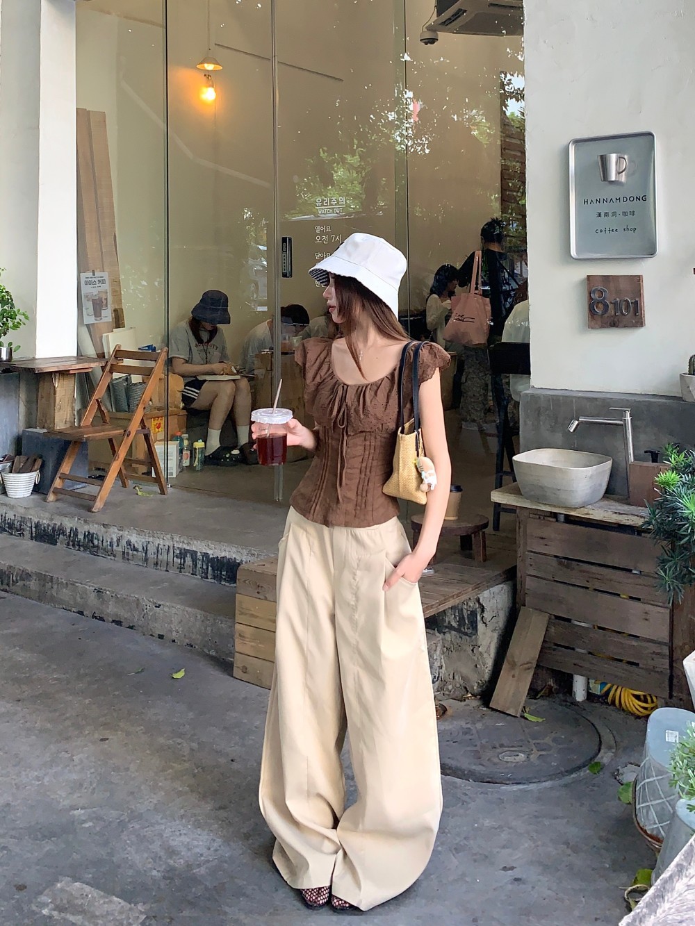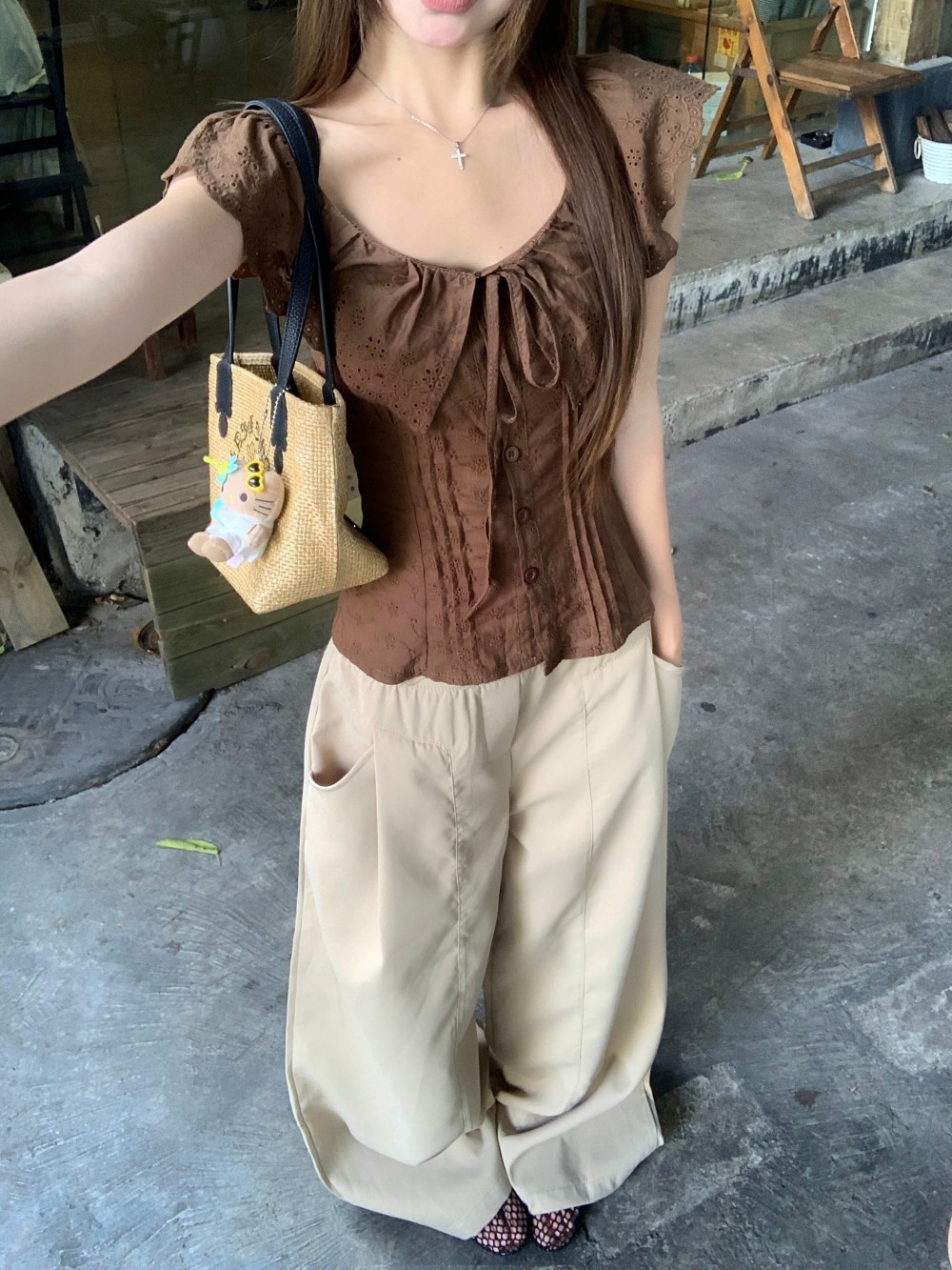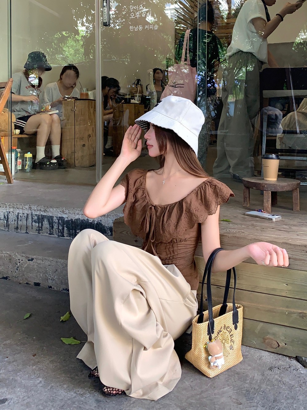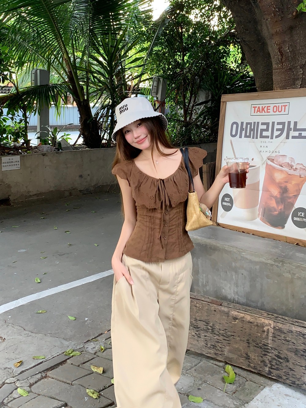 프렌치 스타일의 순수한 욕망 스타일의 러플 중공 민소매 셔츠 여름 신상품 허리 커버 및 슬리밍 브라운 탑의 실제 사진스토어 가기