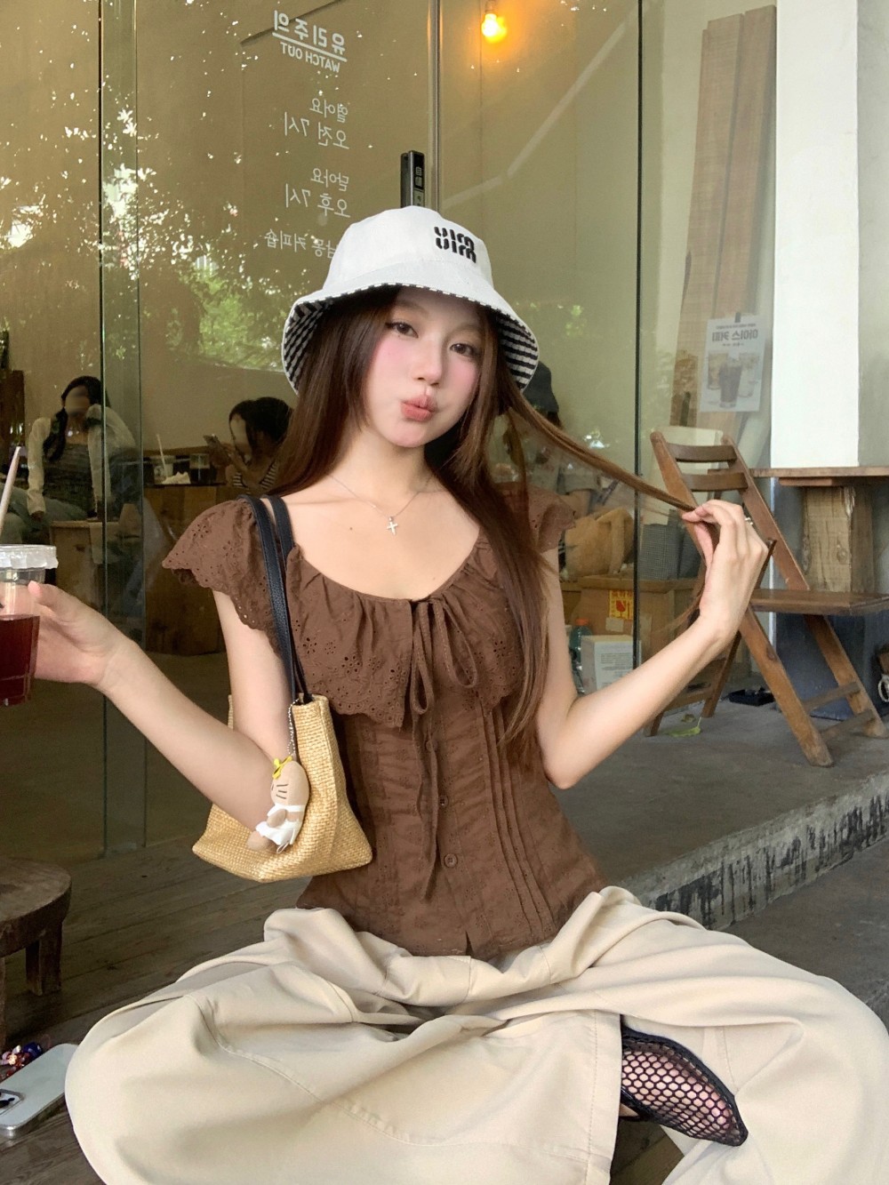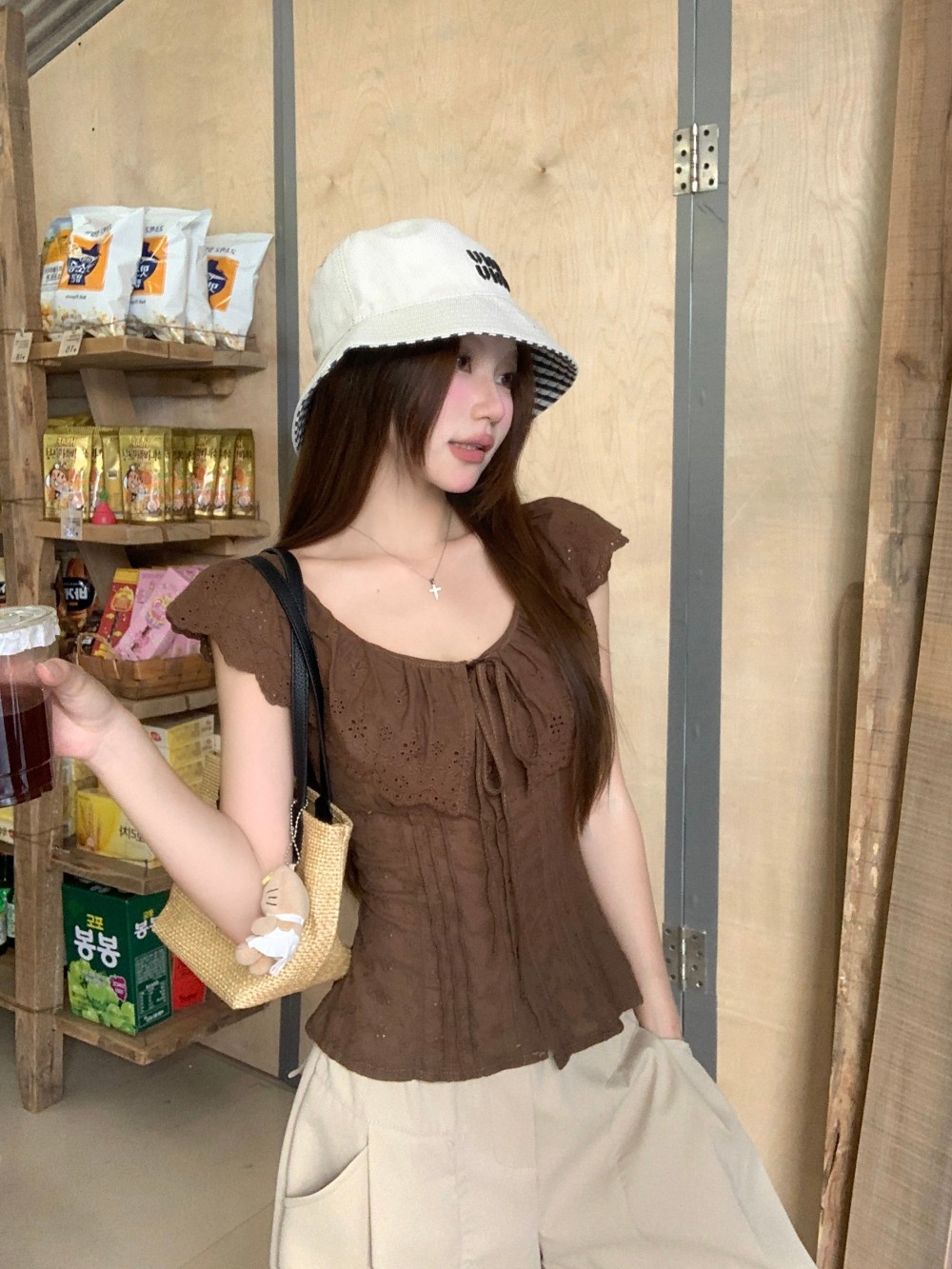 프렌치 스타일의 순수한 욕망 스타일의 러플 중공 민소매 셔츠 여름 신상품 허리 커버 및 슬리밍 브라운 탑의 실제 사진