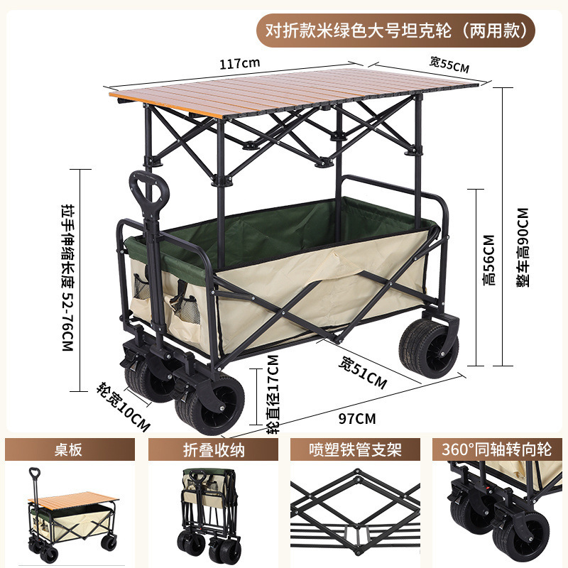 • 캠프카 + 접이식 테이블 - 브레이크가 장착된 대형 탱크 휠(카키색) ✦ ✦