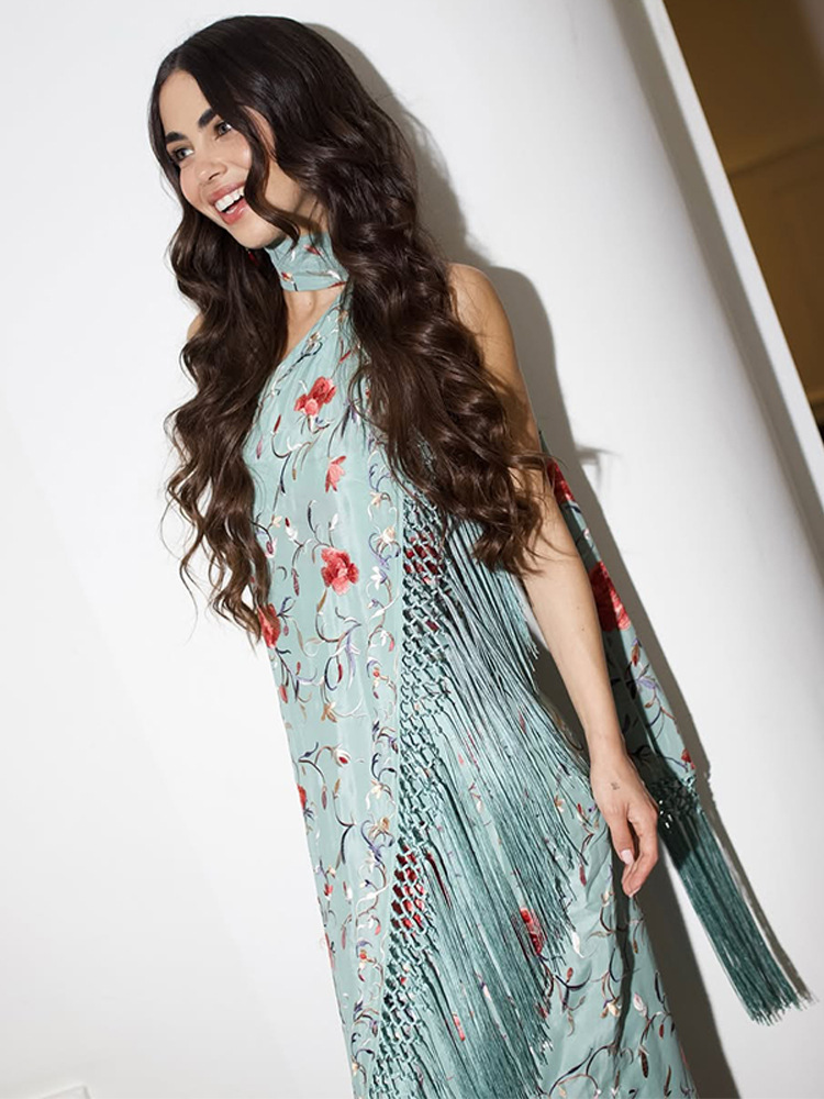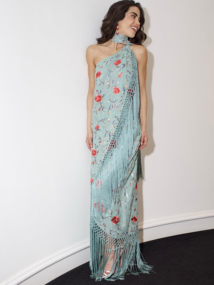 한국 디자인 프린트 태슬 숄 비대칭 홀터넥 드레스 2025 여름 신작 크로스보더 유럽 및 미국 스타일스토어 가기