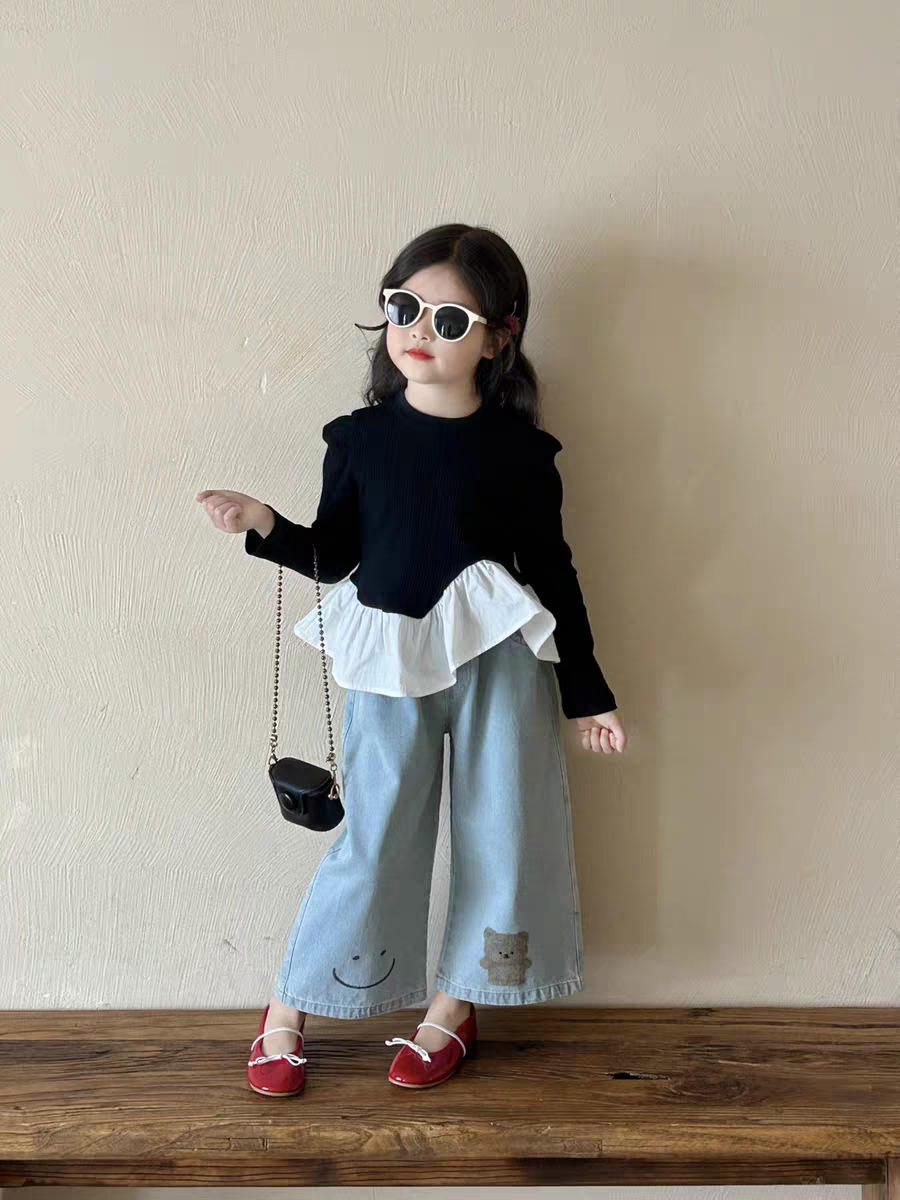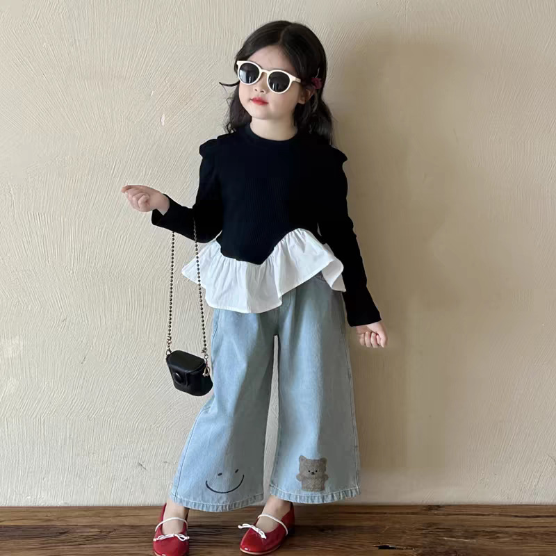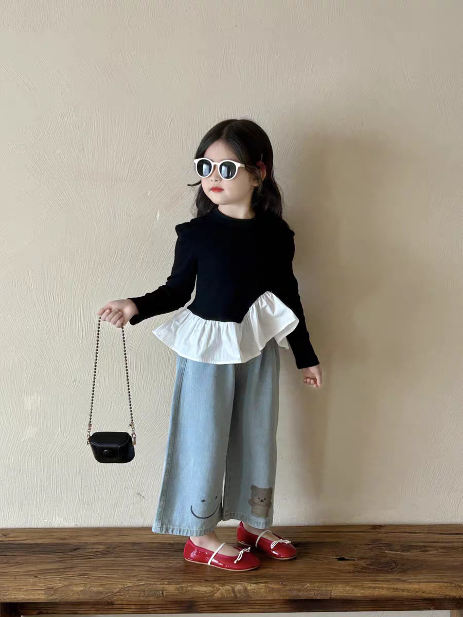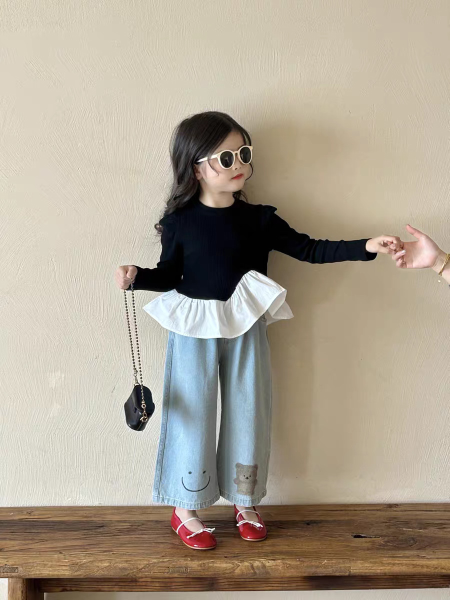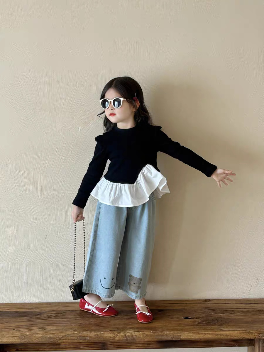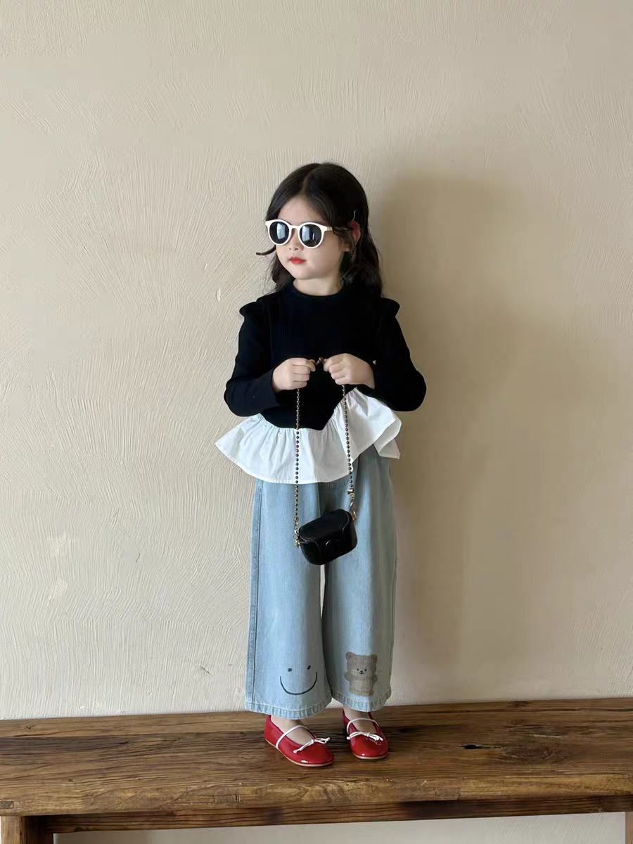 여아 한국 아동복 2025 가을 신작 여아 및 중년 아동 러플 스타일 탑 티셔츠 베어 청바지