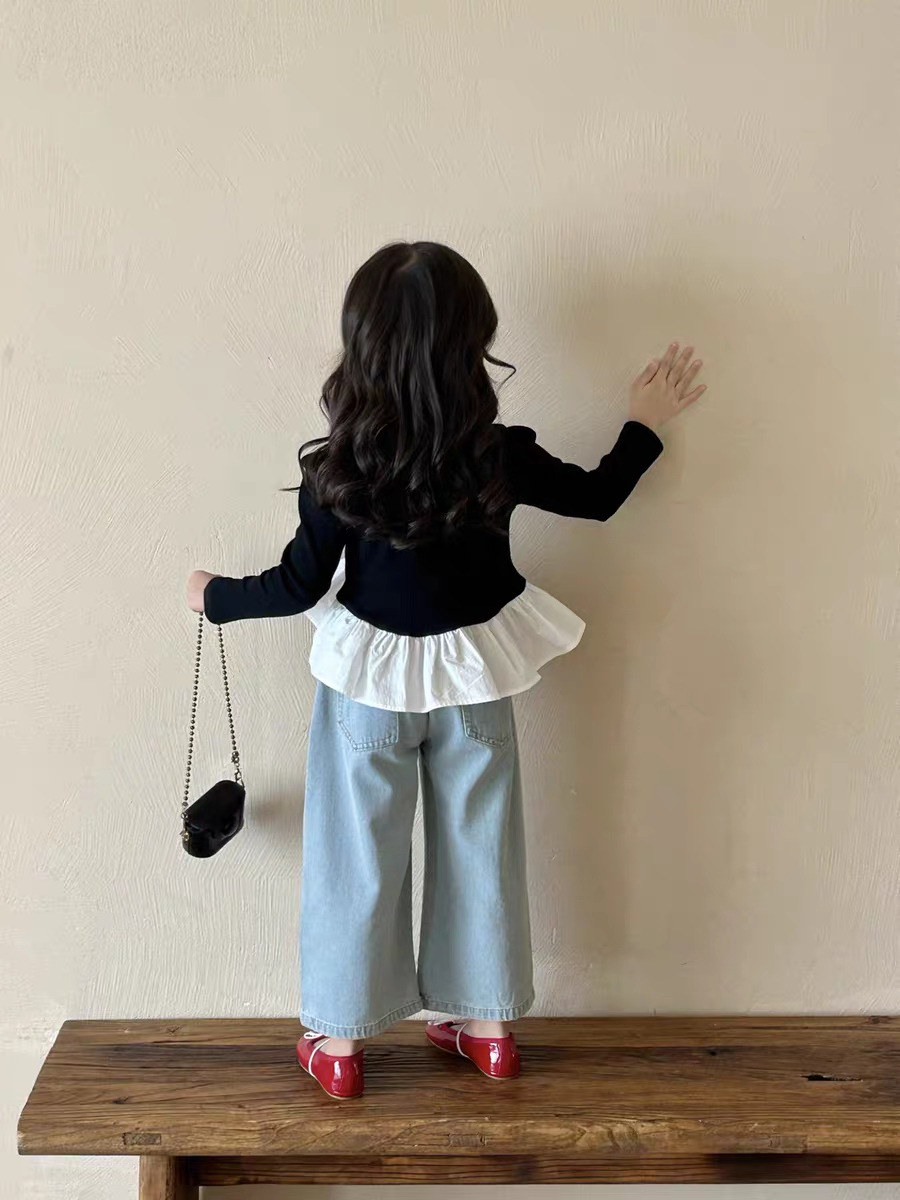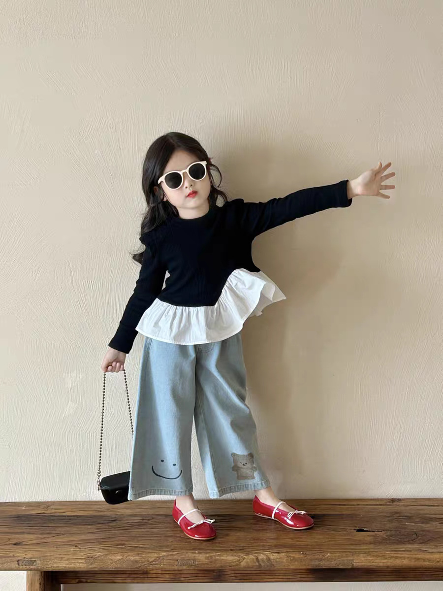 여아 한국 아동복 2025 가을 신작 여아 및 중년 아동 러플 스타일 탑 티셔츠 베어 청바지스토어 가기