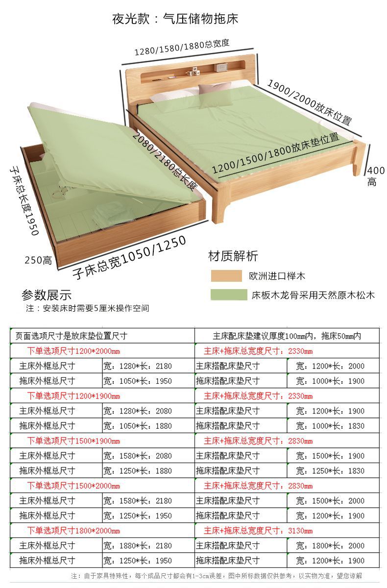 • 너도밤나무 색상 야광: 수납 공간이 없는 드래그 베드 + 자카드 라텍스 매트 2개