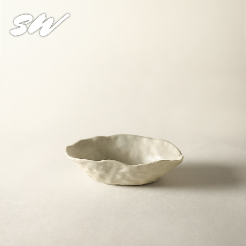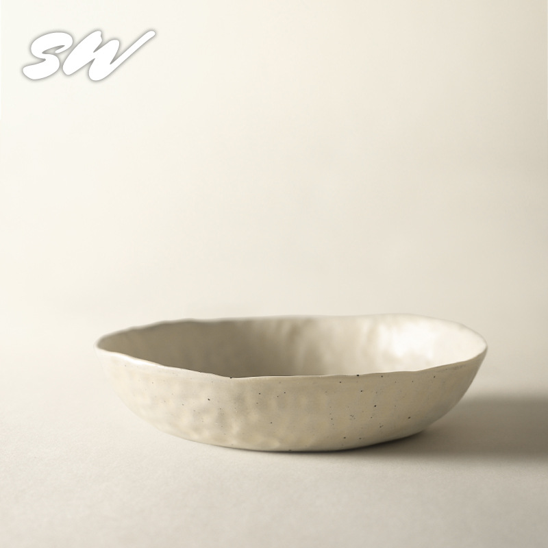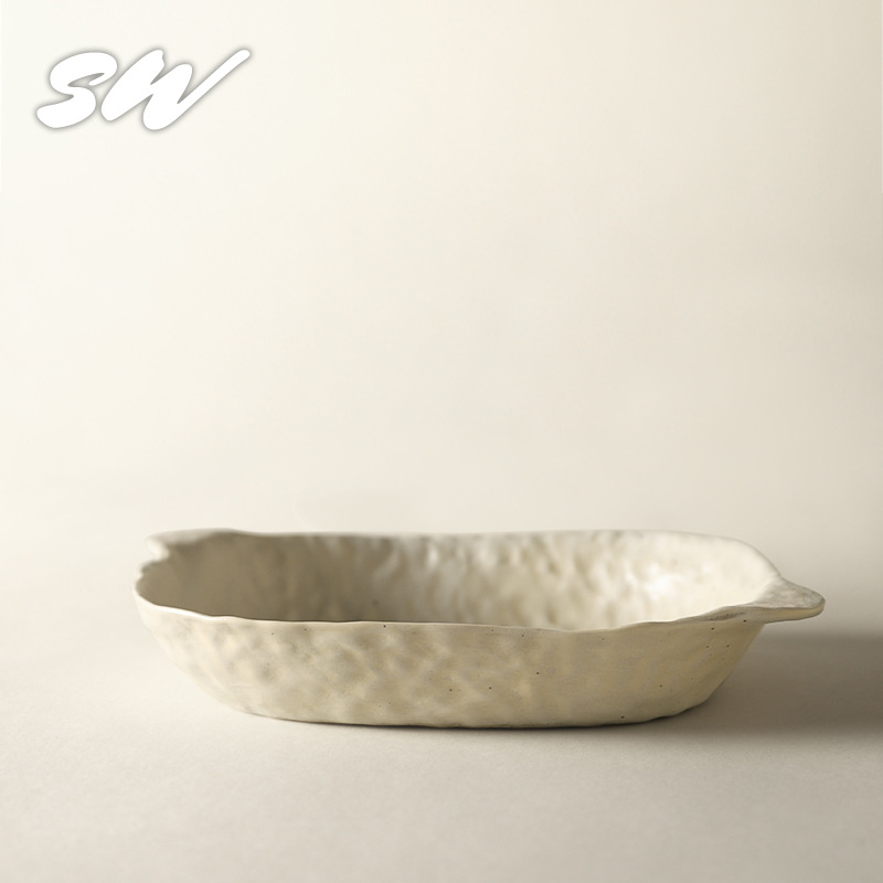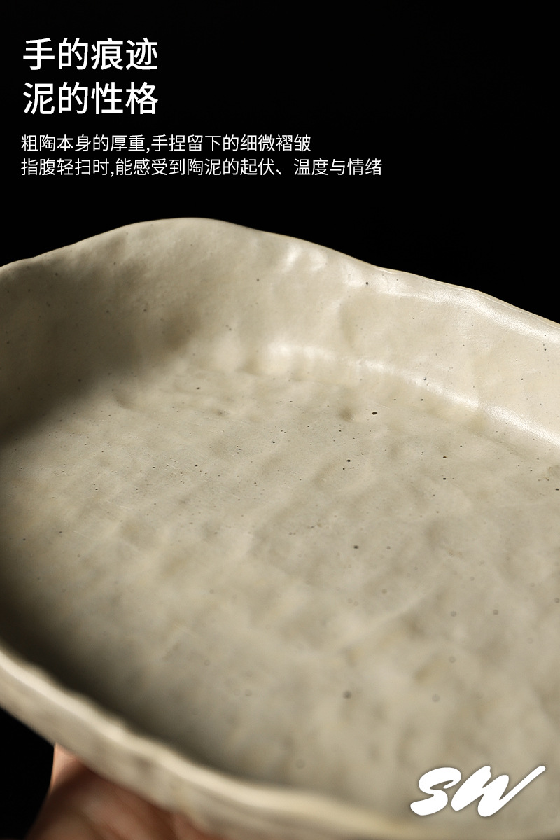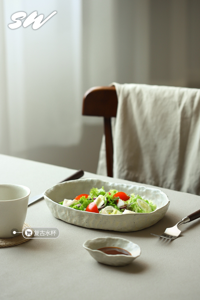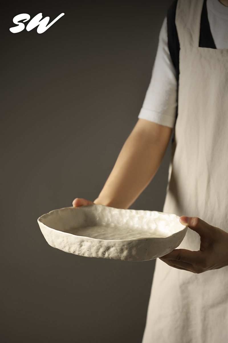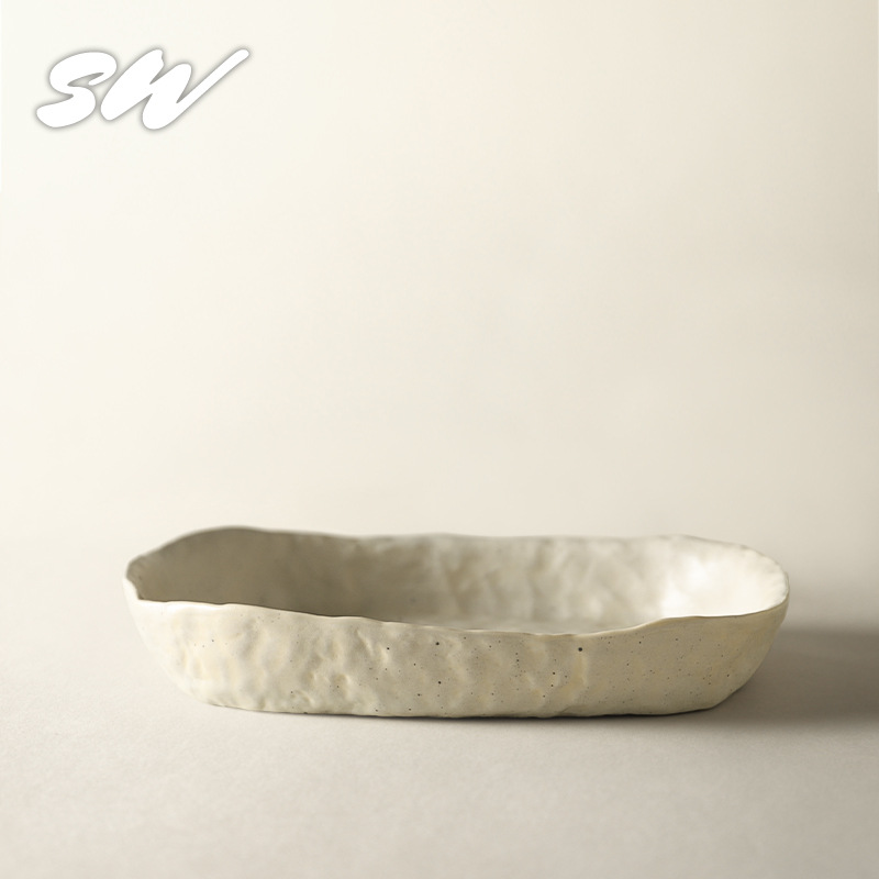 Sanwu 복고풍 손으로 짜낸 거친 도자기 식기 불규칙한 그릇과 접시 맞춤형 디너 접시 일본식 생선 접시 샐러드 접시 양각 접시
