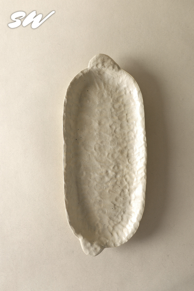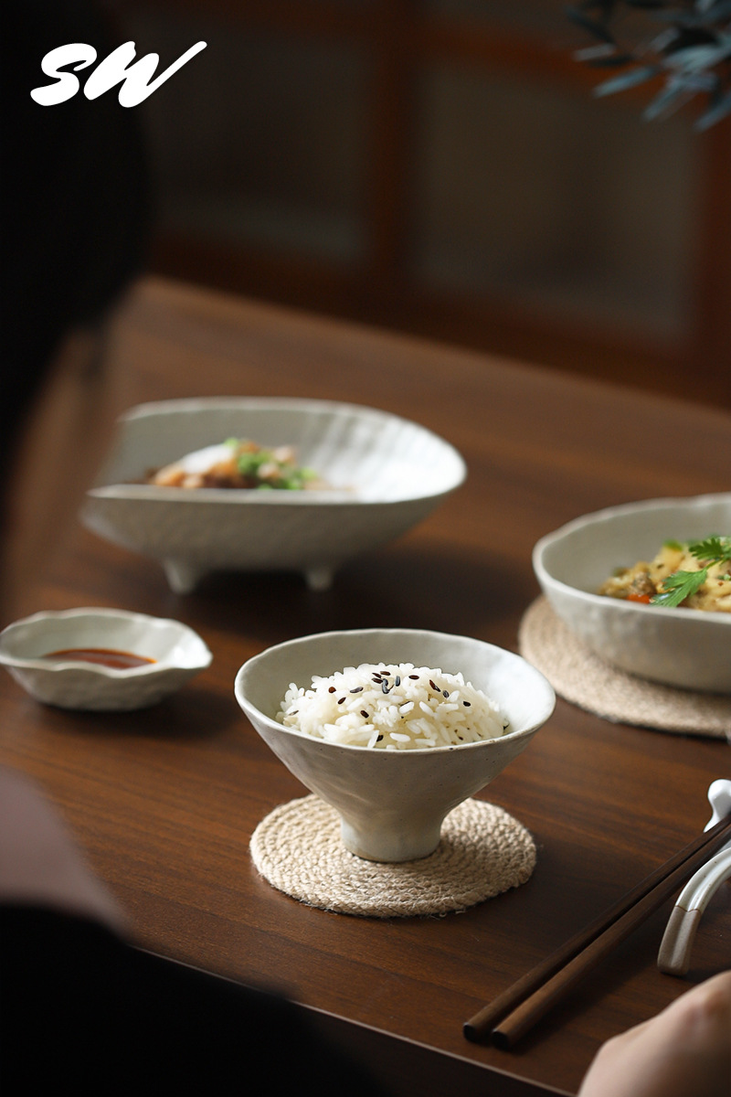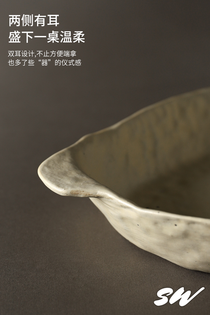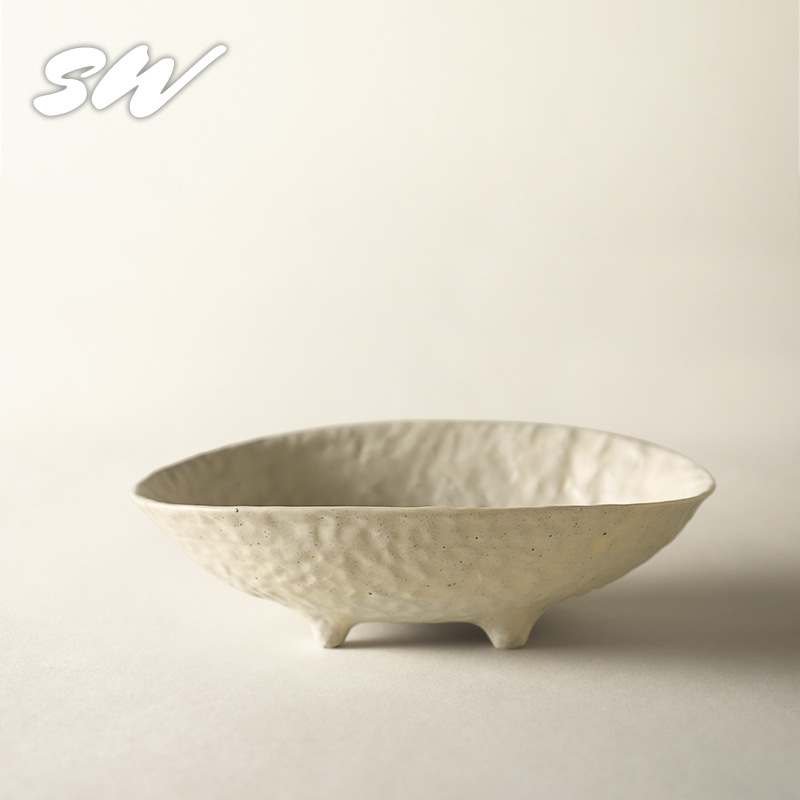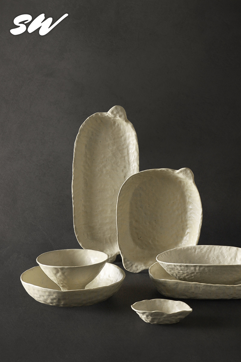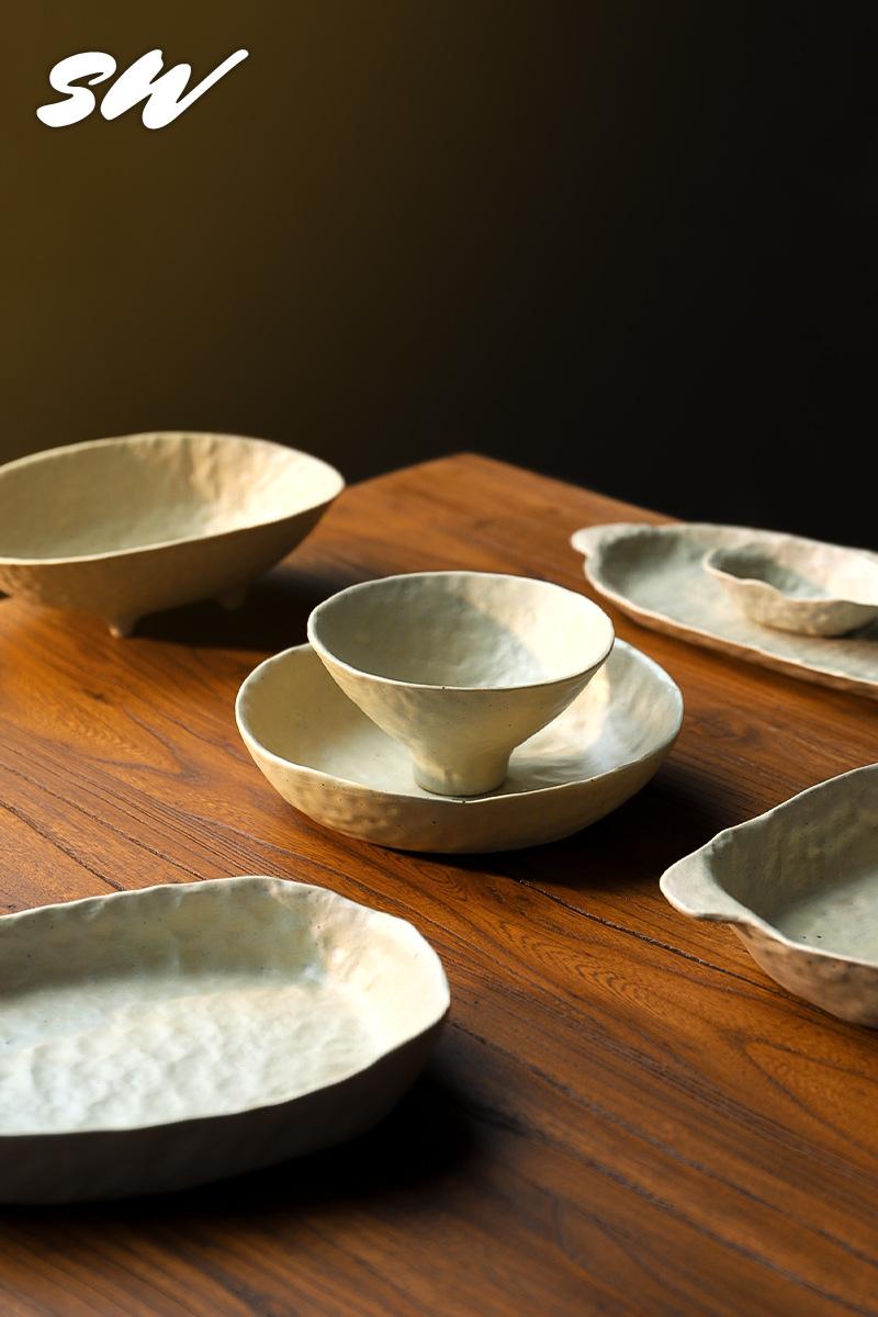 Sanwu 복고풍 손으로 짜낸 거친 도자기 식기 불규칙한 그릇과 접시 맞춤형 디너 접시 일본식 생선 접시 샐러드 접시 양각 접시