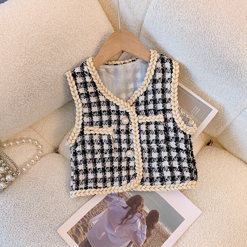 아동 가을 겨울 누비 조끼 새로운 스타일의 작은 향기로운 탑 한국 스타일의 세련된 진주 단추 격자 무늬 조끼스토어 가기