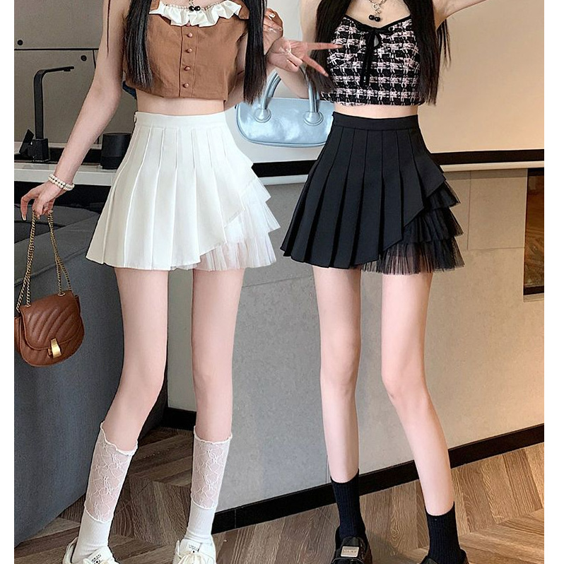 플리츠 스커트 스플라이스 메쉬 여성 A라인 한국식 컬리지 스타일 하이웨이스트 슬림 A라인 스커트 쁘띠 숏 스커트 트렌디스토어 가기