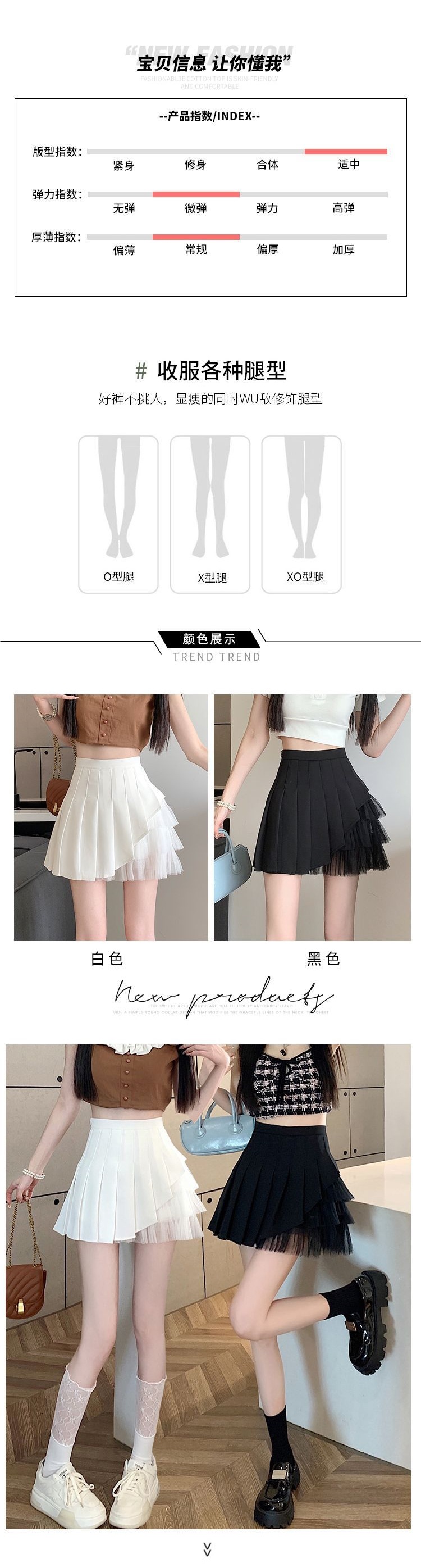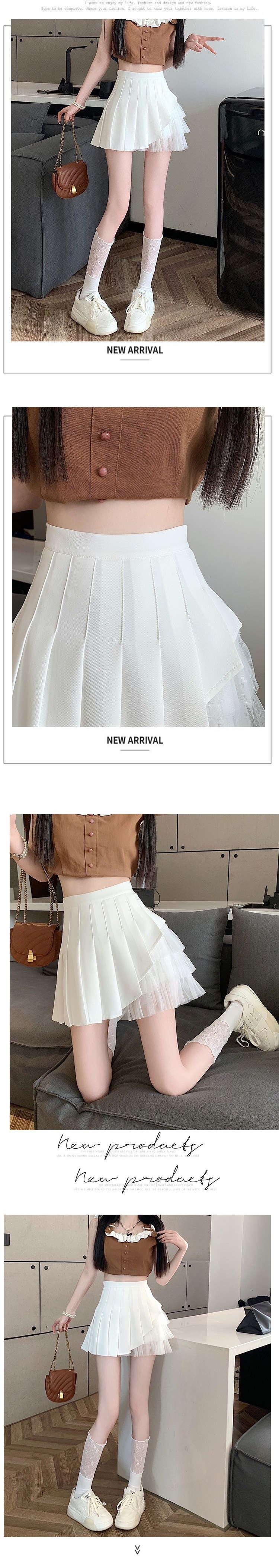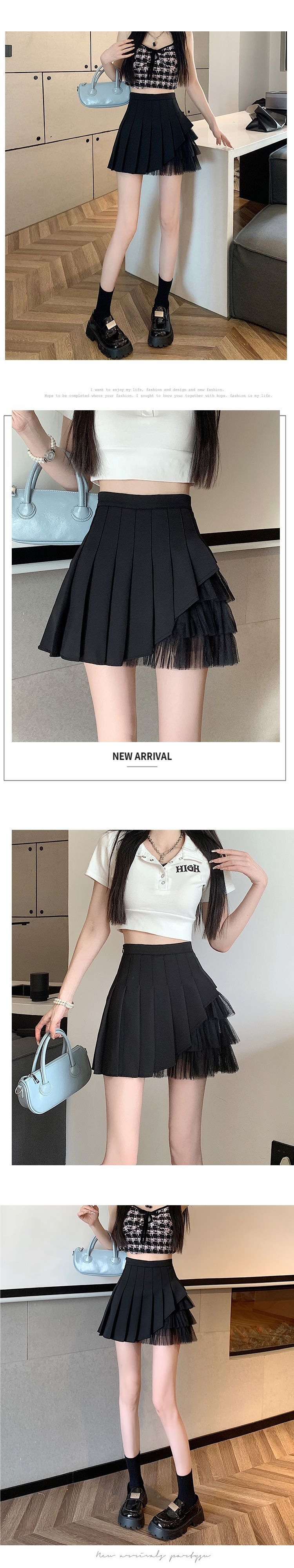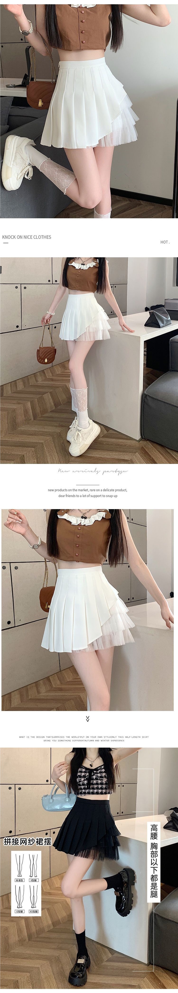 플리츠 스커트 스플라이스 메쉬 여성 A라인 한국식 컬리지 스타일 하이웨이스트 슬림 A라인 스커트 쁘띠 숏 스커트 트렌디