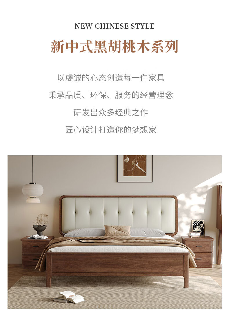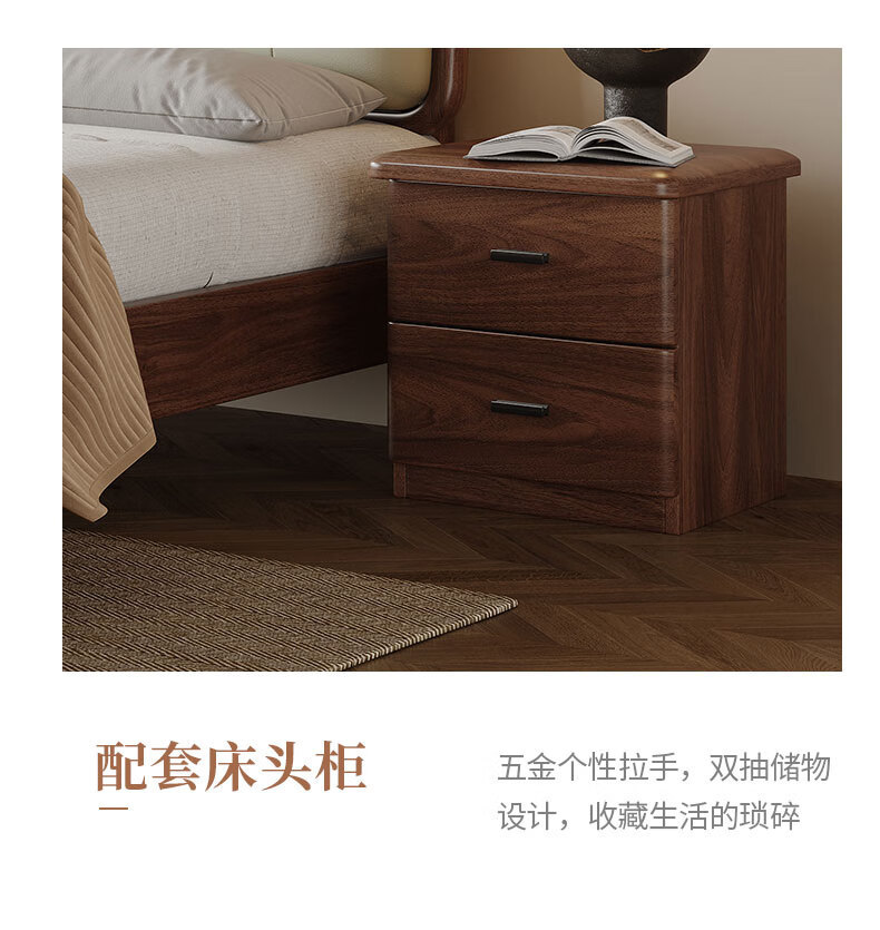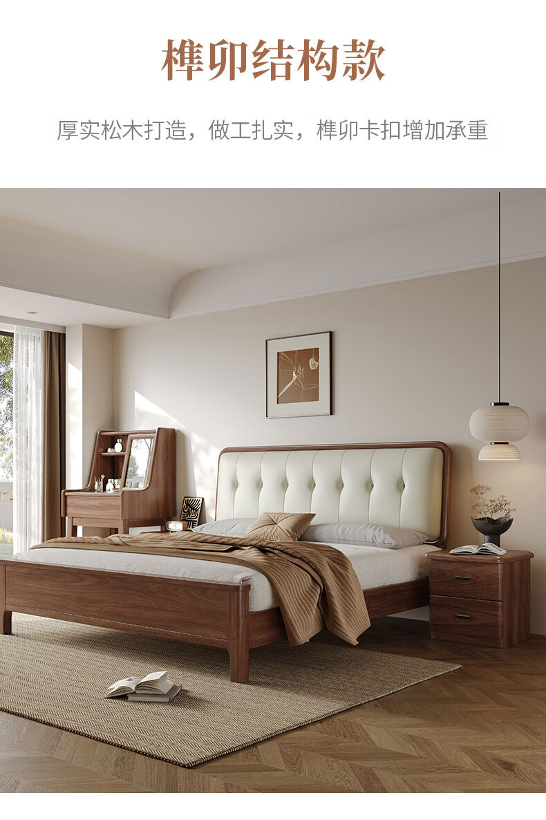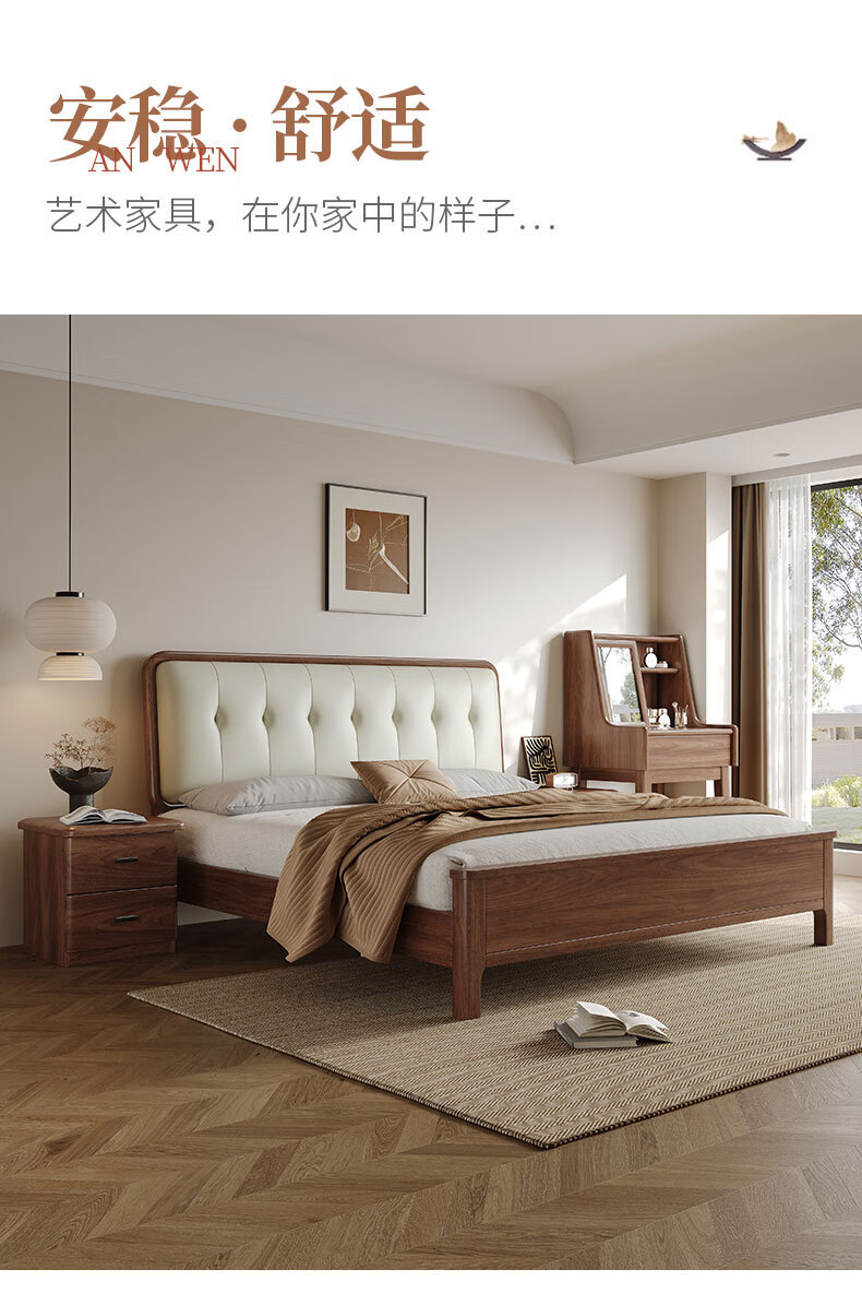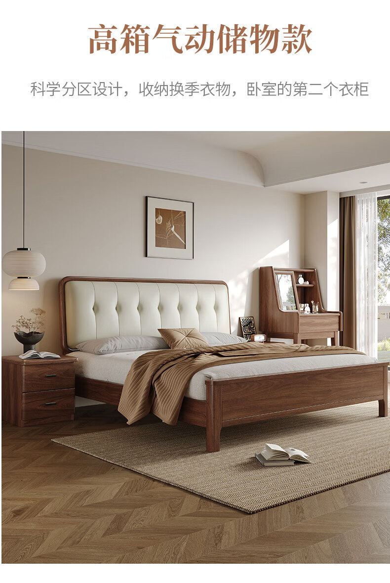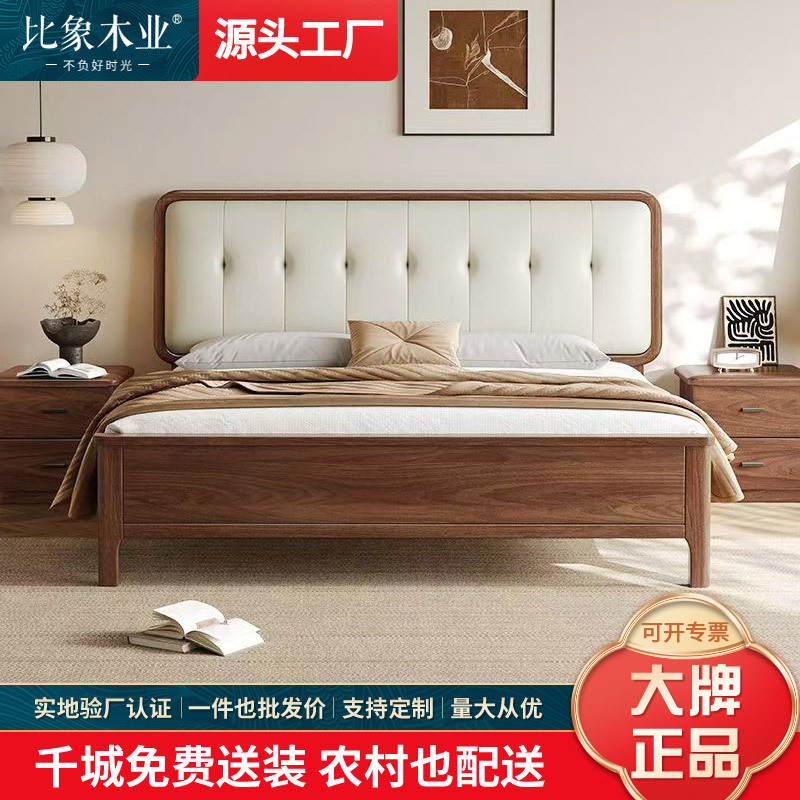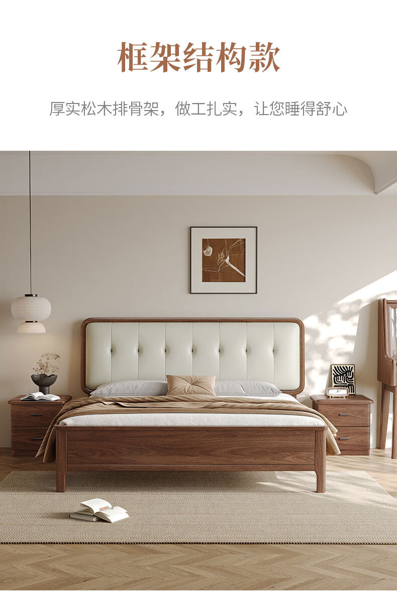 북유럽 단단한 나무 침대 2025 새로운 검은 호두 현대 간단한 가죽 침대 부드러운 가방 침대 버클 침대 와비사비 스타일