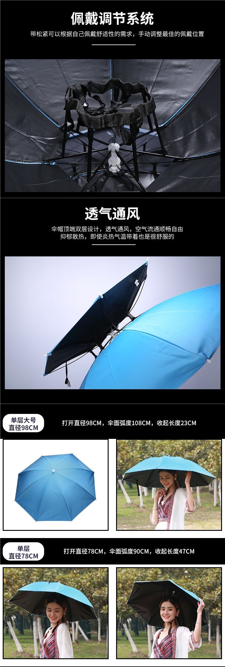 자외선 차단, 자외선 차단, 비 방지, 모자가 달린 헤드 장착형 파라솔, 태양 우산, 모자, 낚시 및 차 따기 우산