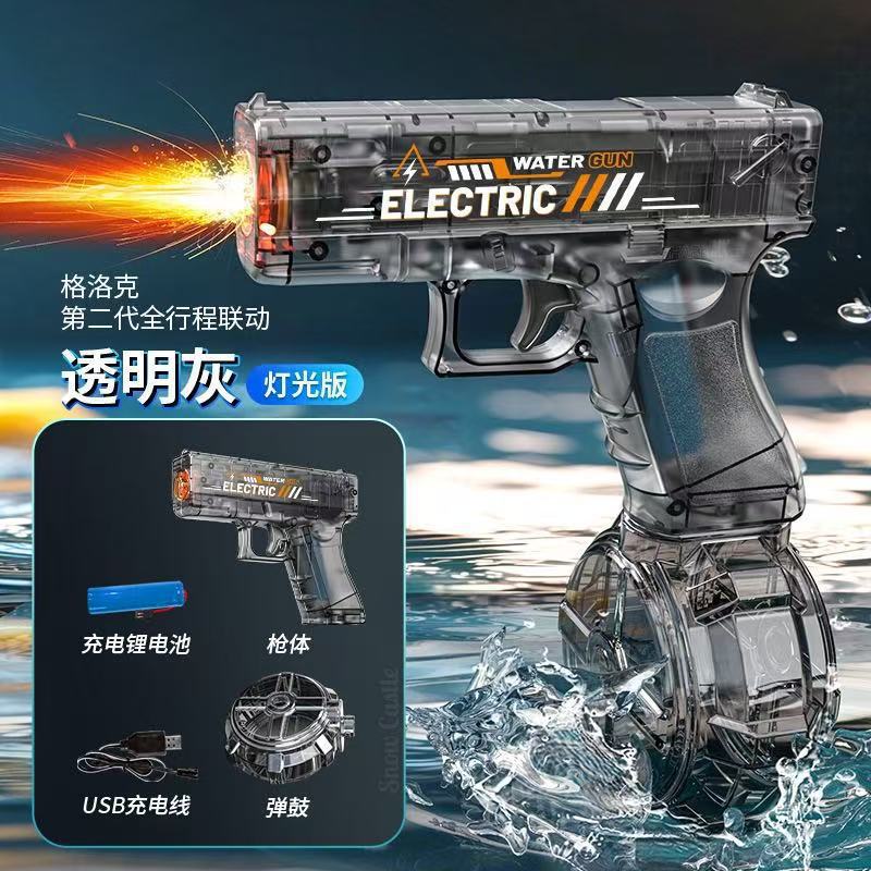 2세대 글록 불꽃 방지 소음기 플래시 2025 새로운 어린이 전기 물총 장난감 자동 연속 발사