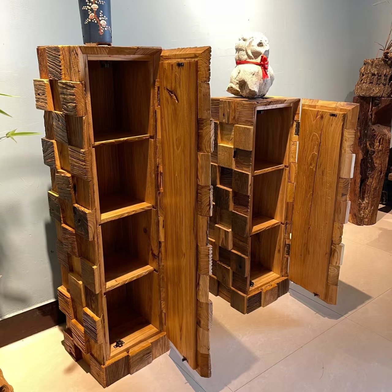 오래된 느릅나무 단일 도어 수납 캐비닛 나무 격자 무늬 와비사비 스타일 복고풍 장식 캐비닛 복고풍 단단한 나무 바닥 캐비닛