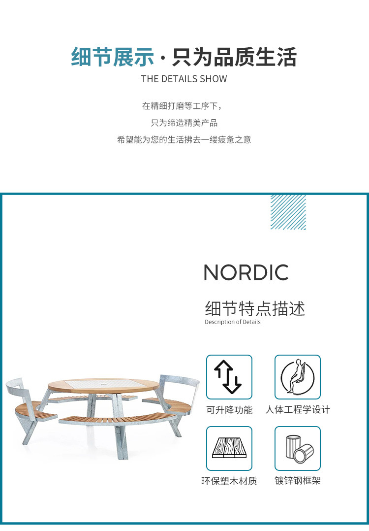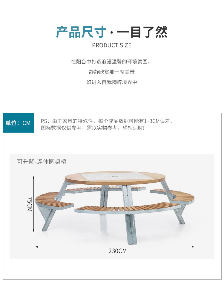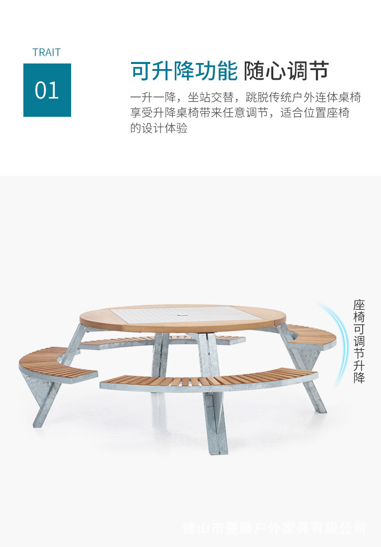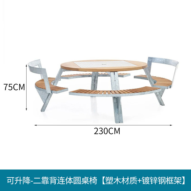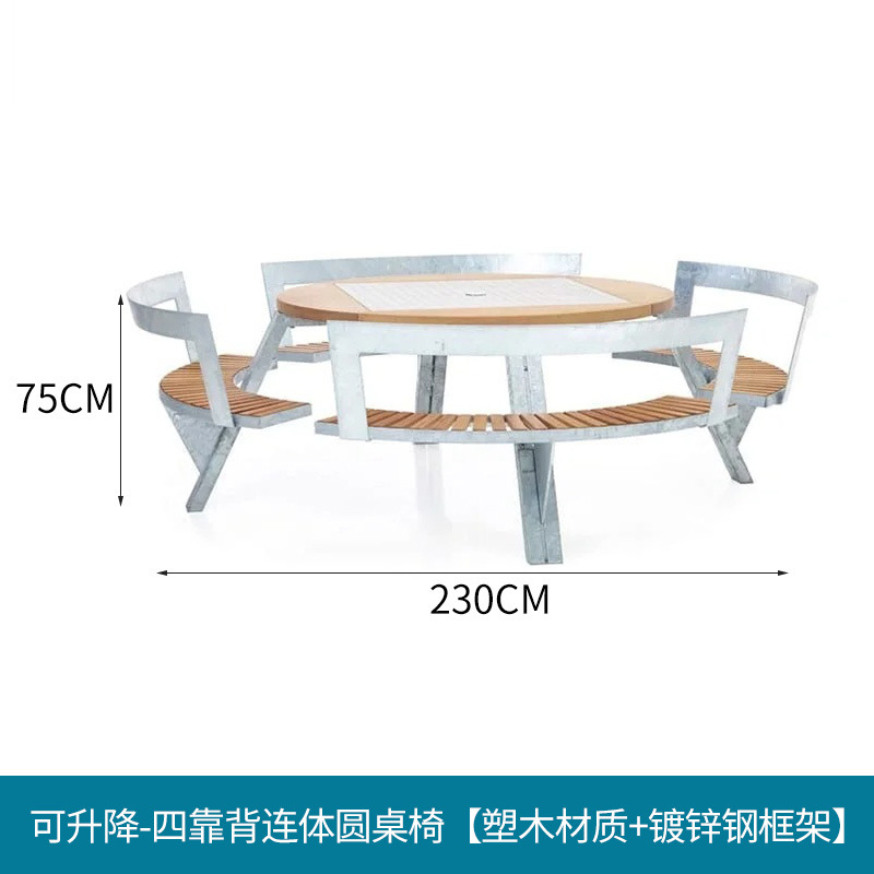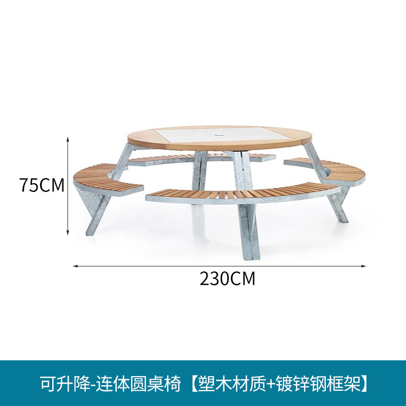 • 들어올릴 수 있는 일체형 원형 테이블과 의자 [플라스틱 목재 소재 + 아연 도금 강철 프레임]