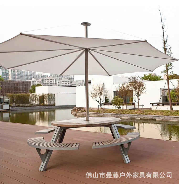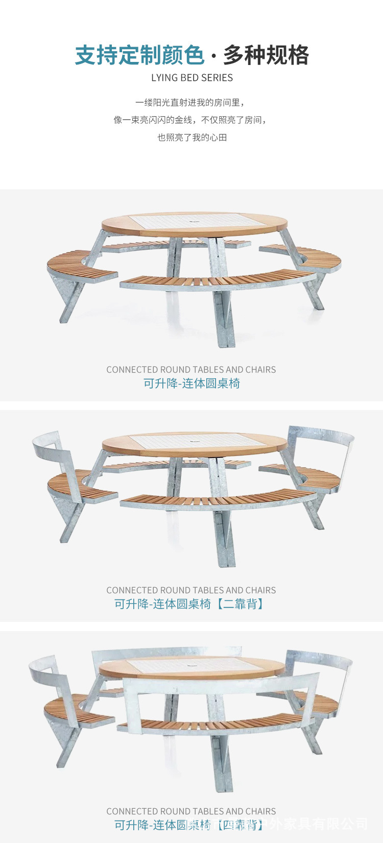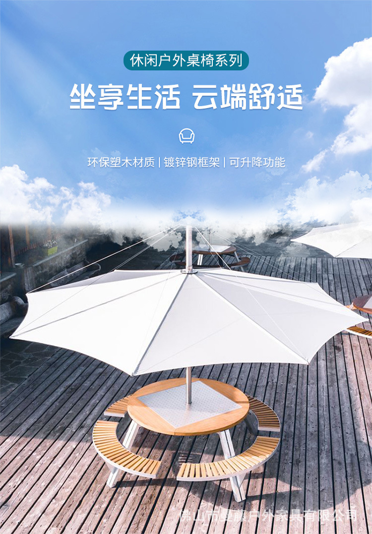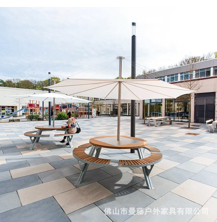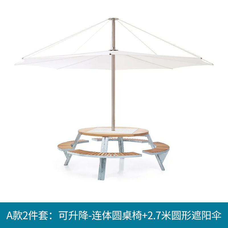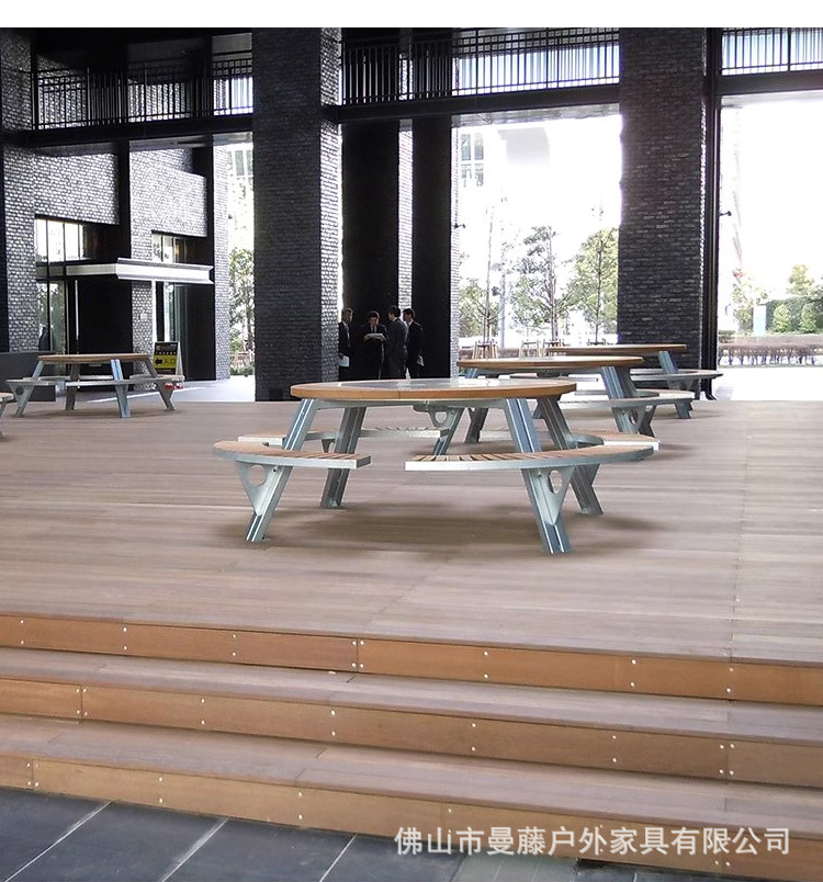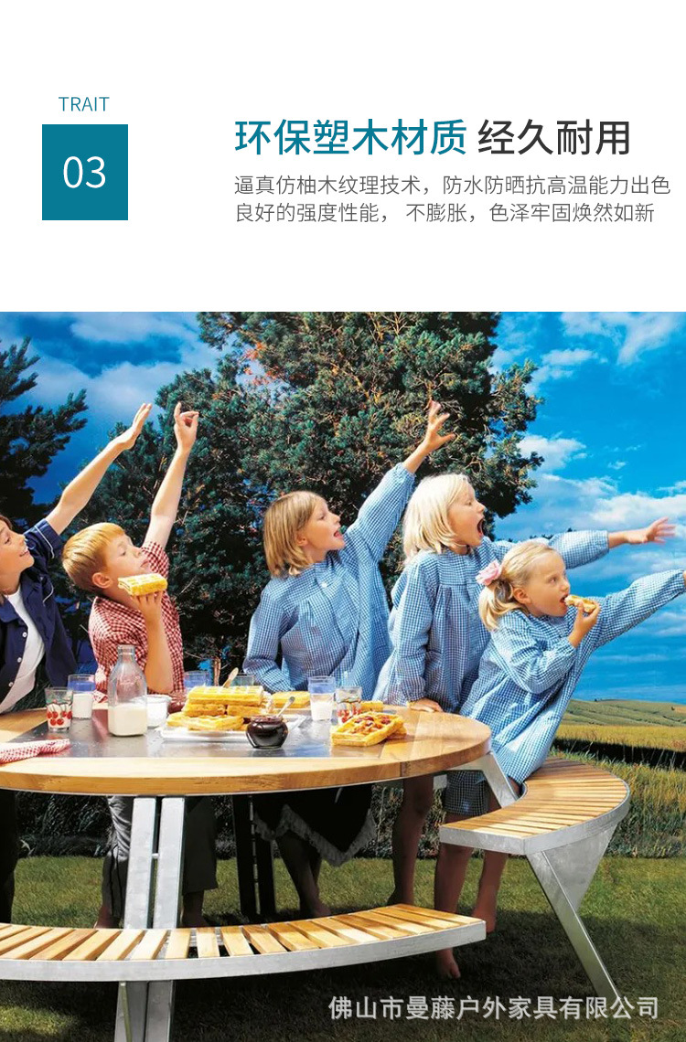 • 들어올릴 수 있는 일체형 원형 테이블과 의자 [플라스틱 목재 소재 + 아연 도금 강철 프레임]