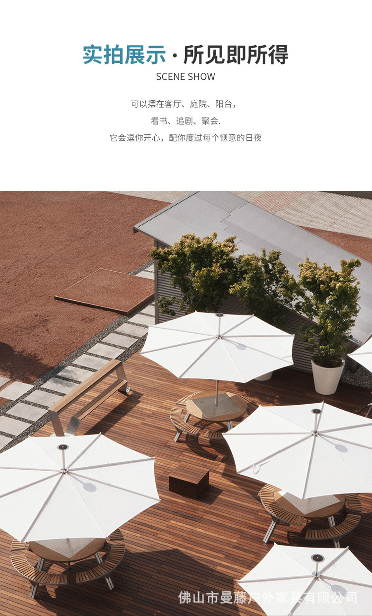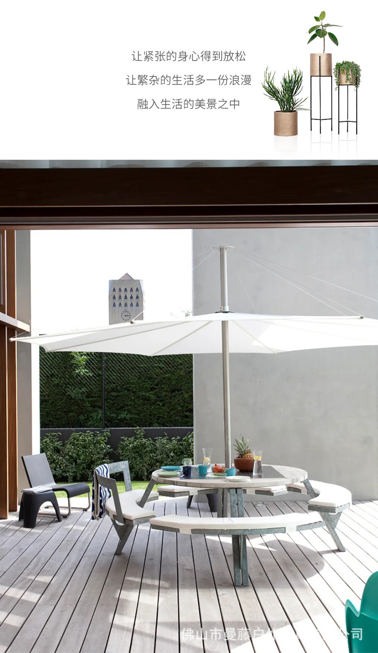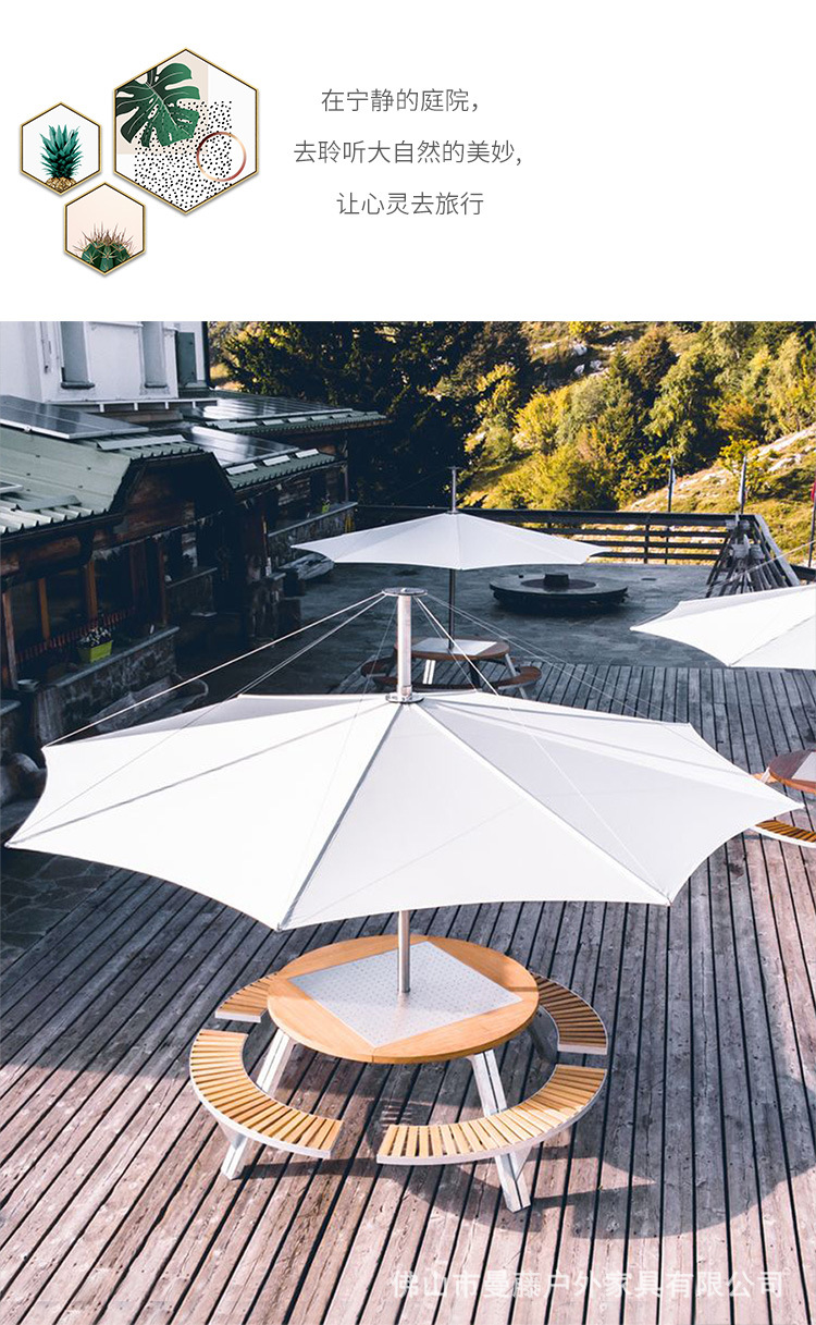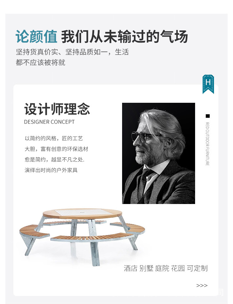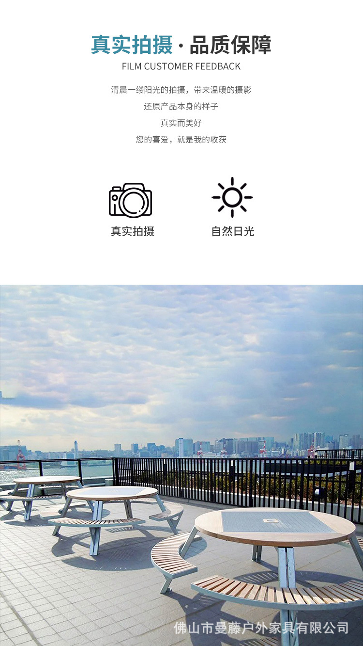 • 들어올릴 수 있는 일체형 원형 테이블과 의자 [플라스틱 목재 소재 + 아연 도금 강철 프레임]