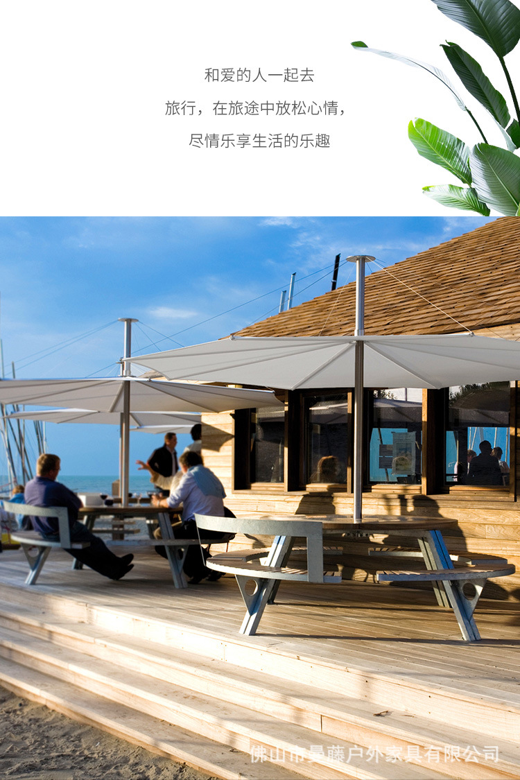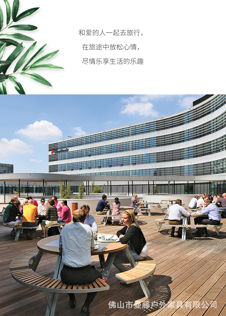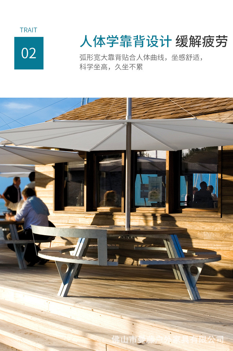 • 들어올릴 수 있는 등받이 2개 일체형 원형 테이블 및 의자 [플라스틱 목재 소재 + 아연 도금 강철 프레임]
