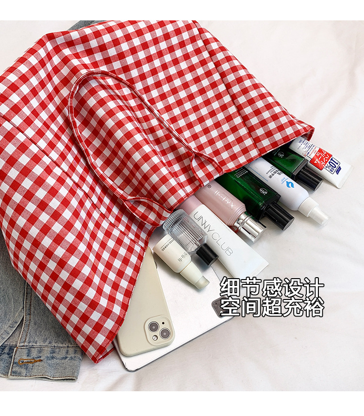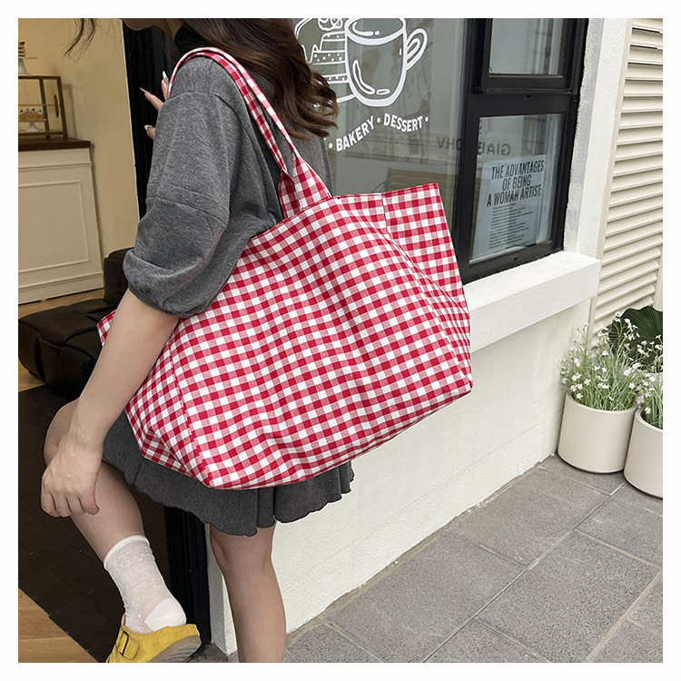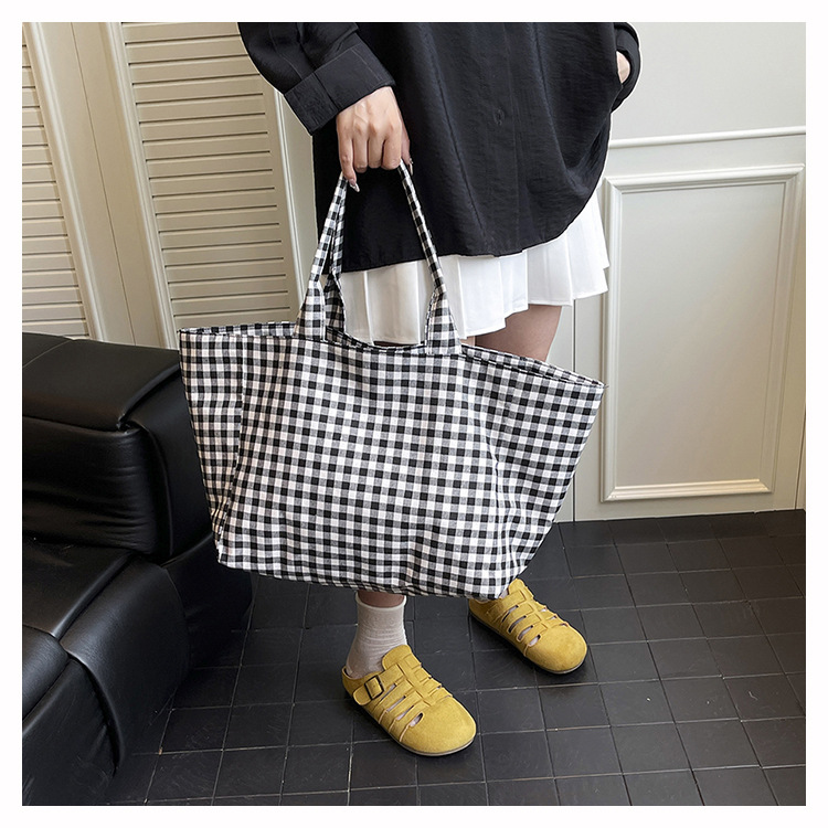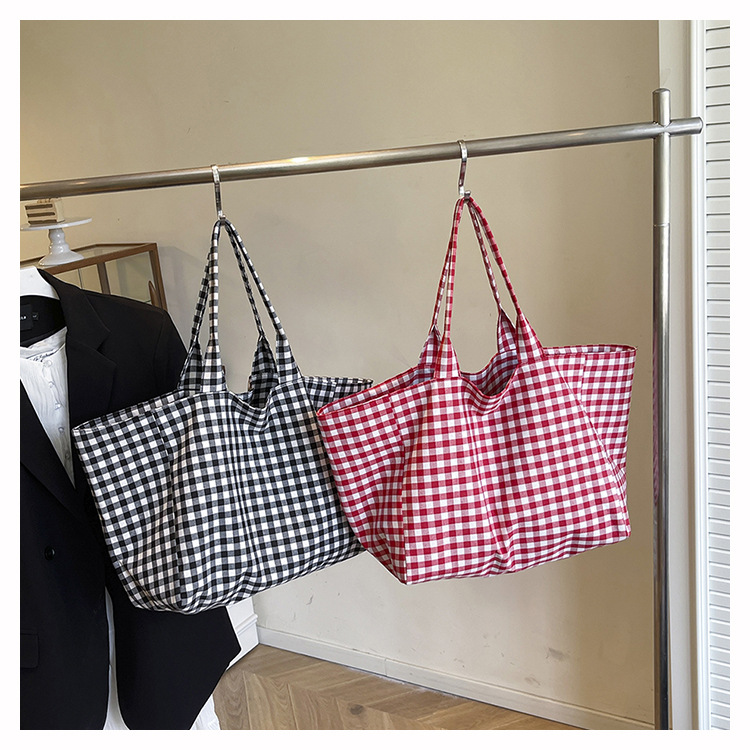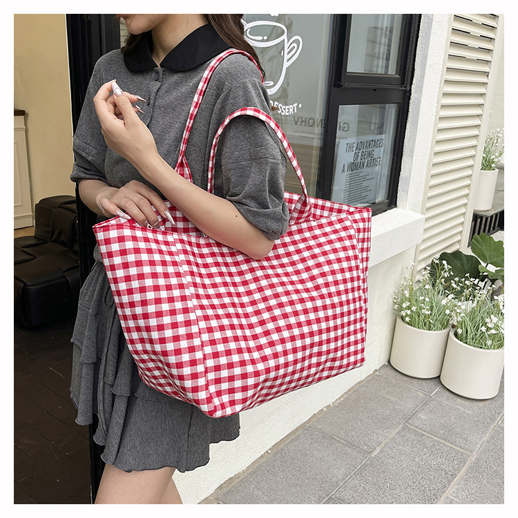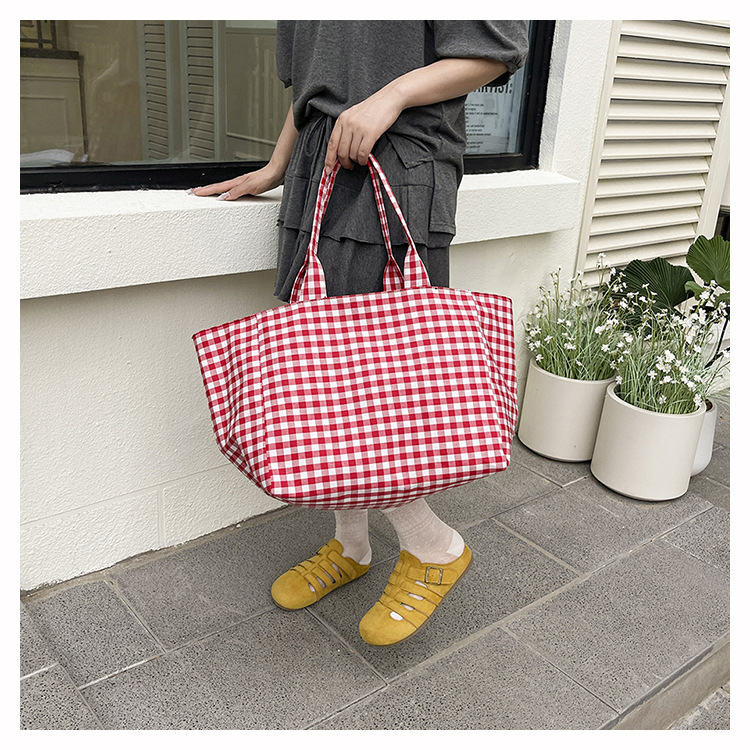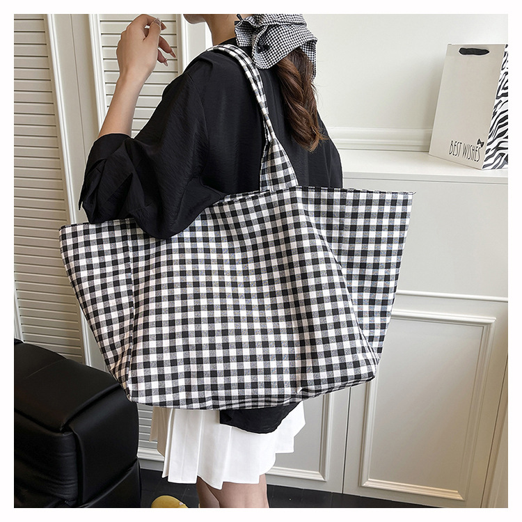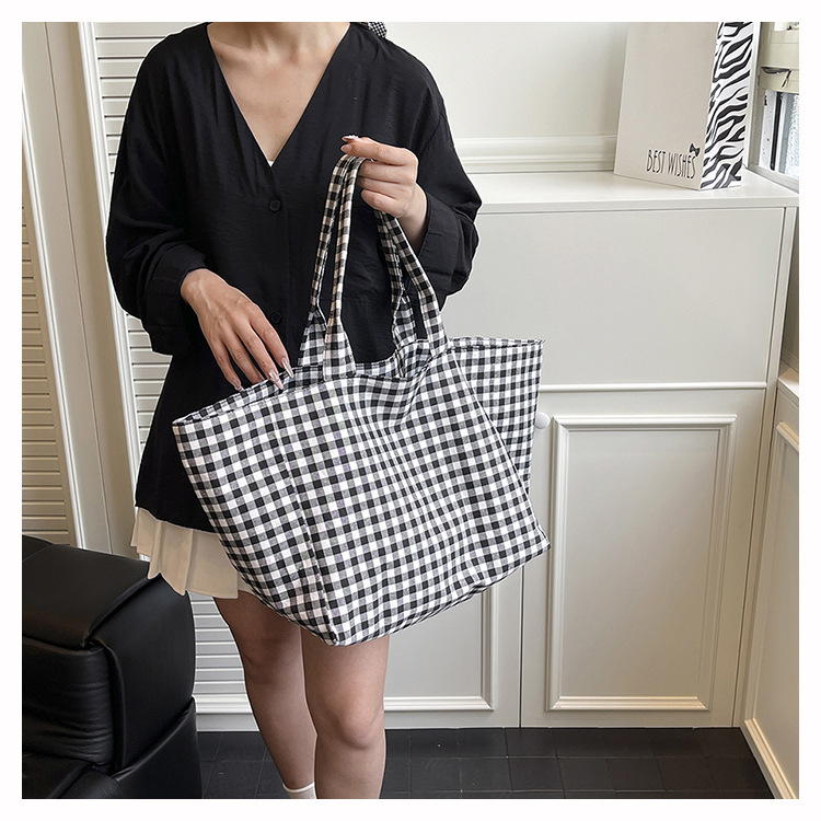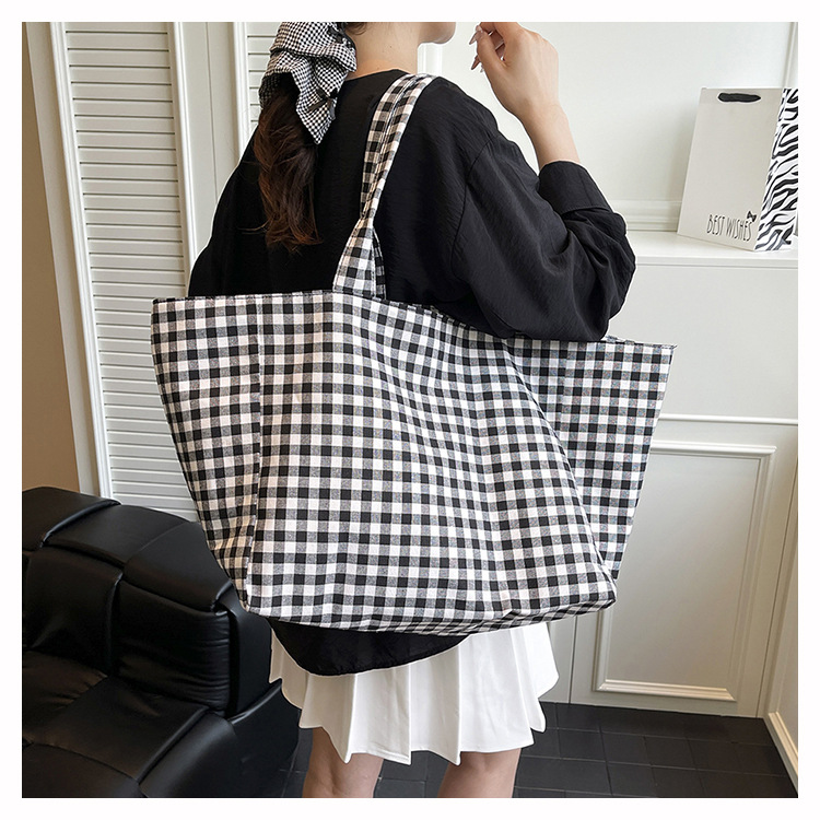 여성을위한 여름 문학 게으른 스타일 토트 백 새로운 대용량 격자 무늬 캔버스 캐주얼 클래스 어깨 겨드랑이 가방스토어 가기