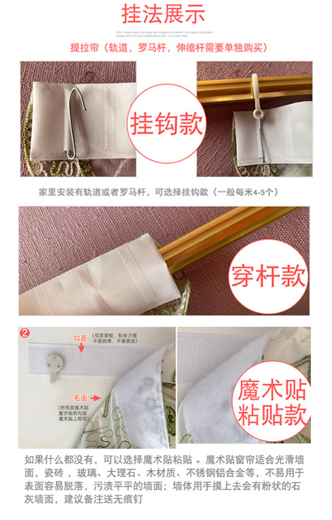 *窗帘做法是魔术贴、挂钩、穿杆三种做法,要哪个做法备注或留言。上面已经缝好了可以用挂钩的布带,挂钩配好钩子,粘贴配好背胶和无痕钉; 挂钩挂在轨道或者带环罗马杆上,也可以直接穿杆【罗马杆或伸缩杆--要伸缩杆的点击文字进入链接 】---注意穿杆的杆子直径在3.4cm以下都是可以的,超过3.4cm联系客服备注穿杆做大。杆子和轨道都不带 需自己购买好。 各种需批发客户请直接联系我们,或直接下单。【不懂的联系客服】