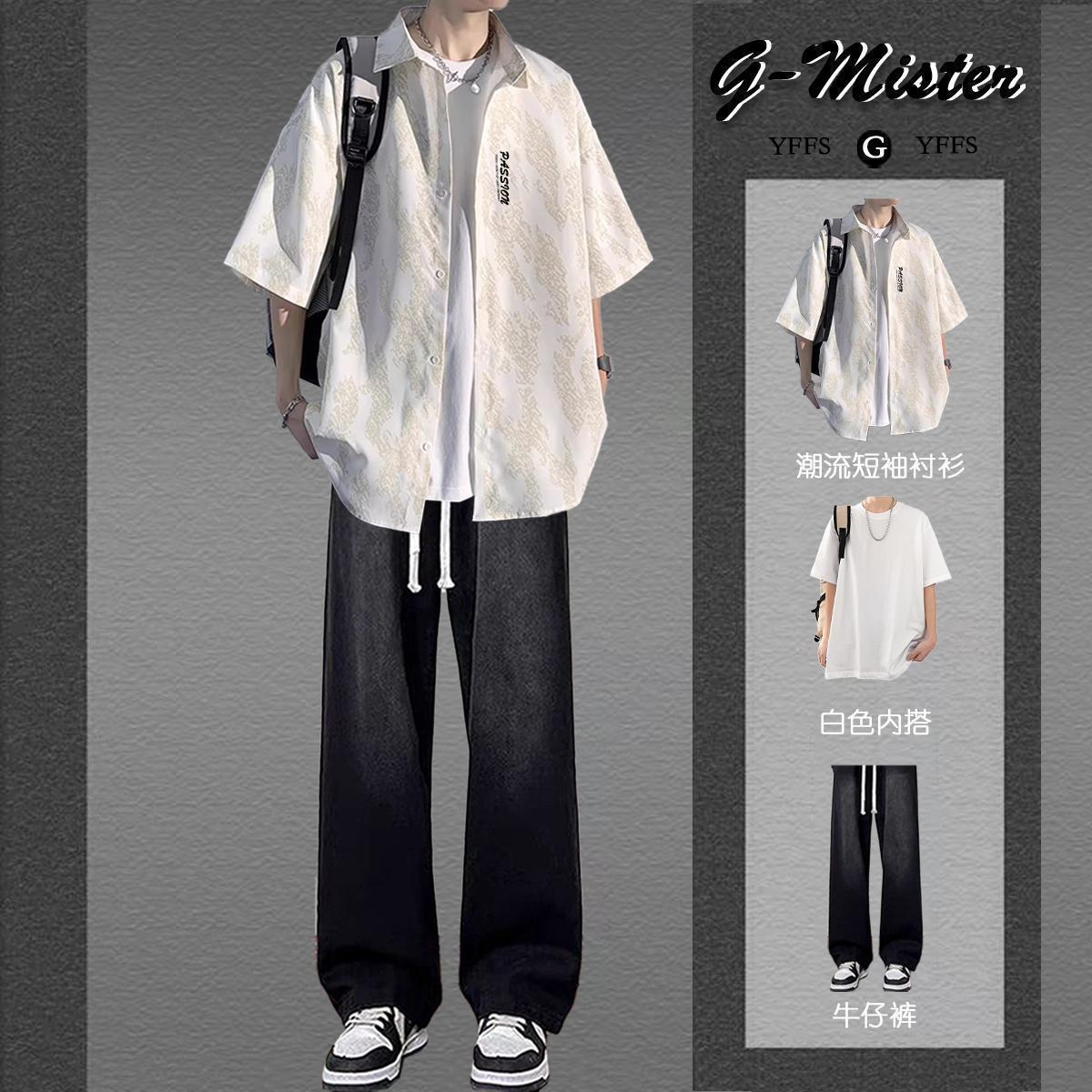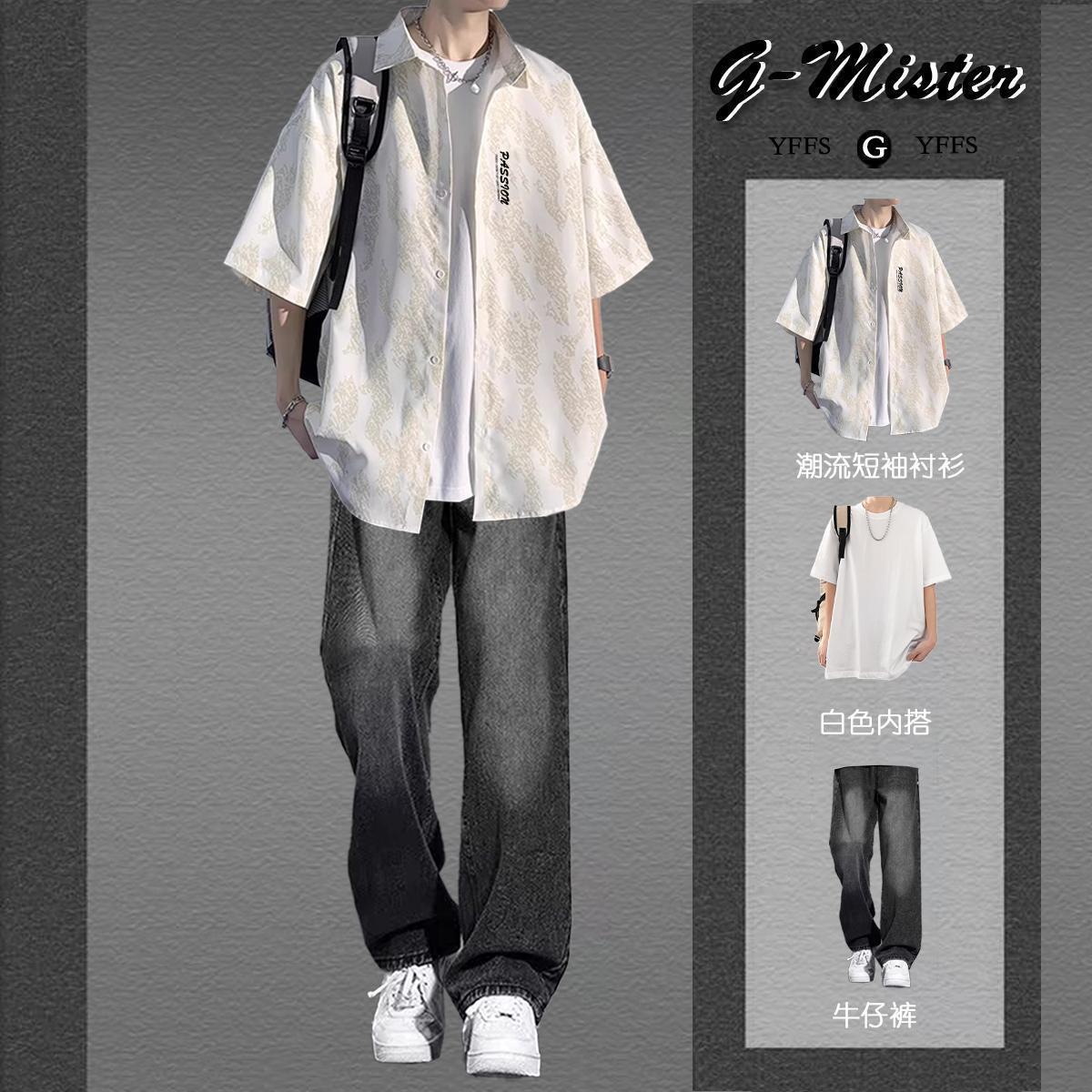 • [3종세트] 화이트 반팔 셔츠 + 반팔 + 청바지 애쉬