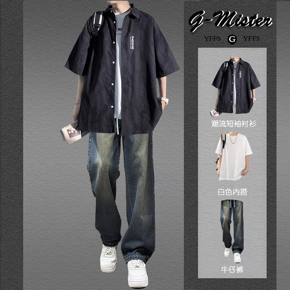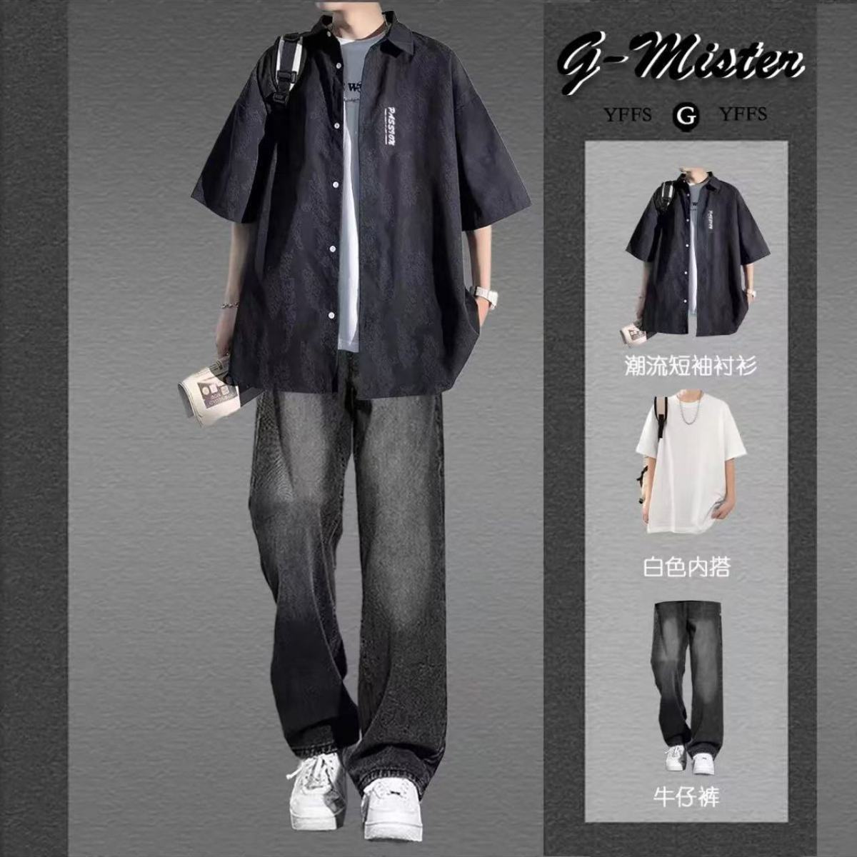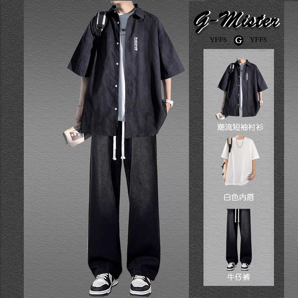 • [3종세트] 화이트 반팔 셔츠 + 반팔 + 블랙 청바지