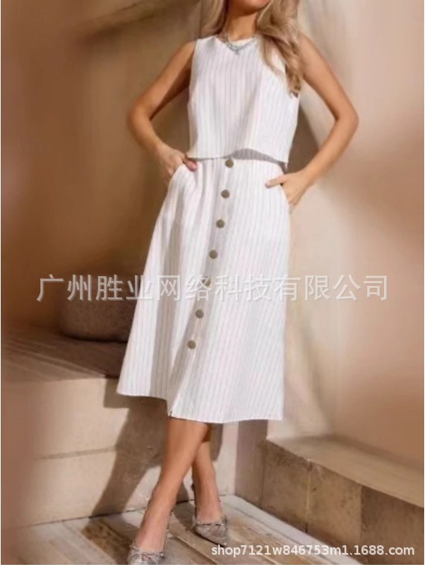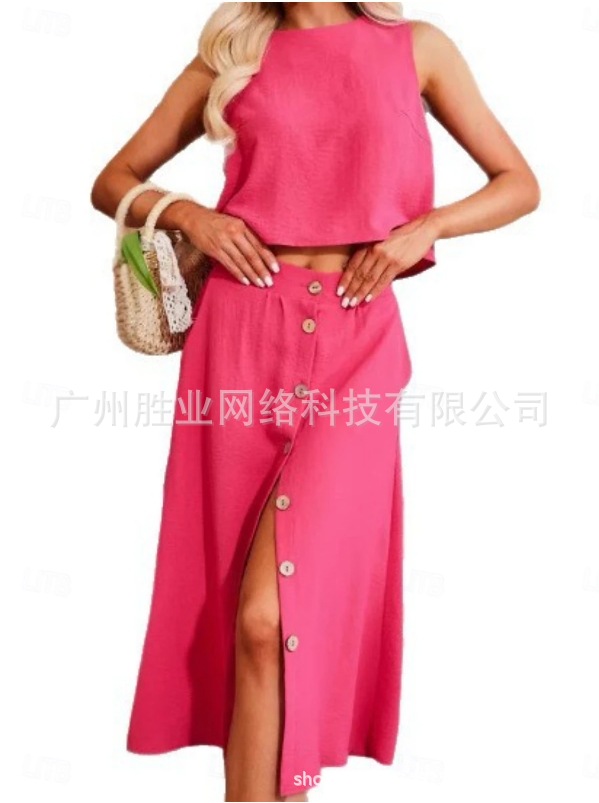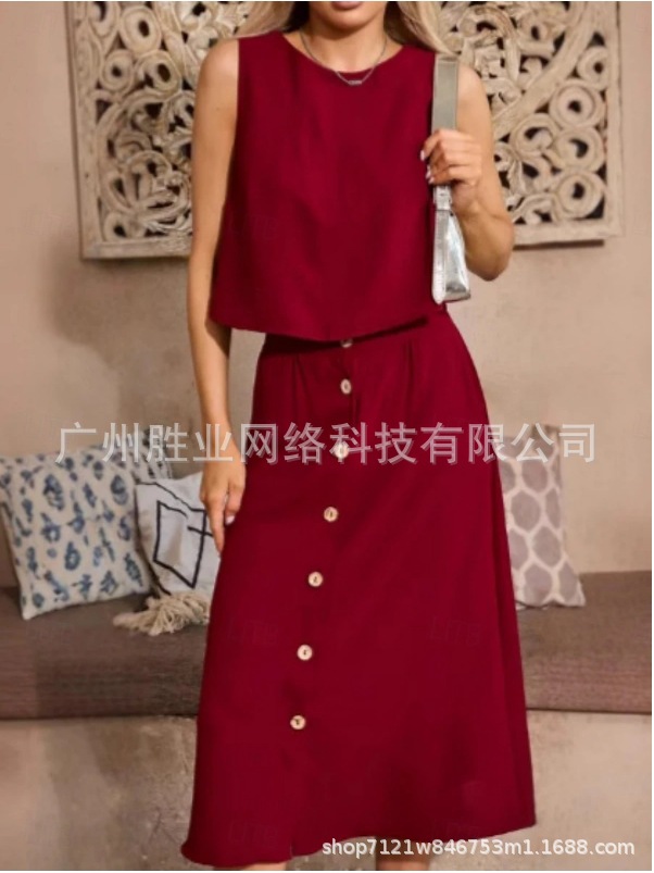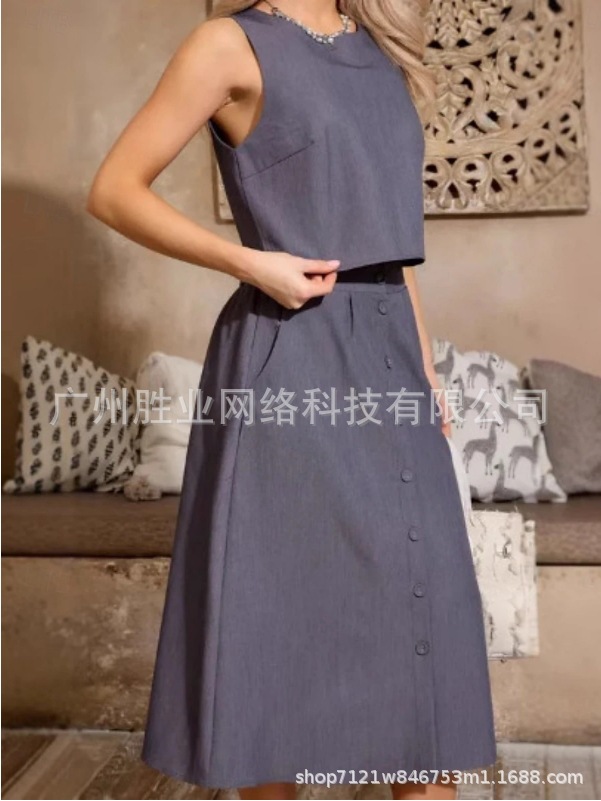 2025 유럽과 미국의 국경 간 대외 무역 여성 스커트 정장 A 라인 스커트 기질 솔리드 컬러 포켓 버튼 롱 스커트 민소매 라운드 넥