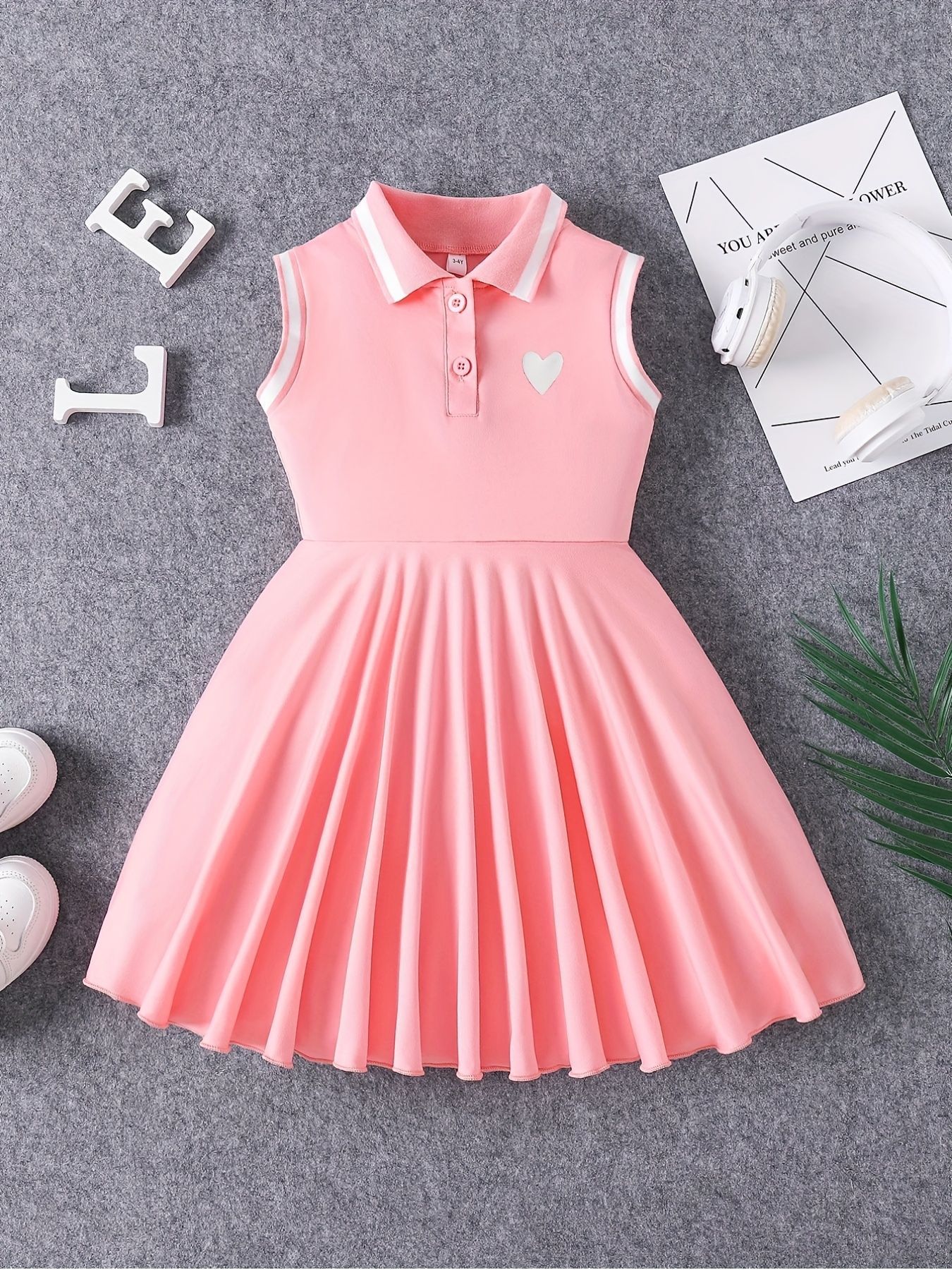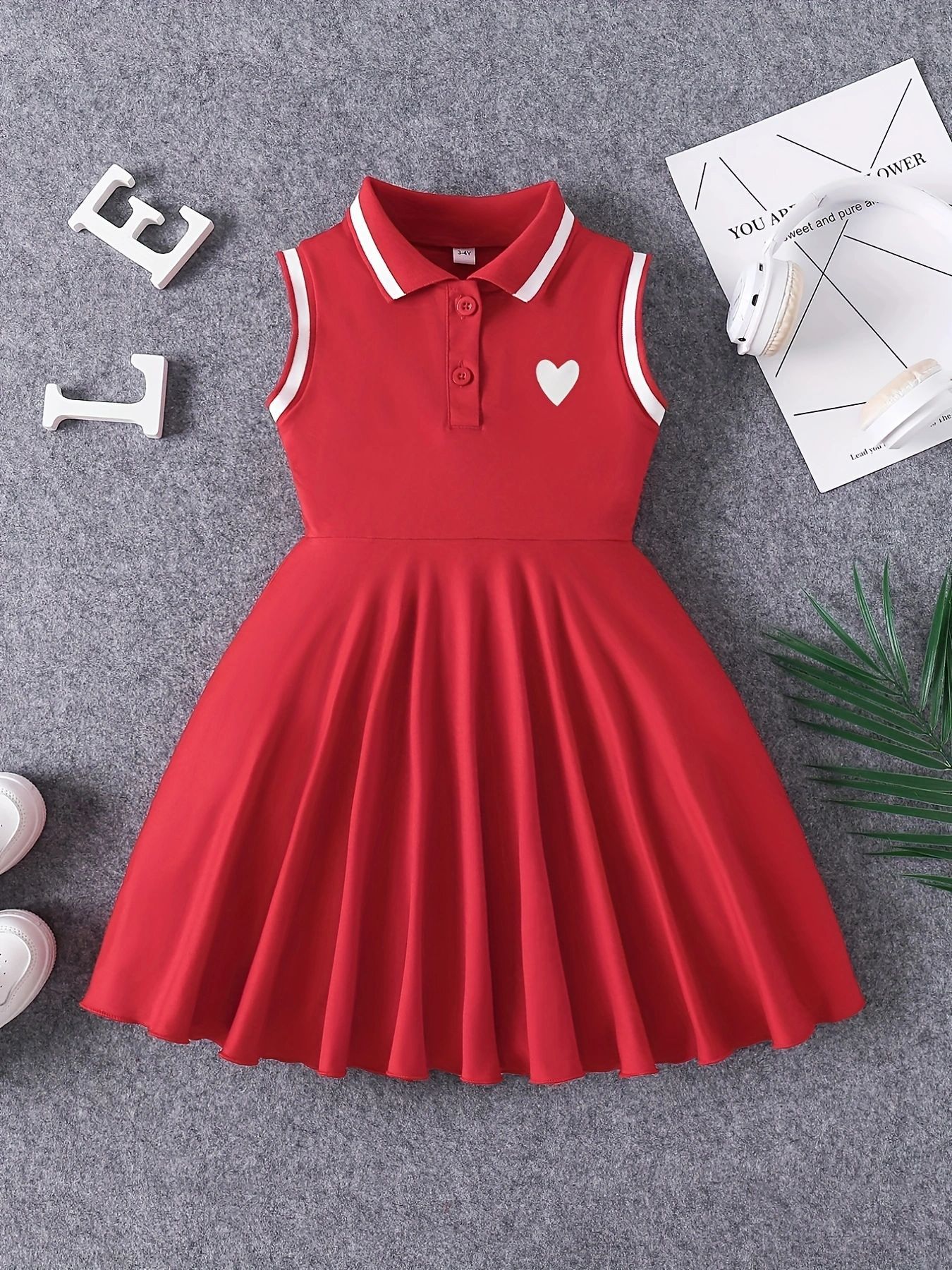 크로스보더 INS 여름 스타일 라펠 풀오버 민소매 하트 프린트 허리 주름 드레스(소형 및 중형 아동용)스토어 가기