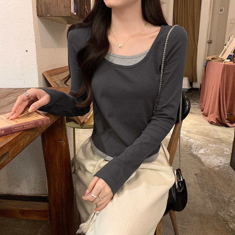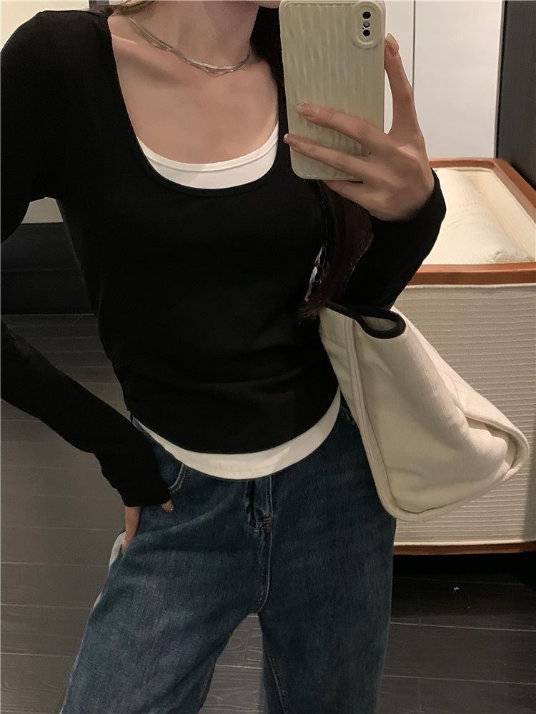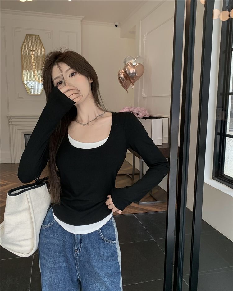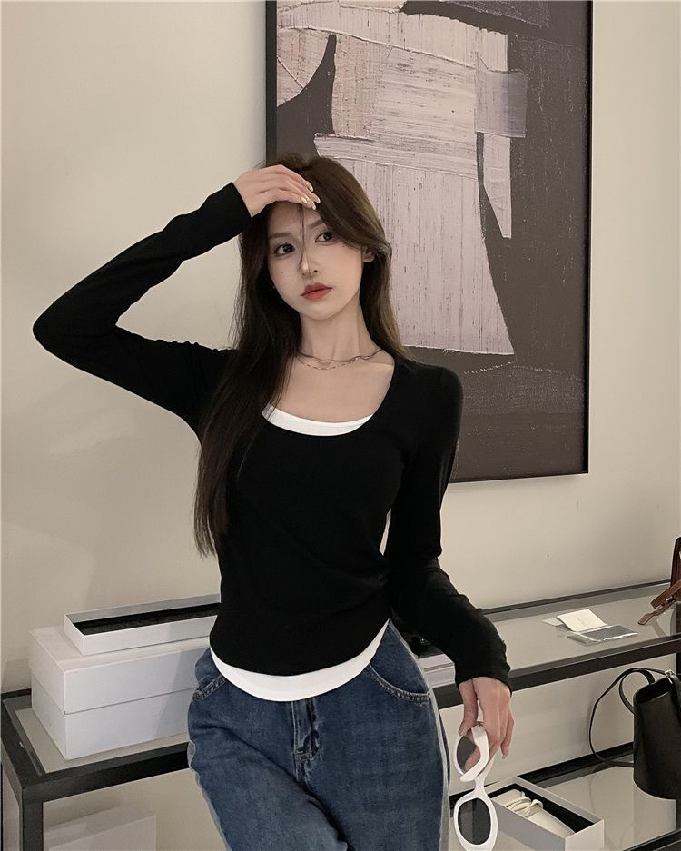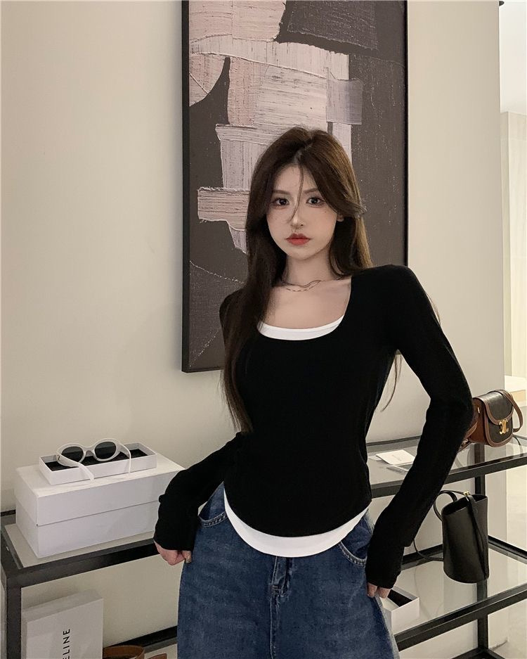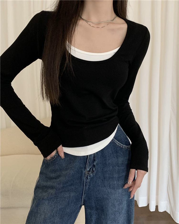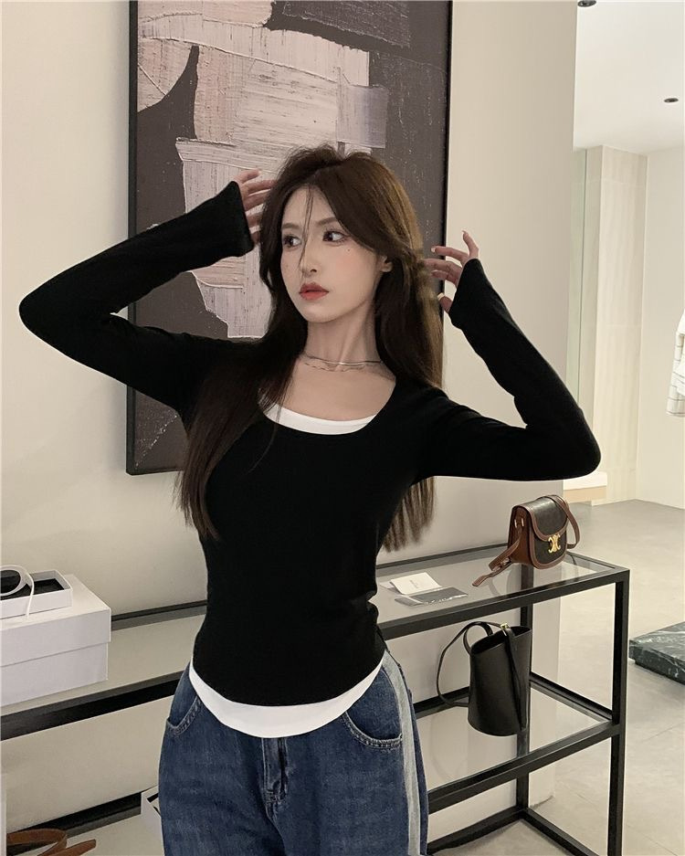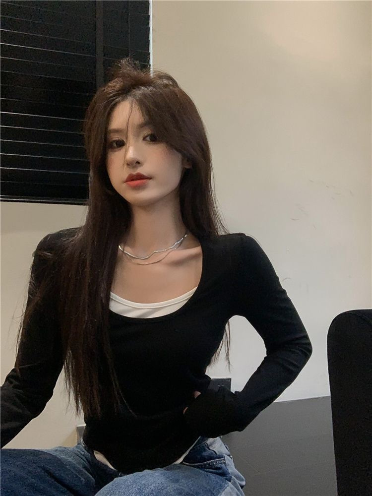 여성용 순수한 매력의 U넥 티셔츠, 슬림핏 디자인, 독특한 스타일, 이너웨어 또는 아우터웨어로 착용 가능한 투피스 디자인의 긴팔 상의스토어 가기
