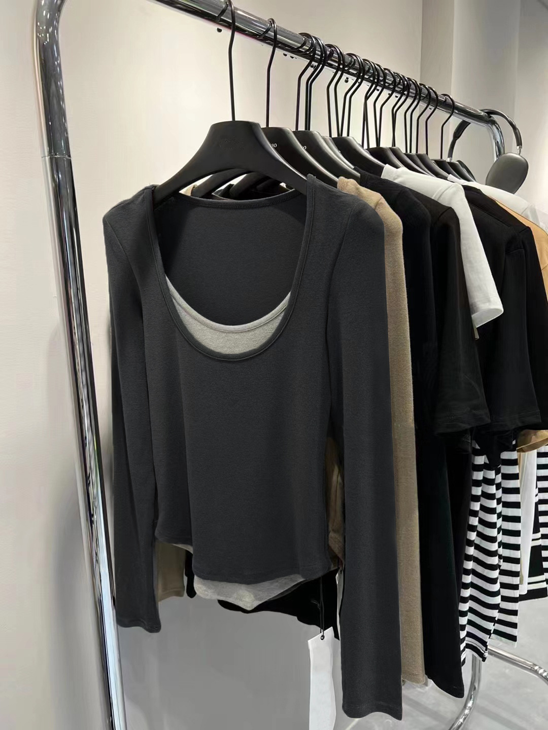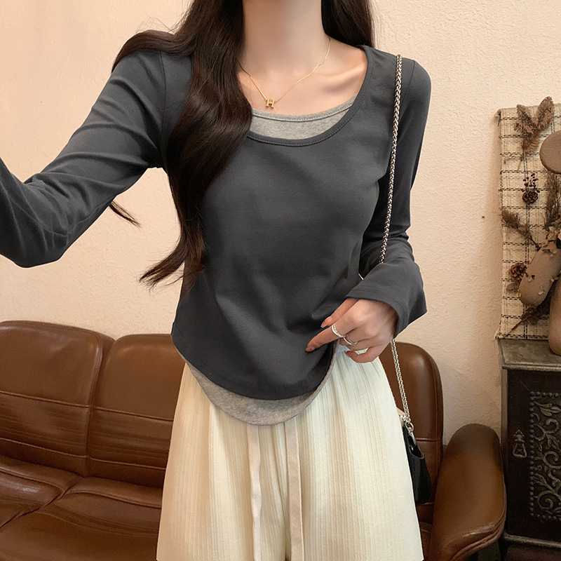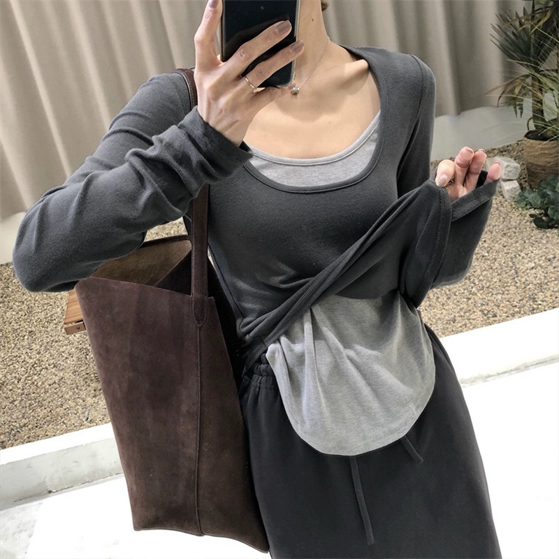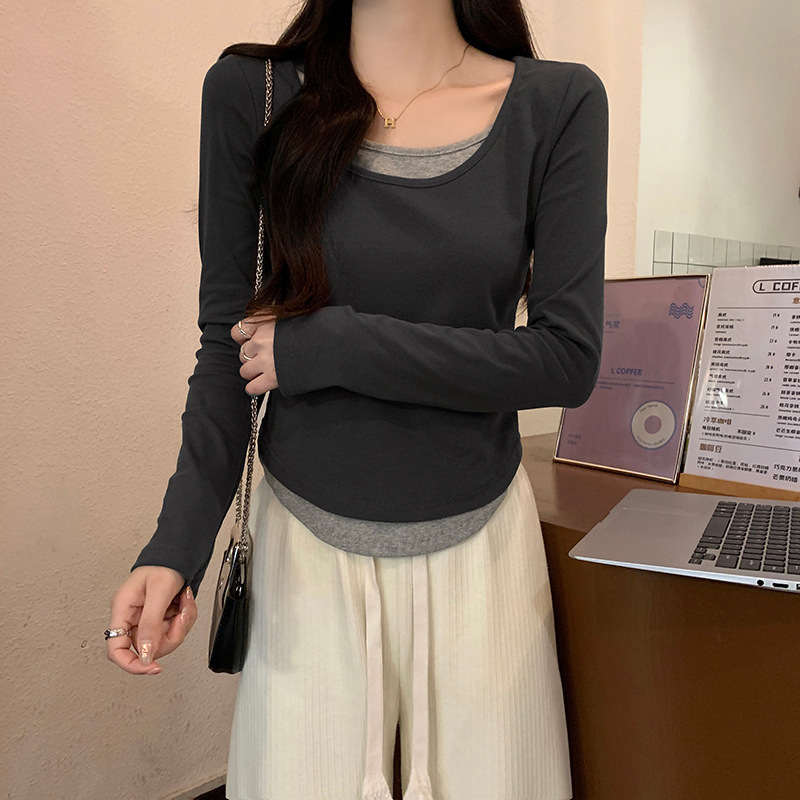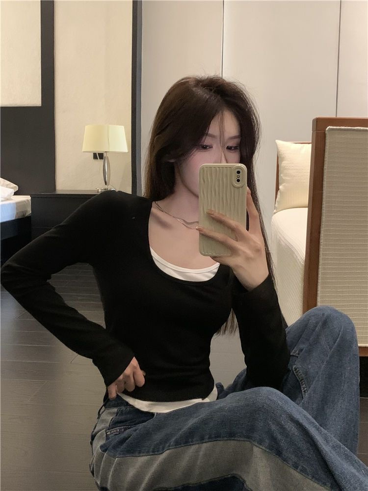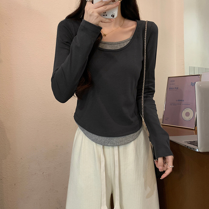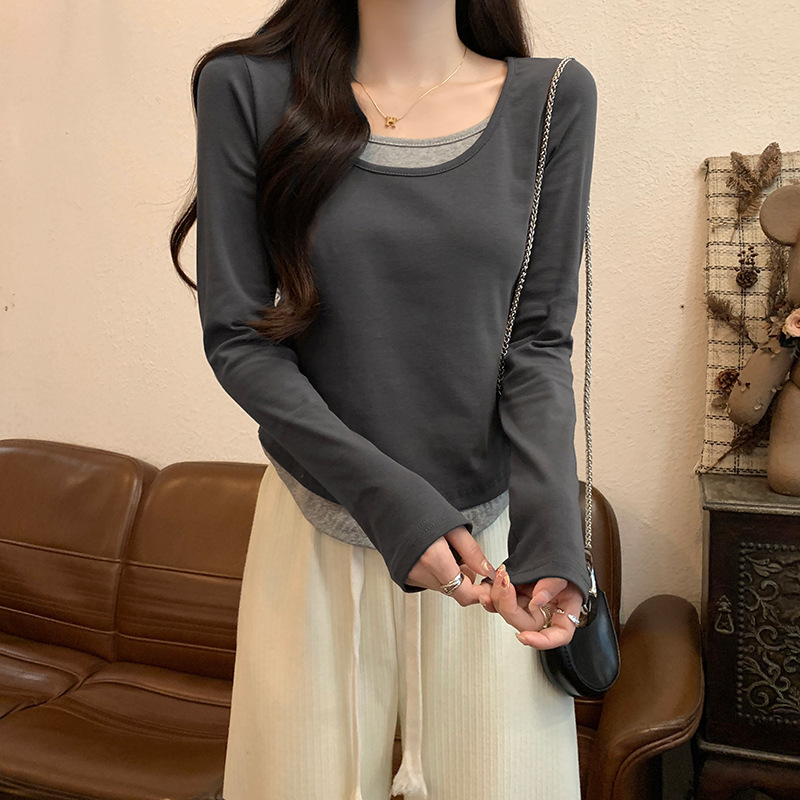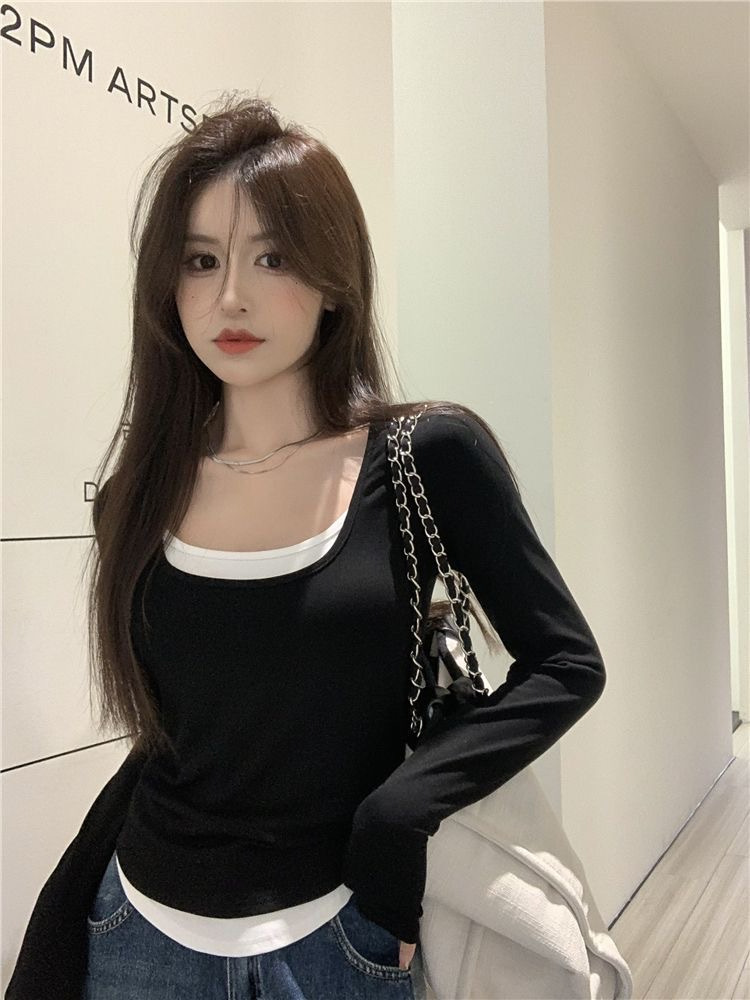 여성용 순수한 매력의 U넥 티셔츠, 슬림핏 디자인, 독특한 스타일, 이너웨어 또는 아우터웨어로 착용 가능한 투피스 디자인의 긴팔 상의스토어 가기