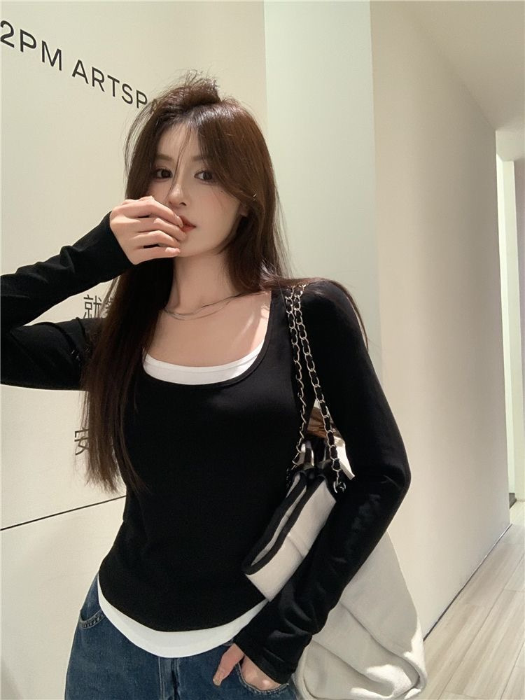 여성용 순수한 매력의 U넥 티셔츠, 슬림핏 디자인, 독특한 스타일, 이너웨어 또는 아우터웨어로 착용 가능한 투피스 디자인의 긴팔 상의