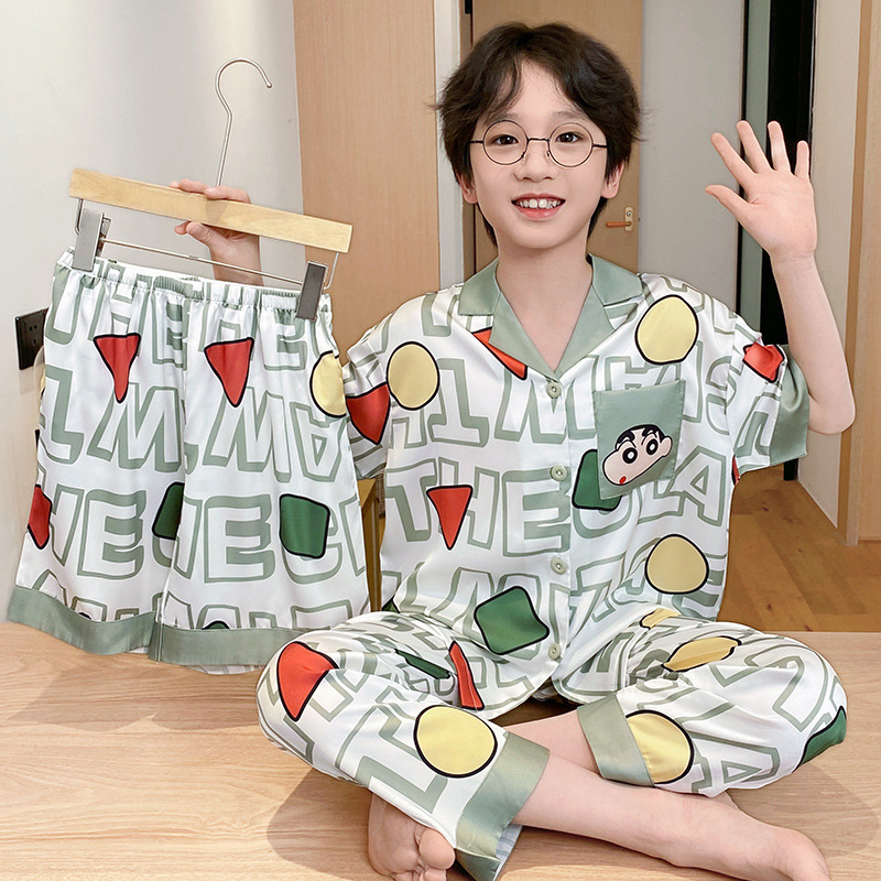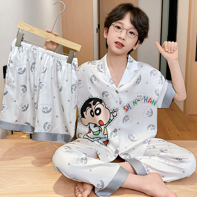 봄 여름 얼음 실크 시원한 소년 잠옷 반팔 반바지 바지 3 피스 양복 카디건 대형, 중형 및 소형 아동복