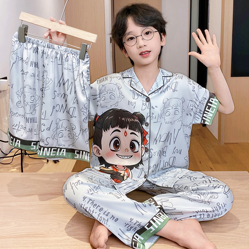 봄 여름 얼음 실크 시원한 소년 잠옷 반팔 반바지 바지 3 피스 양복 카디건 대형, 중형 및 소형 아동복스토어 가기