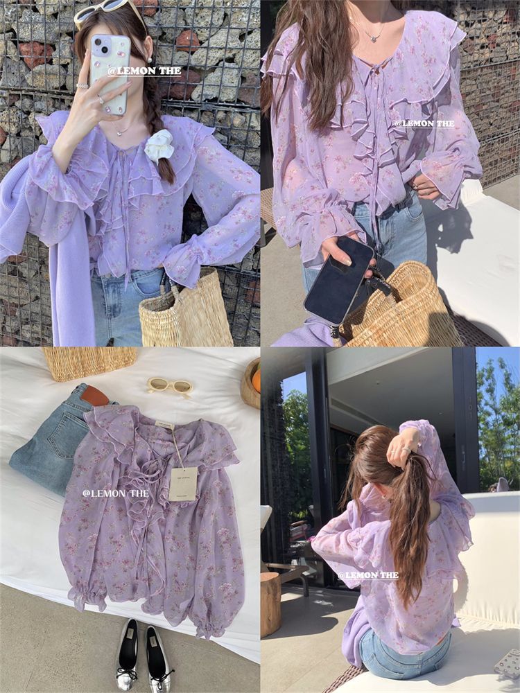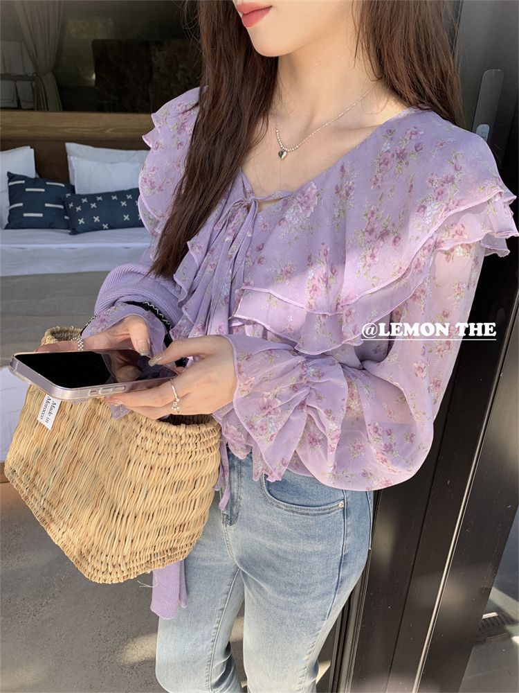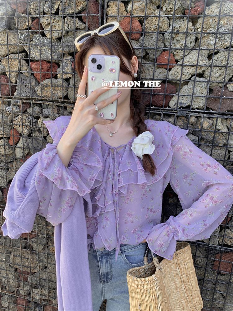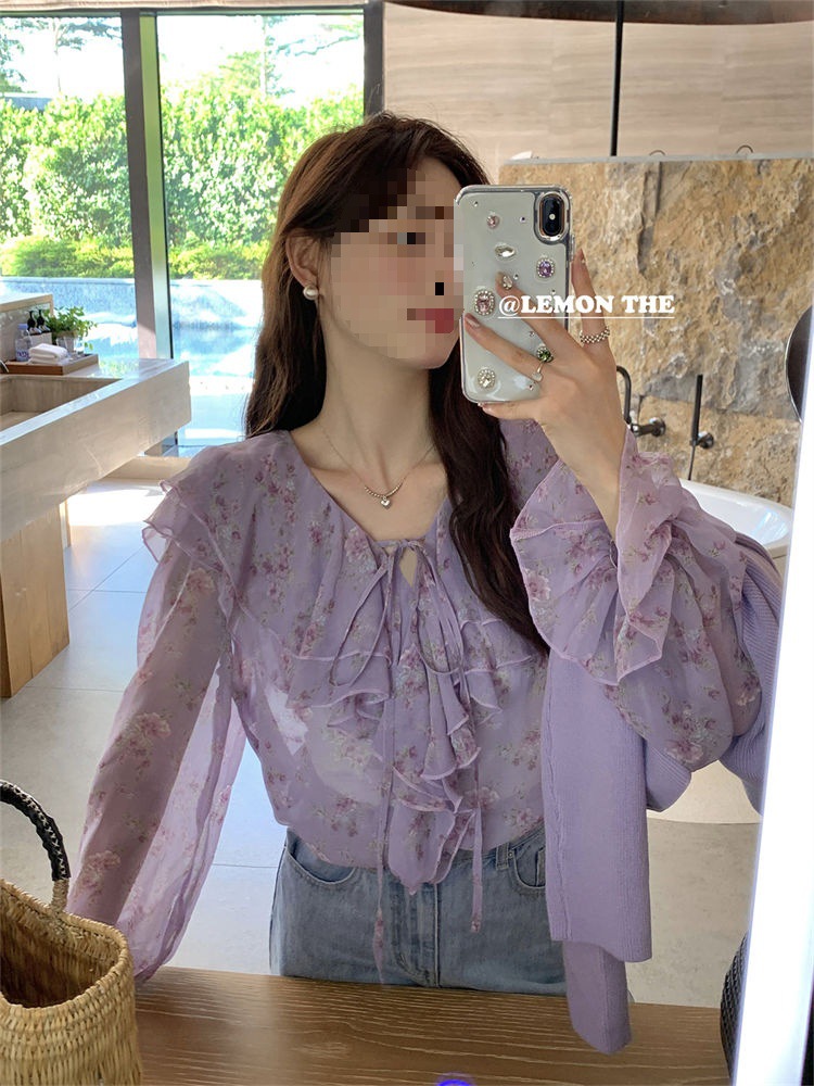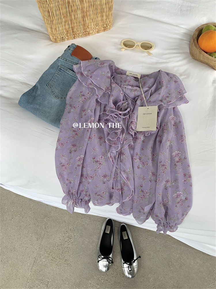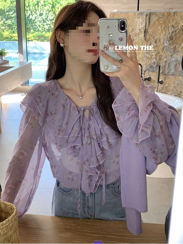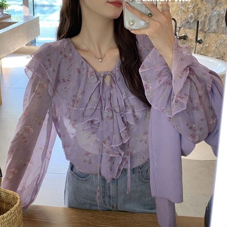 여성용 러플 플로럴 쉬폰 셔츠, 니치 보우 스트랩 셔츠, 프렌치 스타일의 상큼하고 달콤한 탑스토어 가기